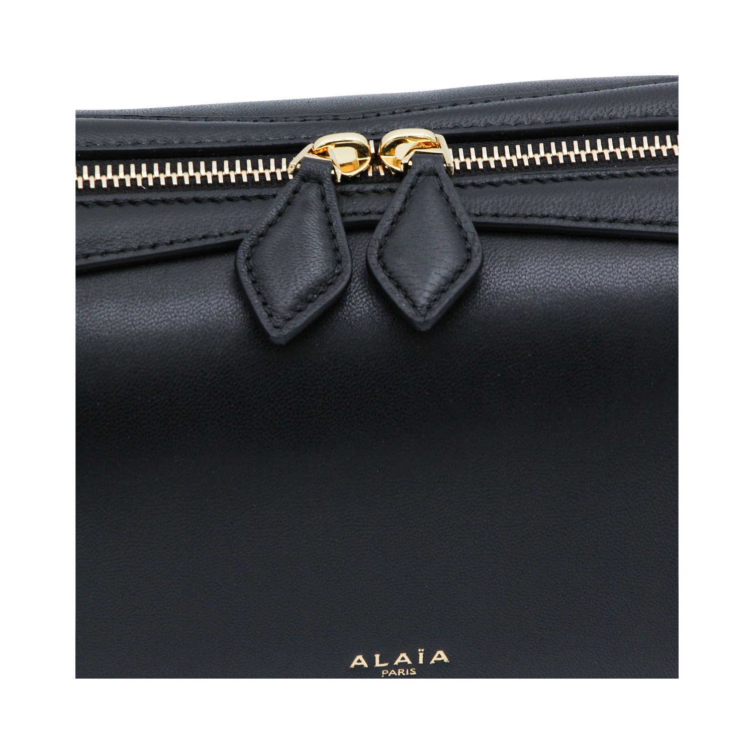 Black leather Le Teckel Medium shoulder bag from Alaia featuring iconic elongated shape, top handles with decorative laces, double zip closure, removable mirror in the internal pocket and embossed logo.