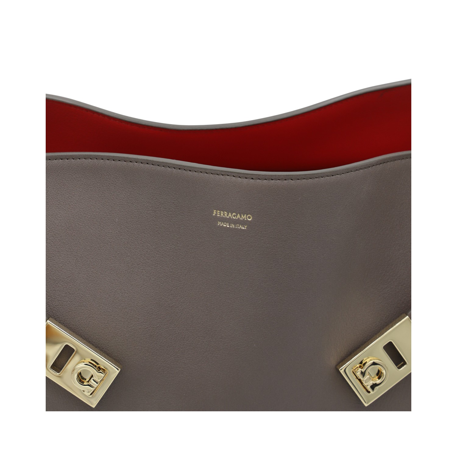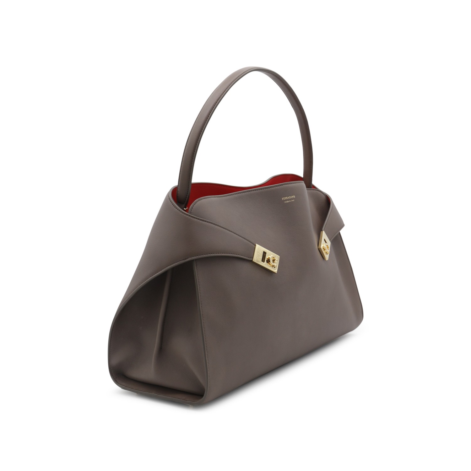 Brown calf leather HUG M top handle bag from Ferragamo featuring top handle, frontal logo,gold tone hardware and pocket.