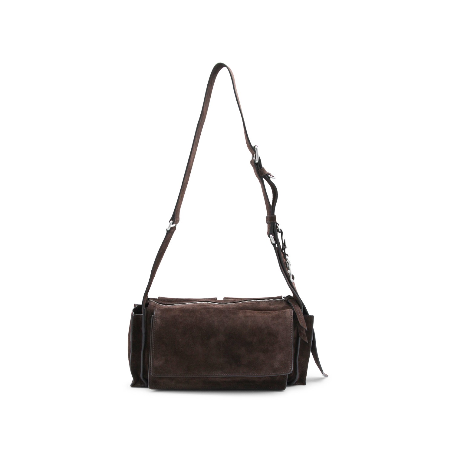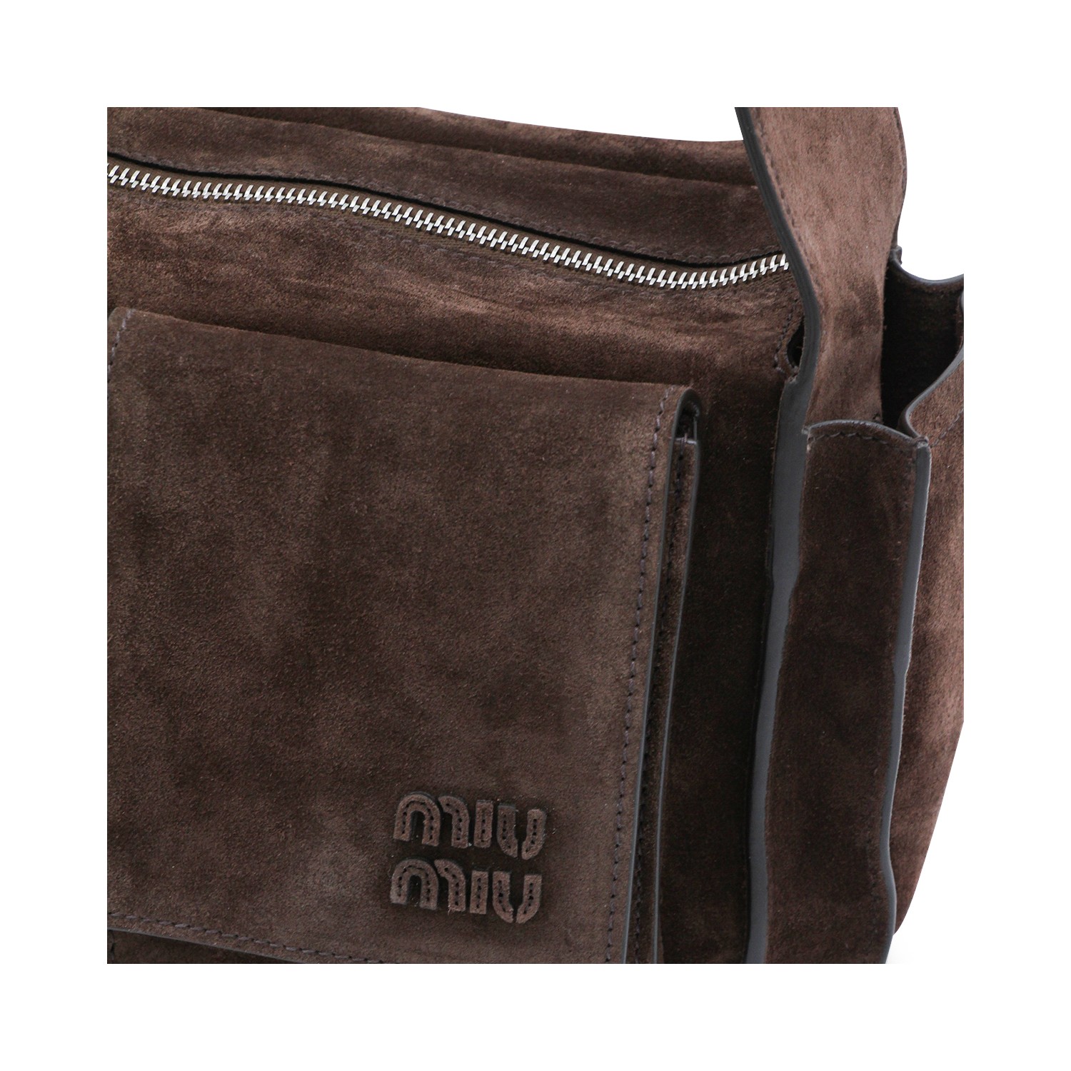 Brown leather shoulder bag from Miu Miu featuring rectangular shape, suede, frontal pockets, engraved logo, adjustable shoulder strap, zip fastening and main compartment.