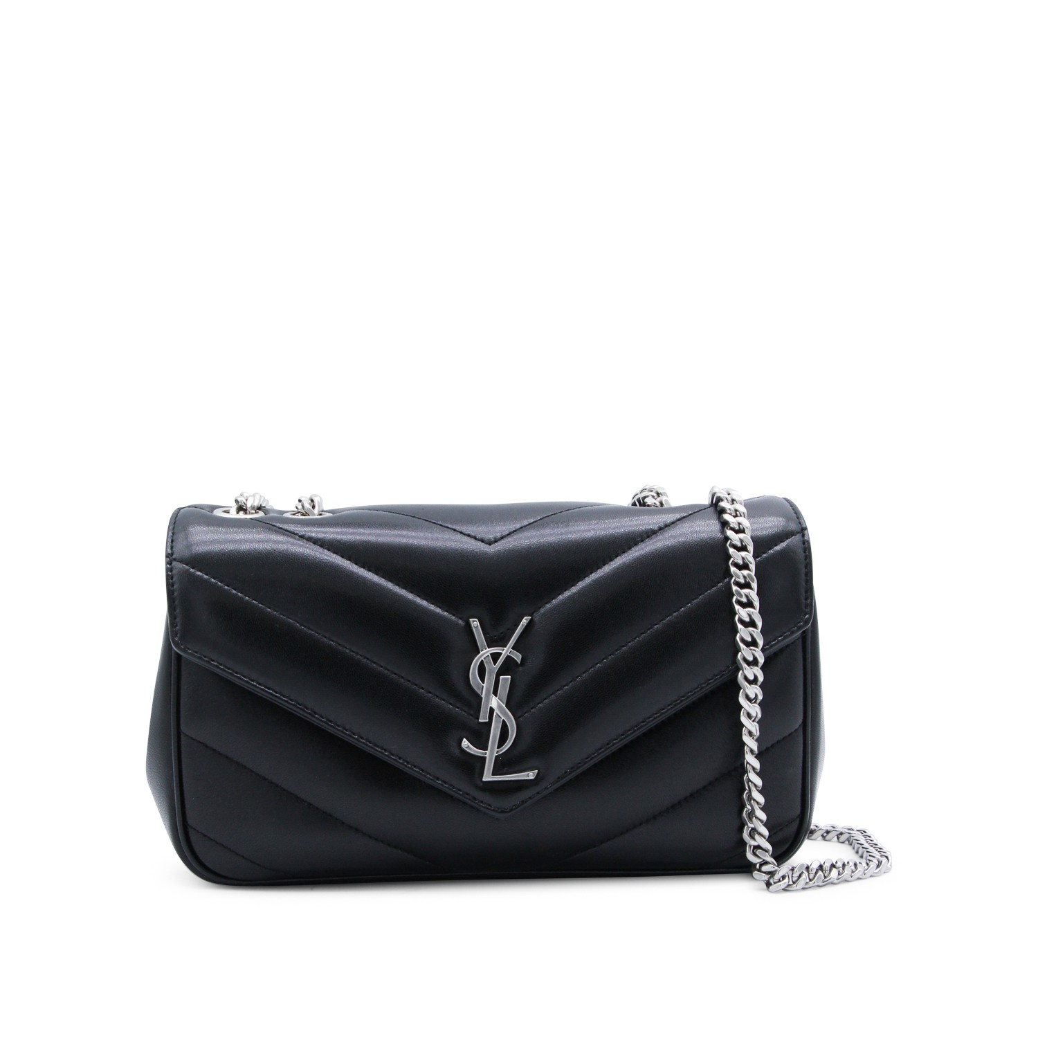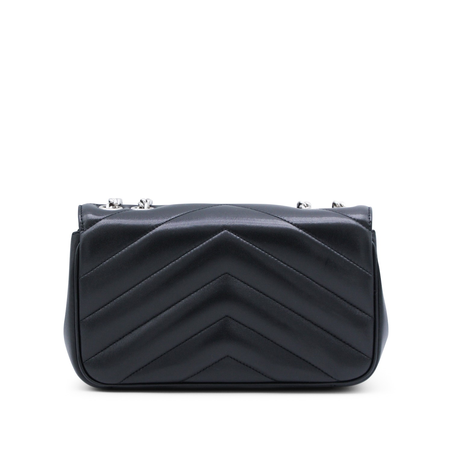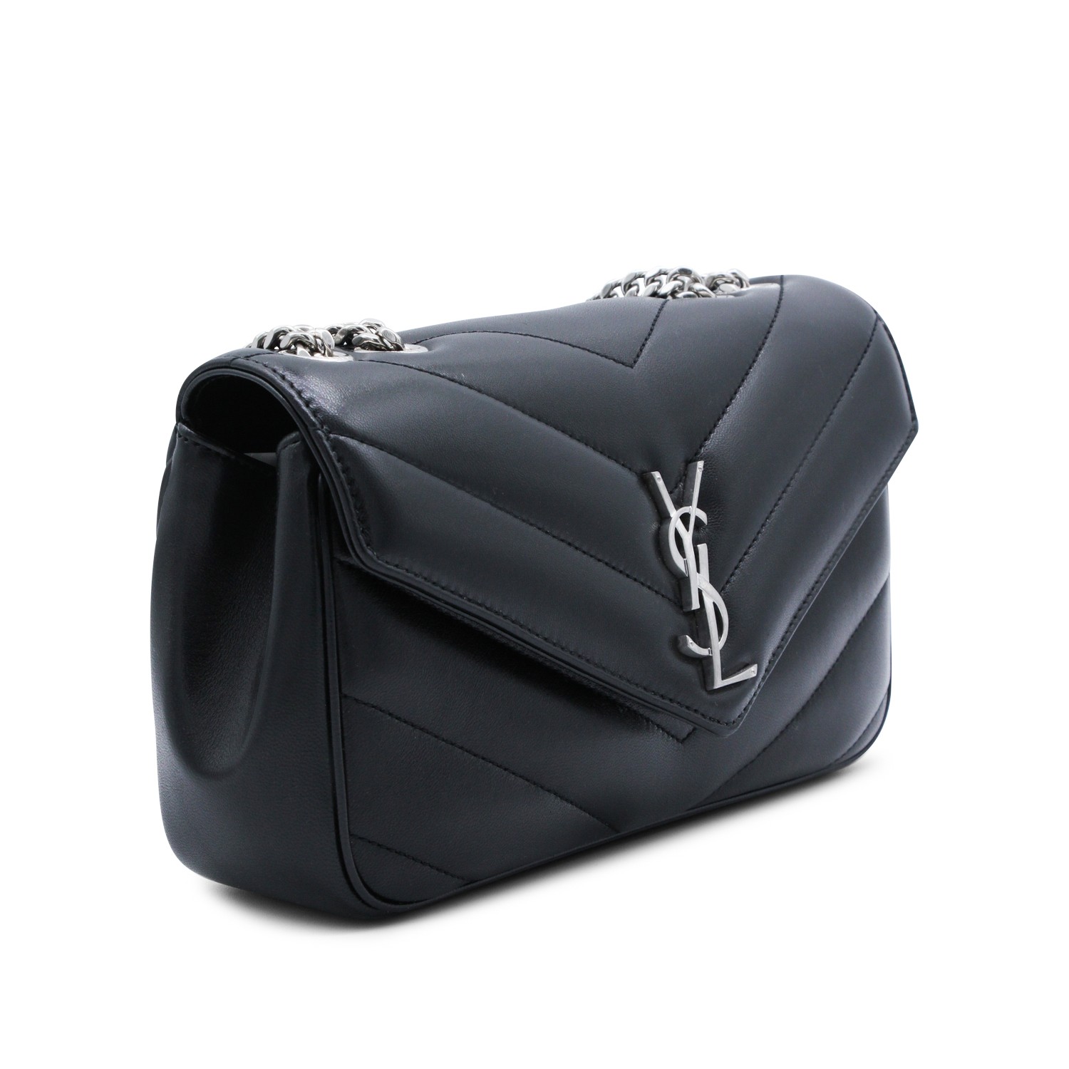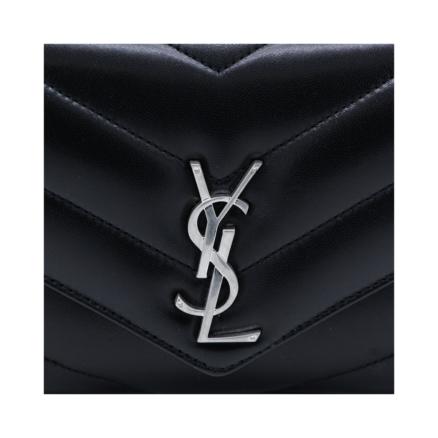 Black leather LouLou small top handle bag from Saint Laurent featuring rectangular shape, quilted stitching, frontal logo, silver tone hardware, snap button closure and main compartment.