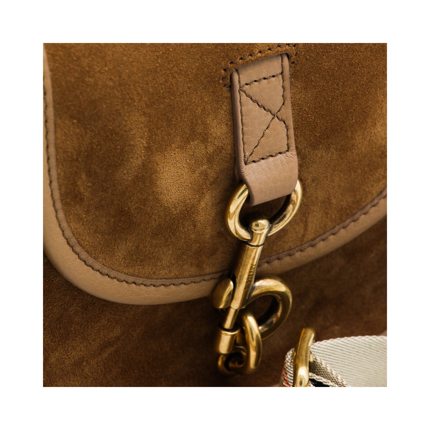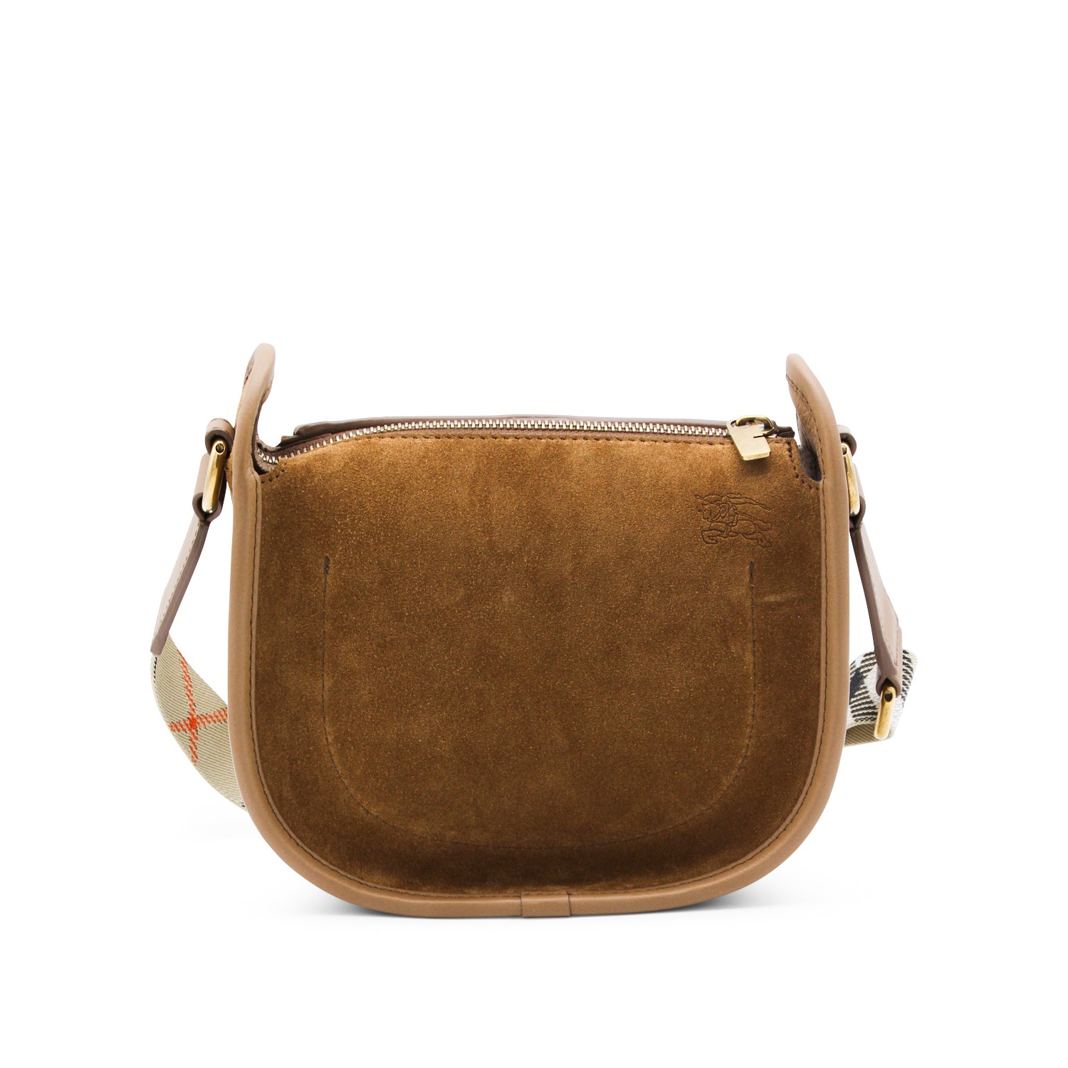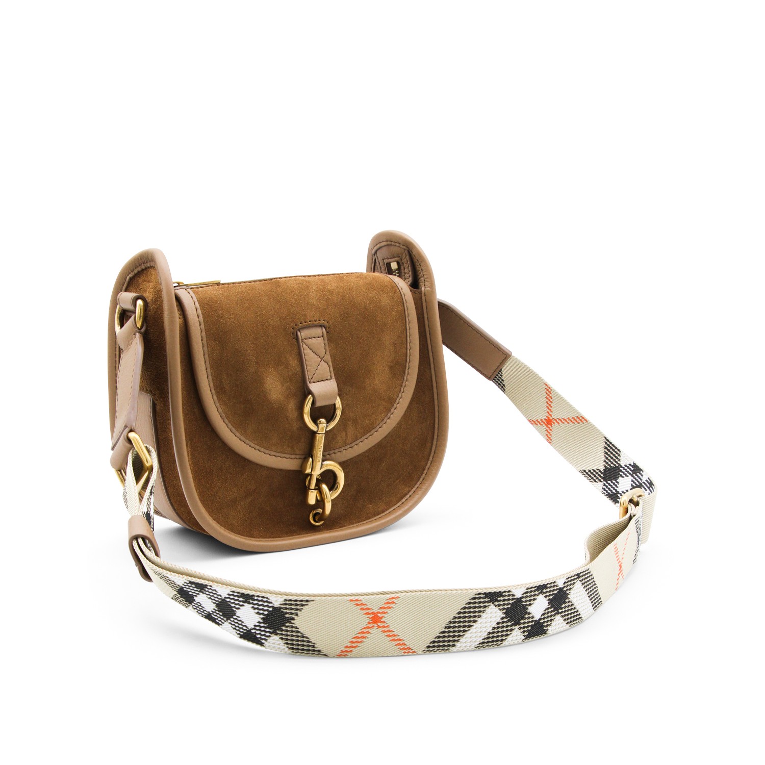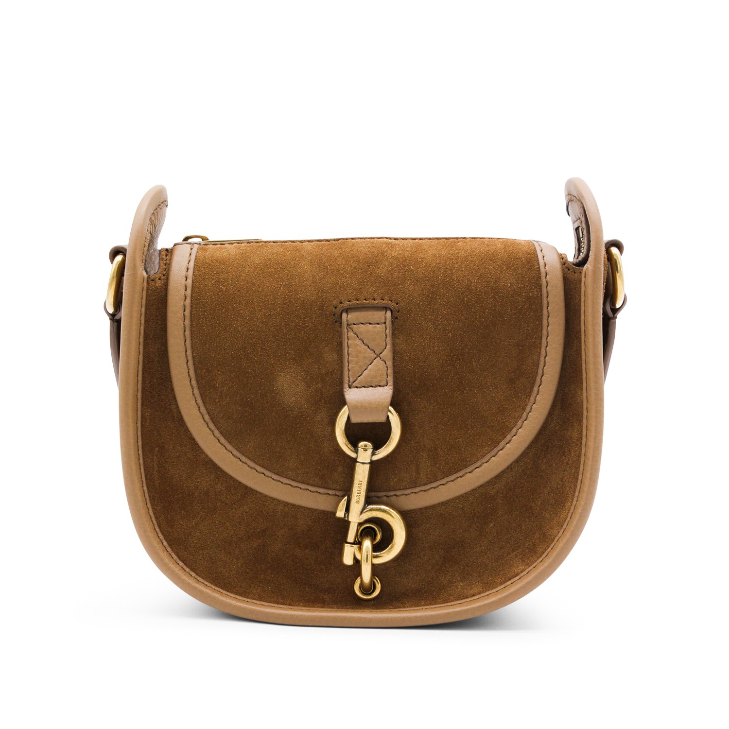 Brown leather crossbody bag from Burberry featuring foldover top with buckle fastening, suede, gold tone hardware, adjsutable shoulder strap and main compartment.