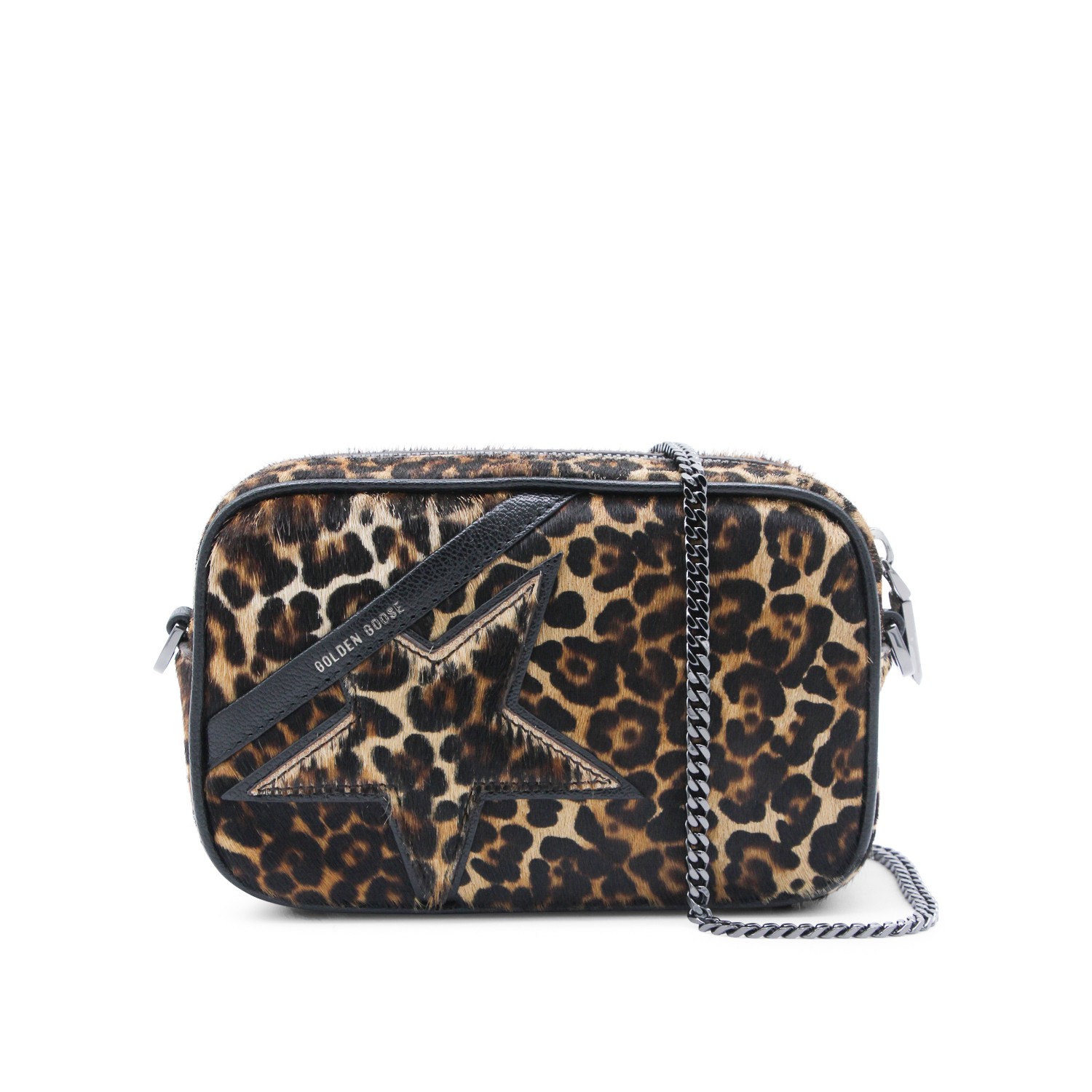 Leopard leather crossbody bag from Golden Goose featuring rectangular shape, chain link strao, leopard pattern, zip fastening and main compartment.