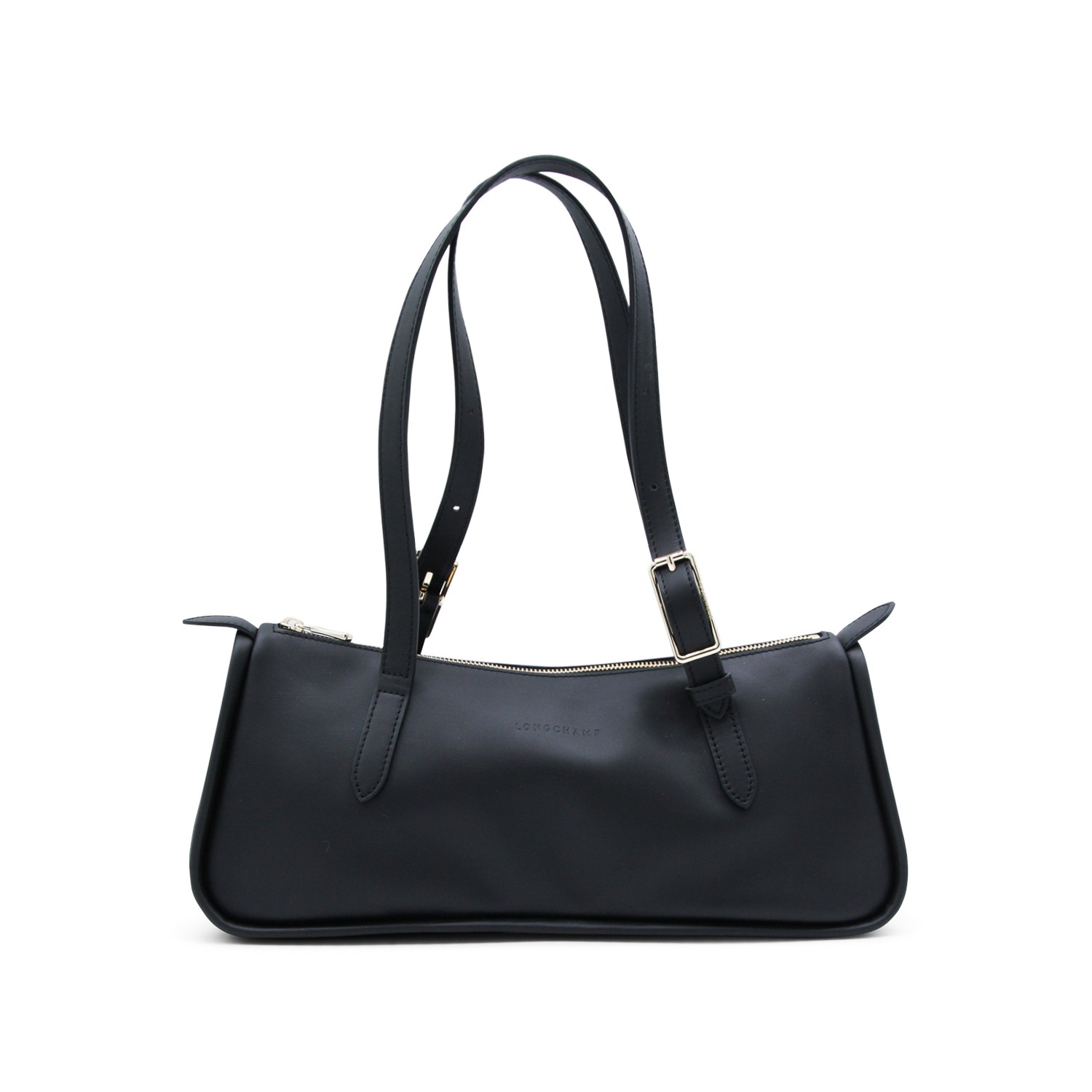 Black leather Long Sac shoulder bag from Longchamp featuring top handles, zip fastening, silver tone hardware and embossed logo.