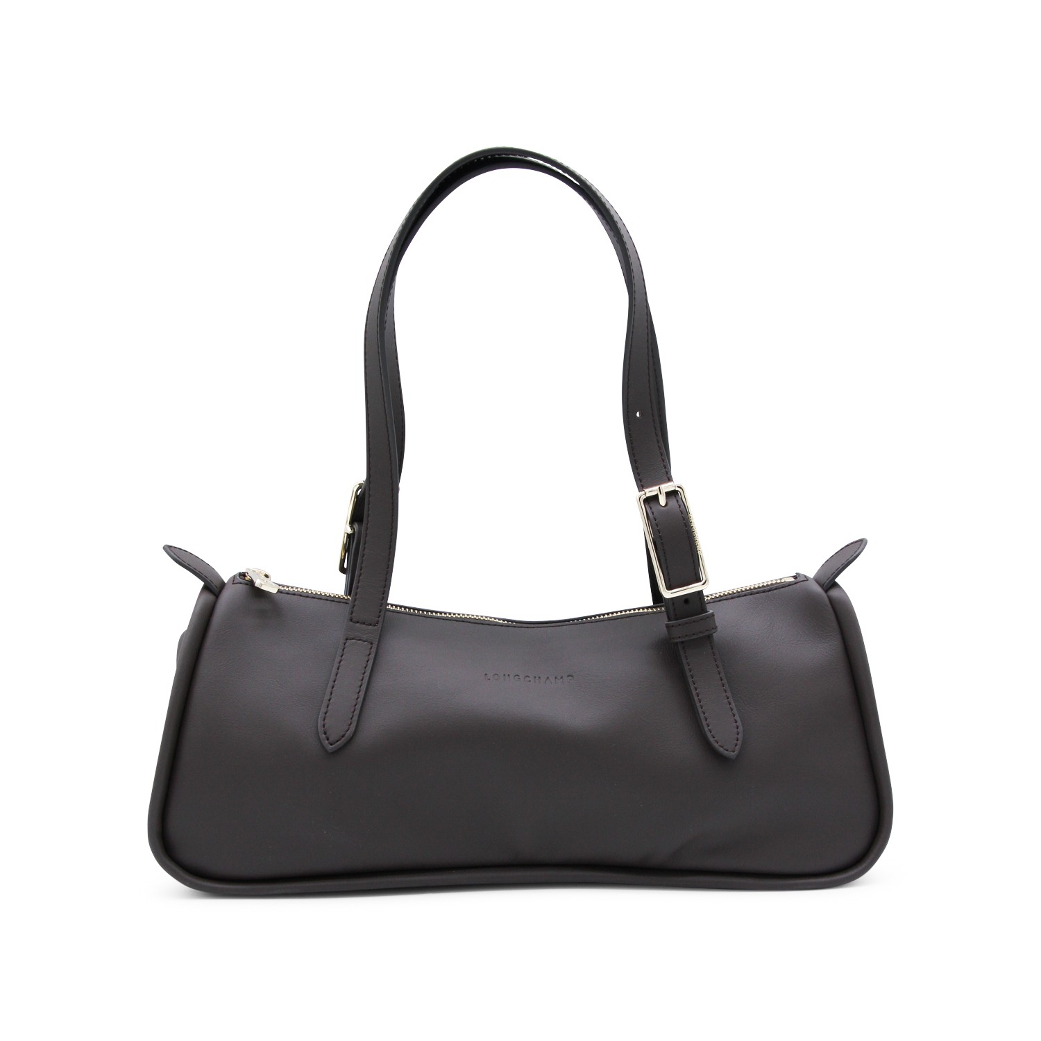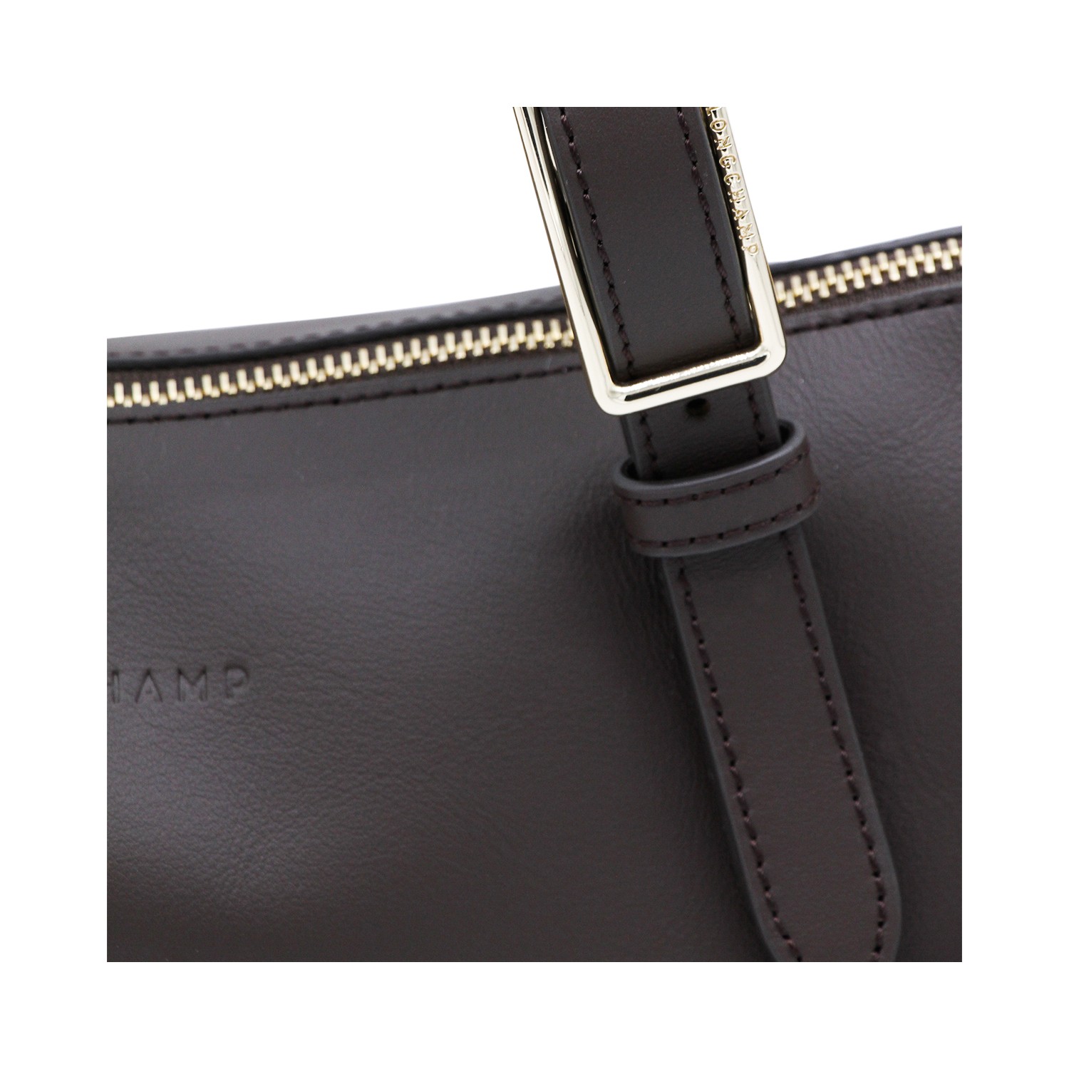 Dark brown leather Long Sac shoulder bag from Longchamp featuring top handles, zip fastening, silver tone hardware and embossed logo.
