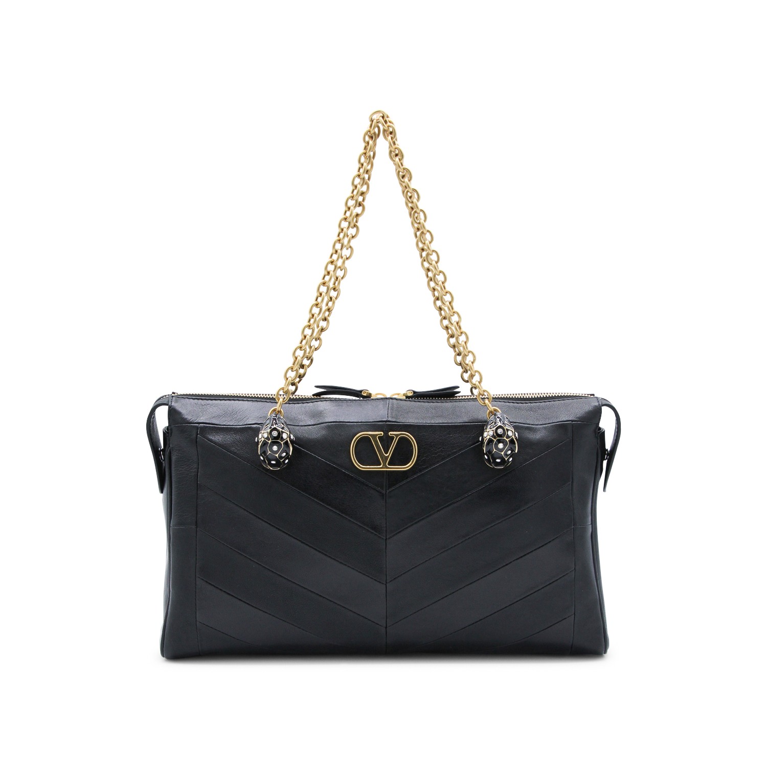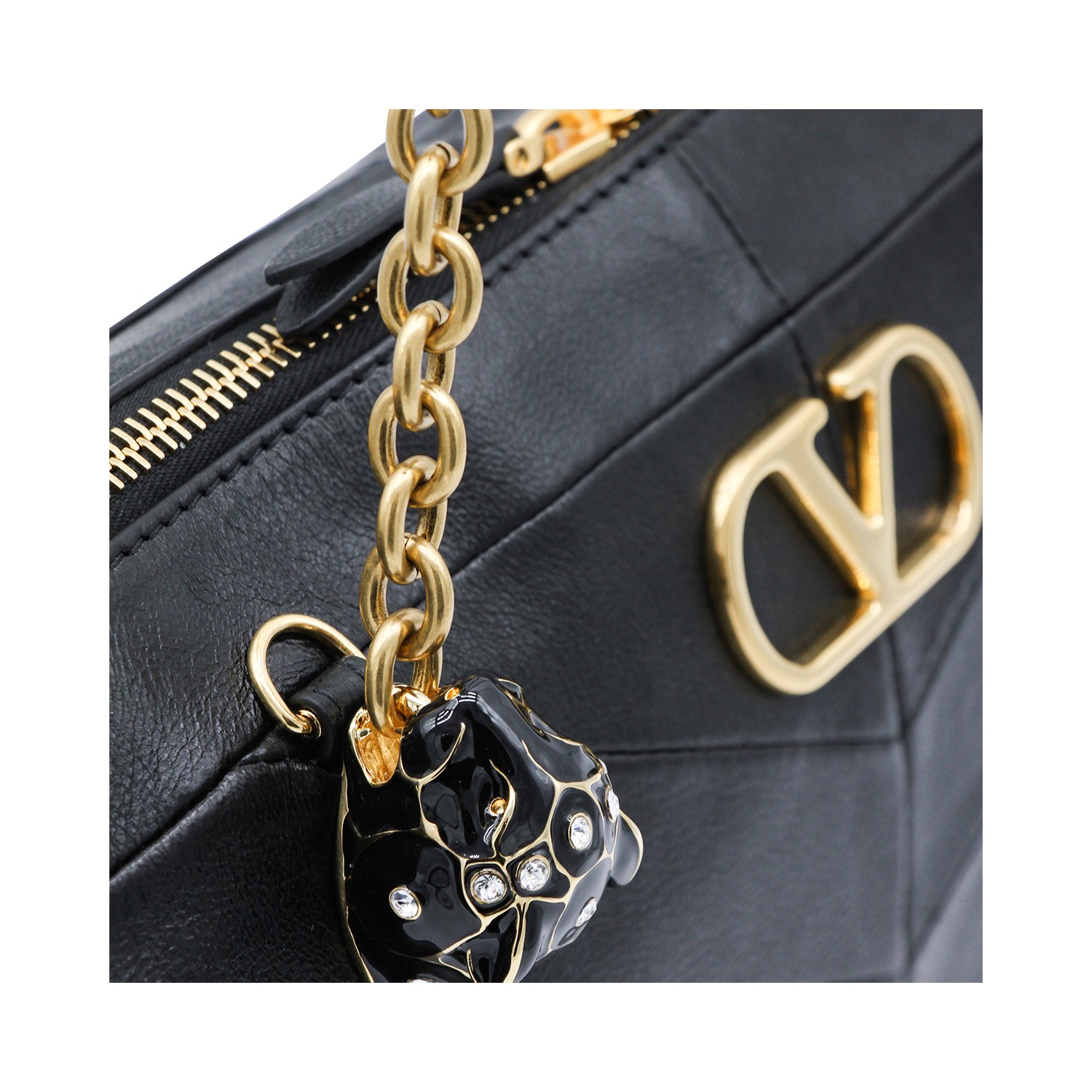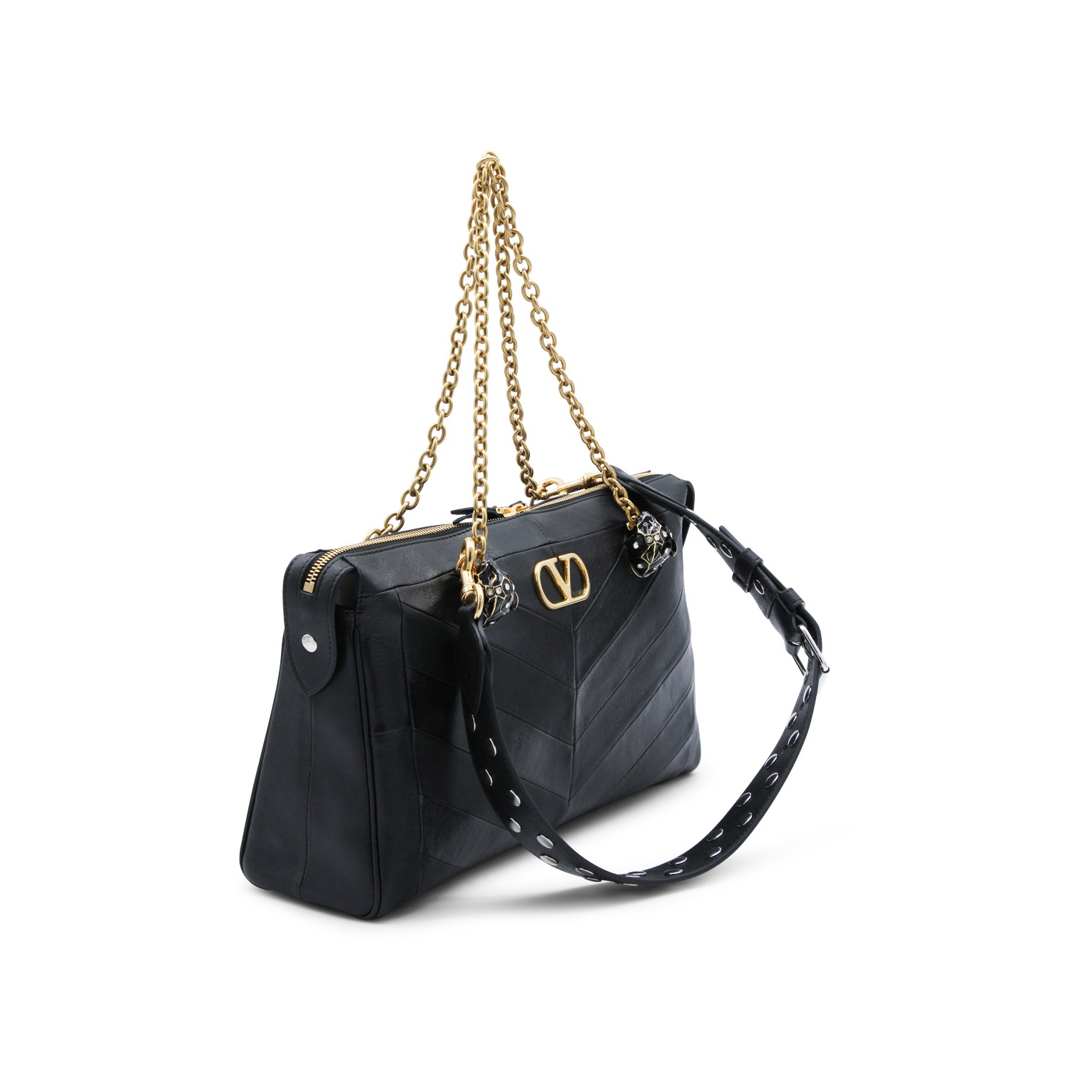 Black leather Panthea shoulder bag from Valentino Garavani featuring chain, gold tone hardware, frontal logo patch, double zip fastening, lucid finishes and inside pocket.