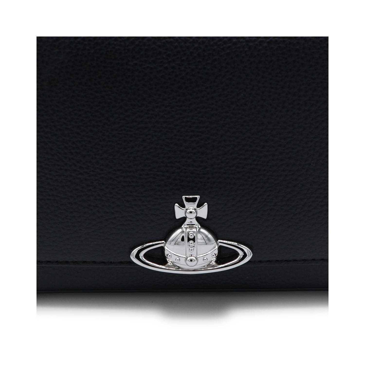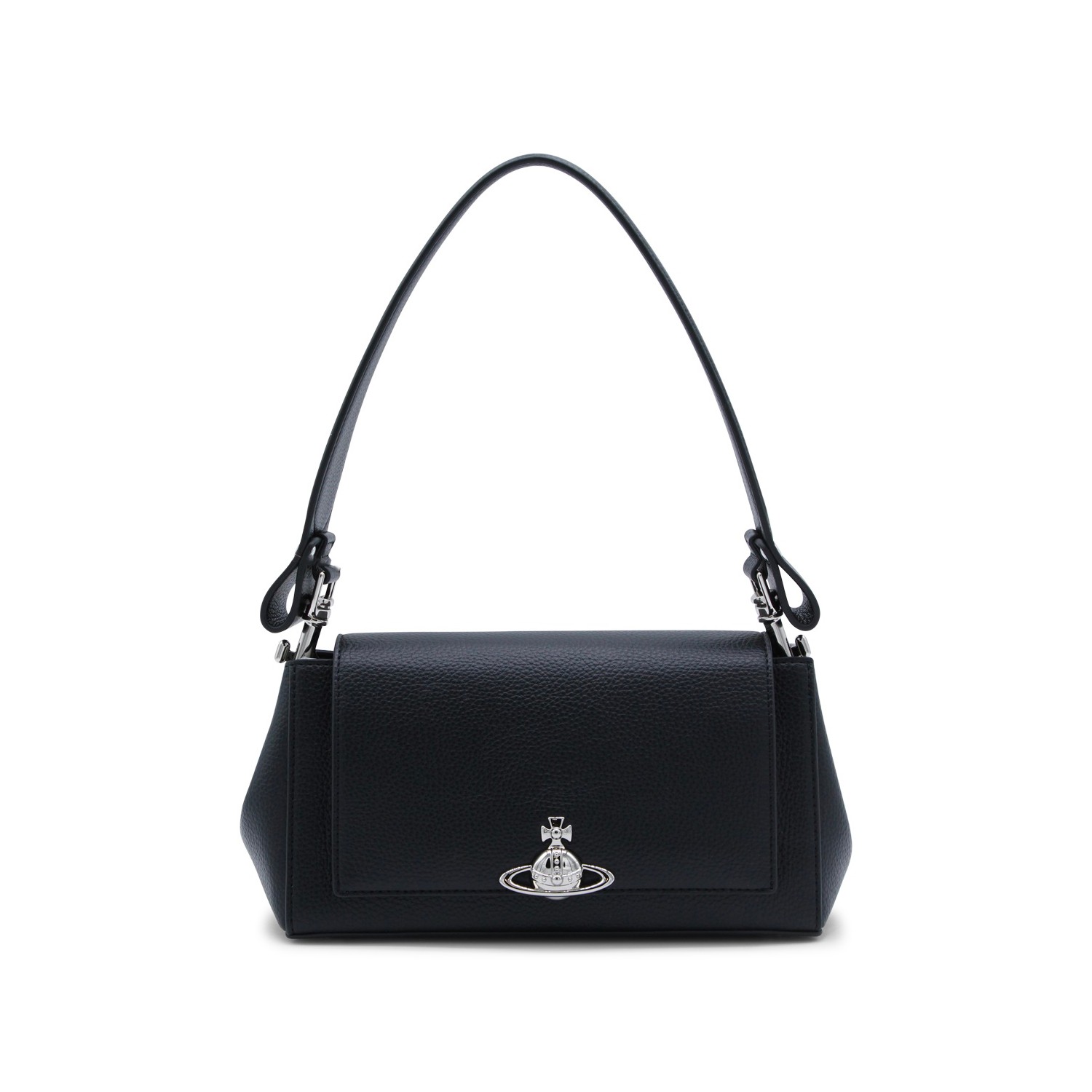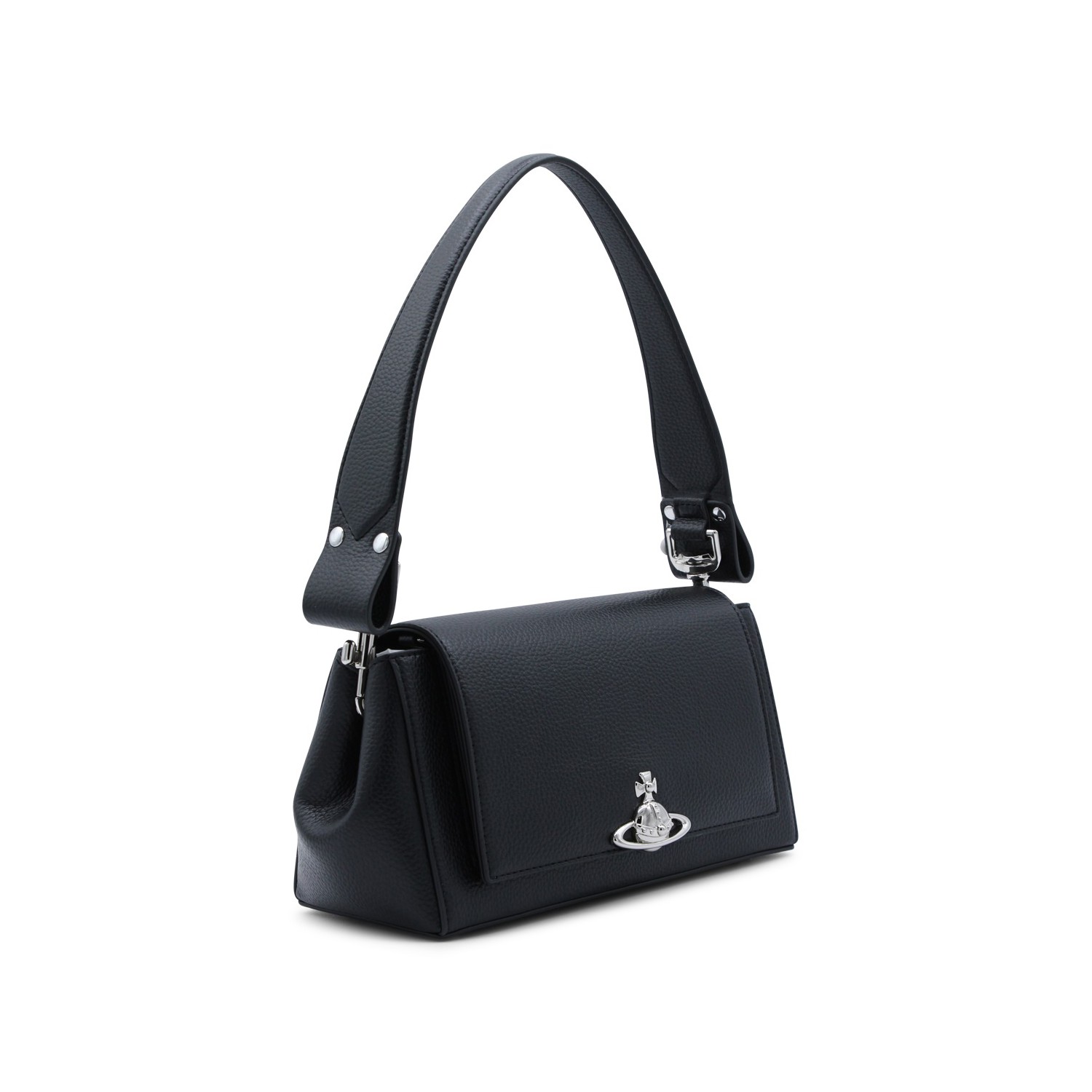 Black Hazel shoulder bag from Vivienne Westwood featuring top removable handle, silver tone hardware, magnetic flap closure, metal Orb logo and main compartment.