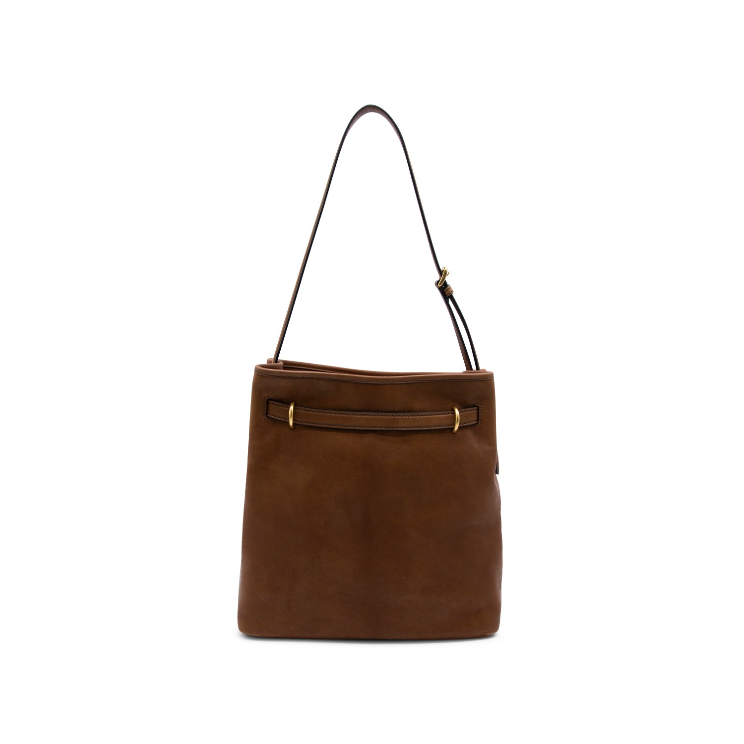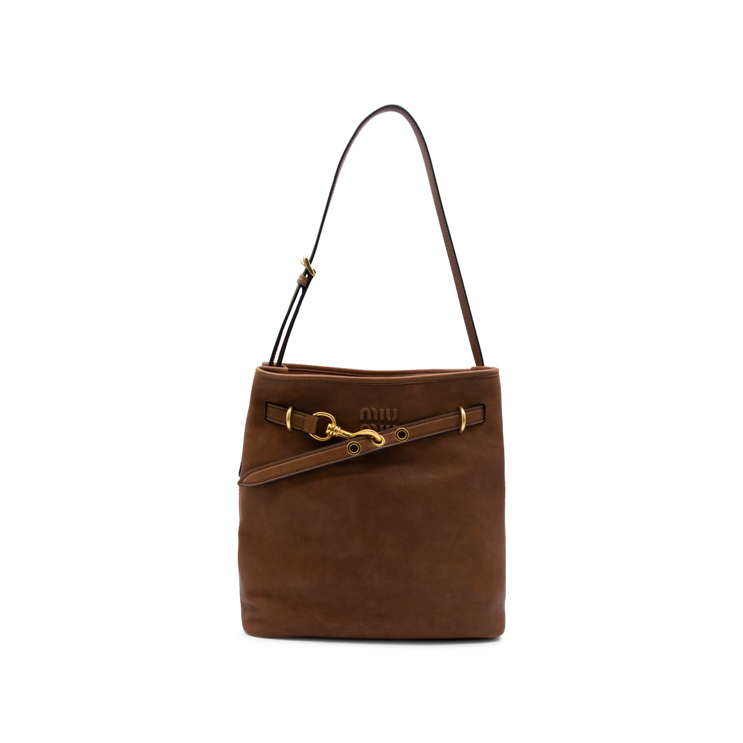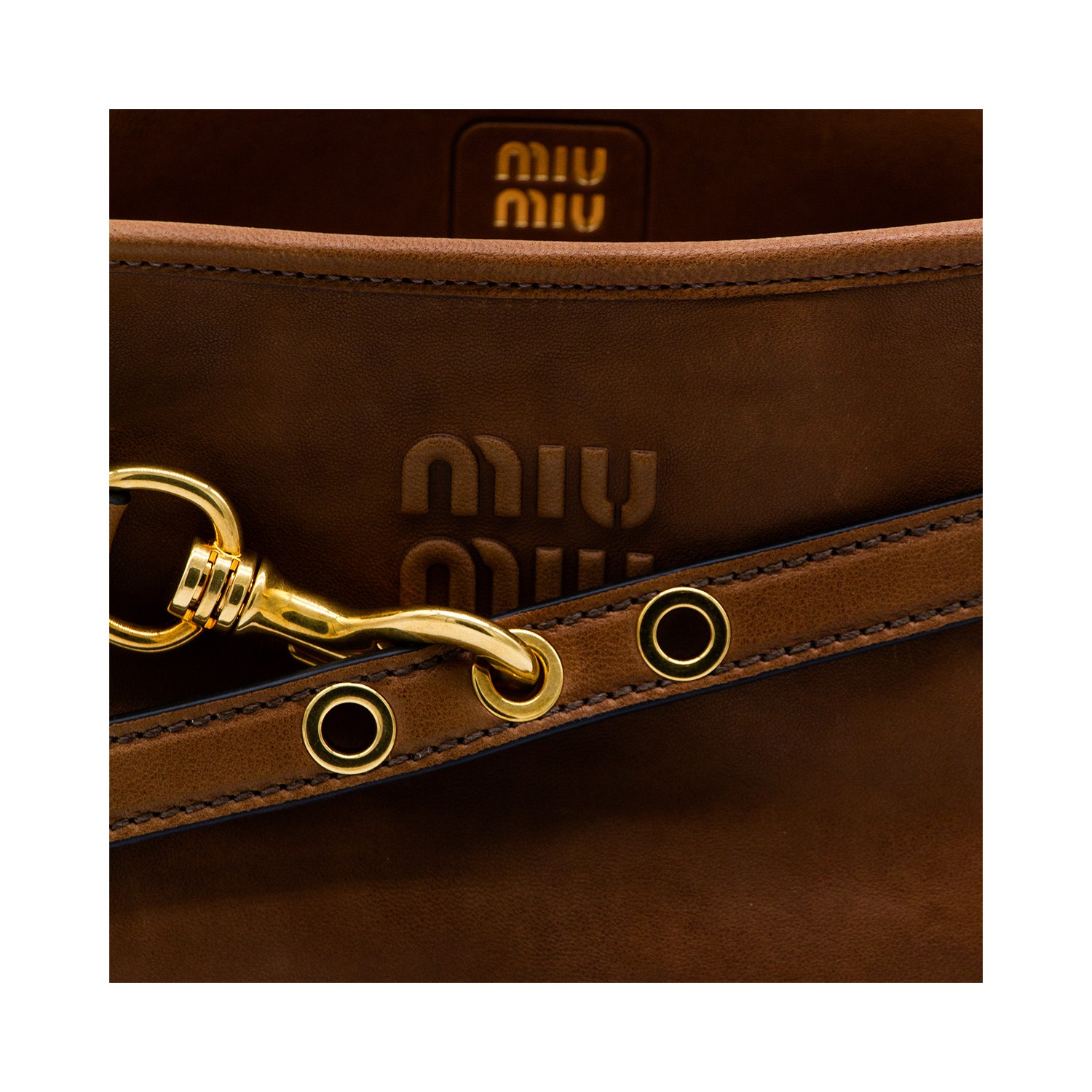 Dark brown leather shoulder bag from Miu Miu featuring top handle, upper fastening, frontal buckle decoration, logo and gold tone hardware.