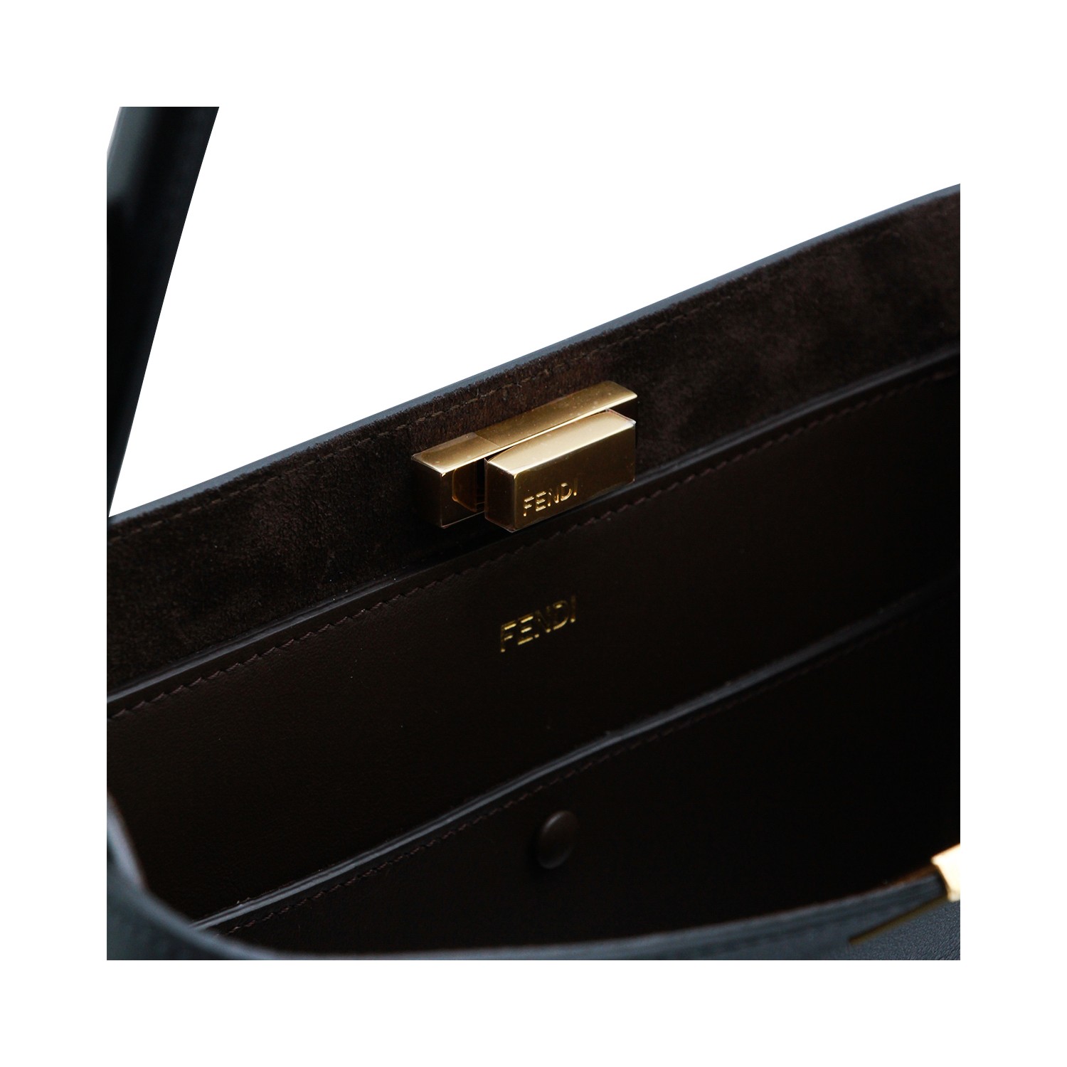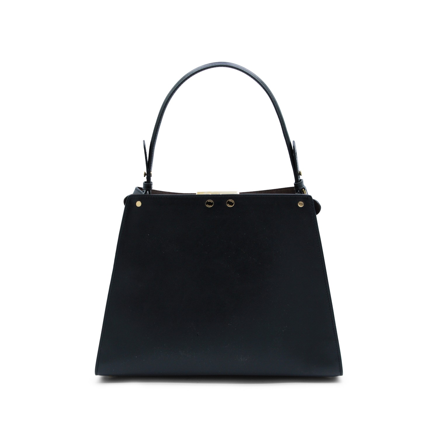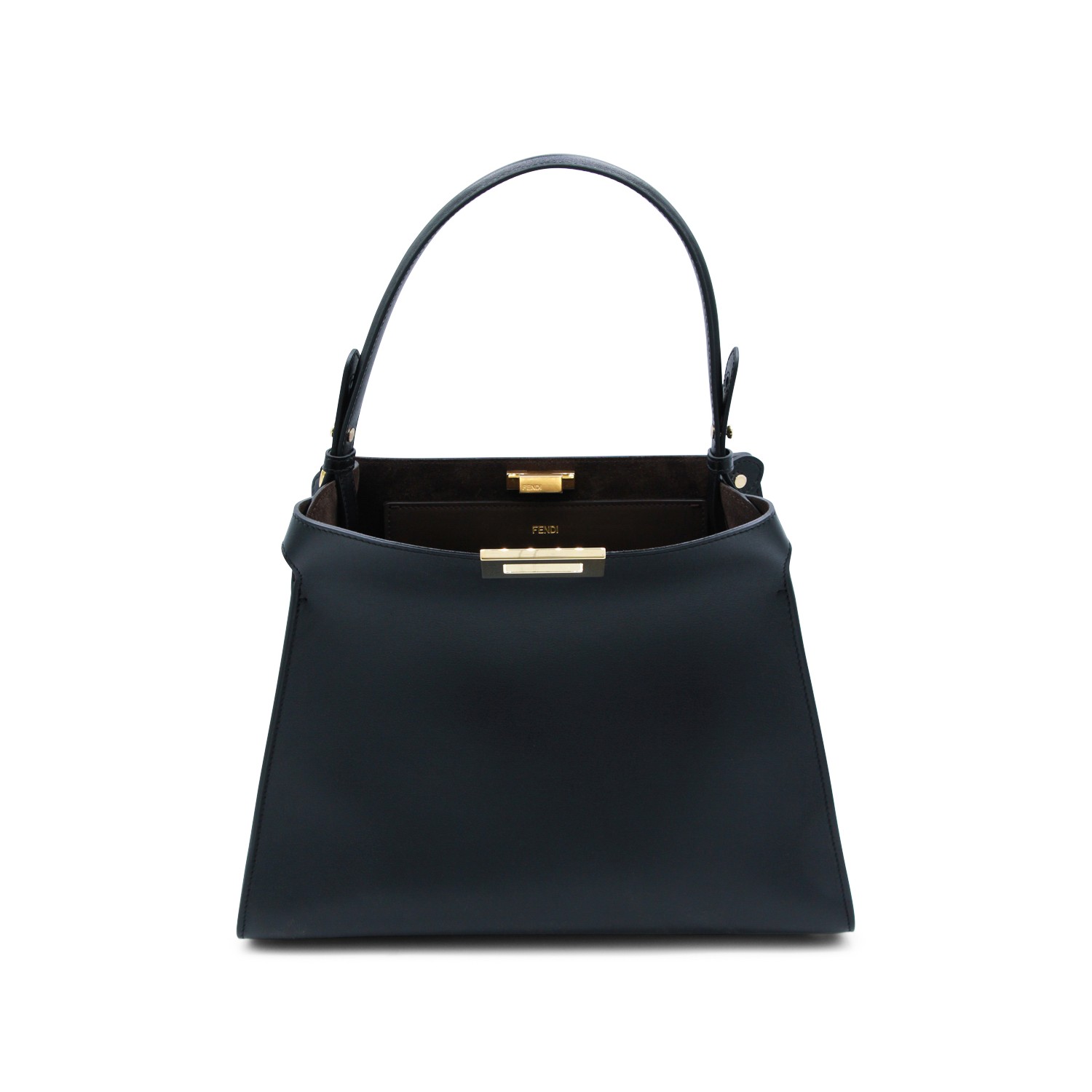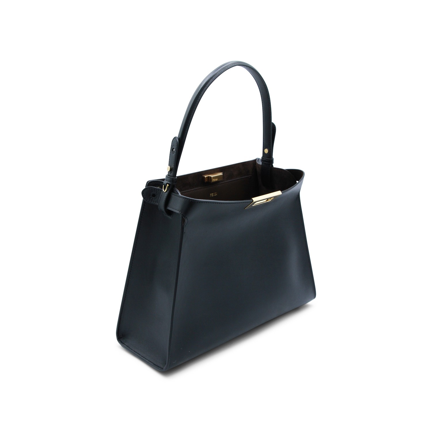 Black and dark brown leather Way large shoulder bag from Fendi featuring top handle, frontal fastening, inside blue suede, gold tone hardware, removable strap and pocket.