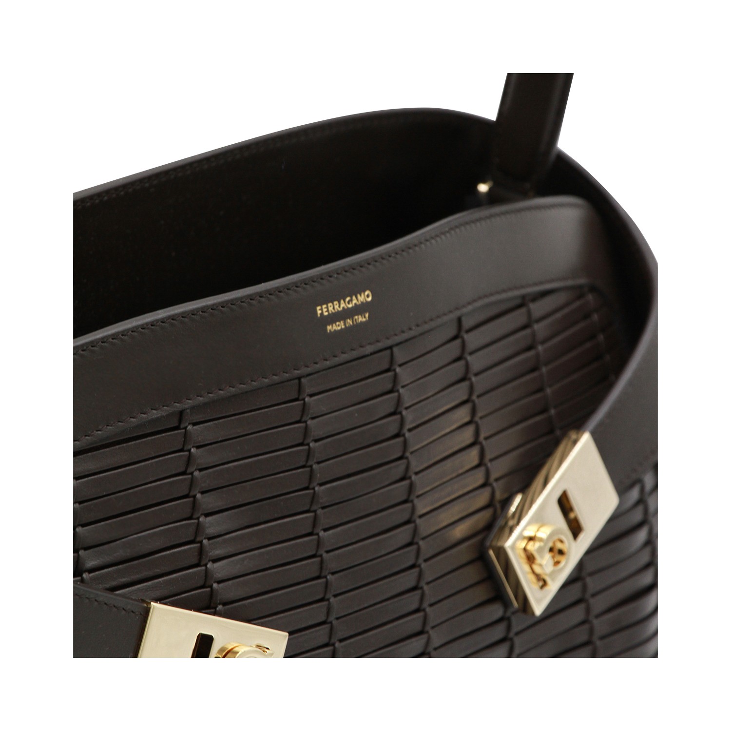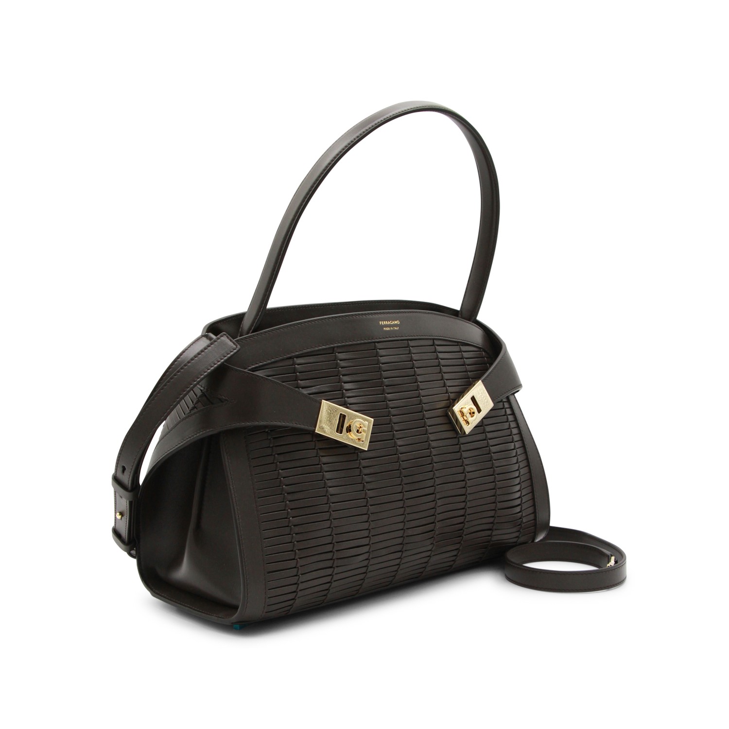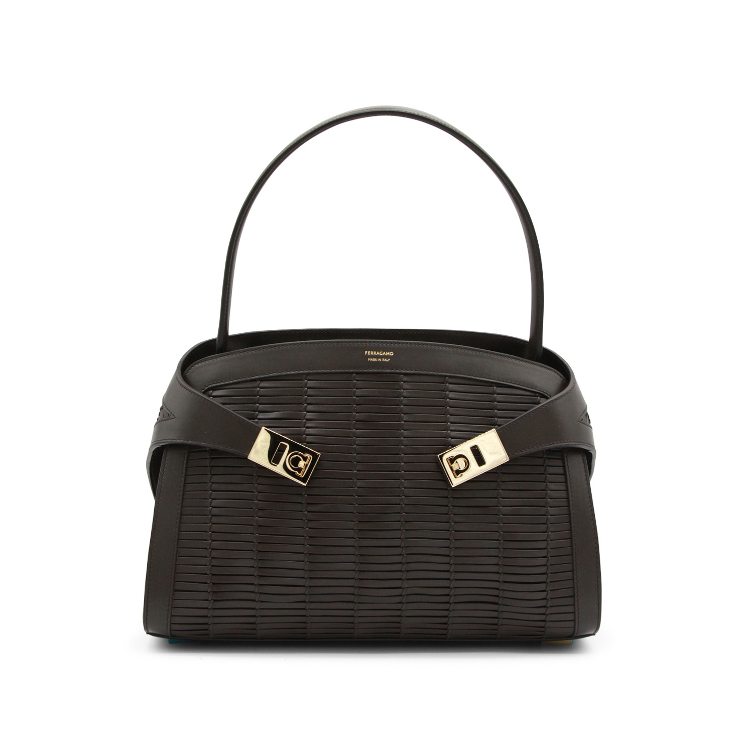 Brown leather Hug shoulder bag from Ferragamo featuring single top handle, logo, gold tone metal hardware, bukles, upper closure and main compartment.