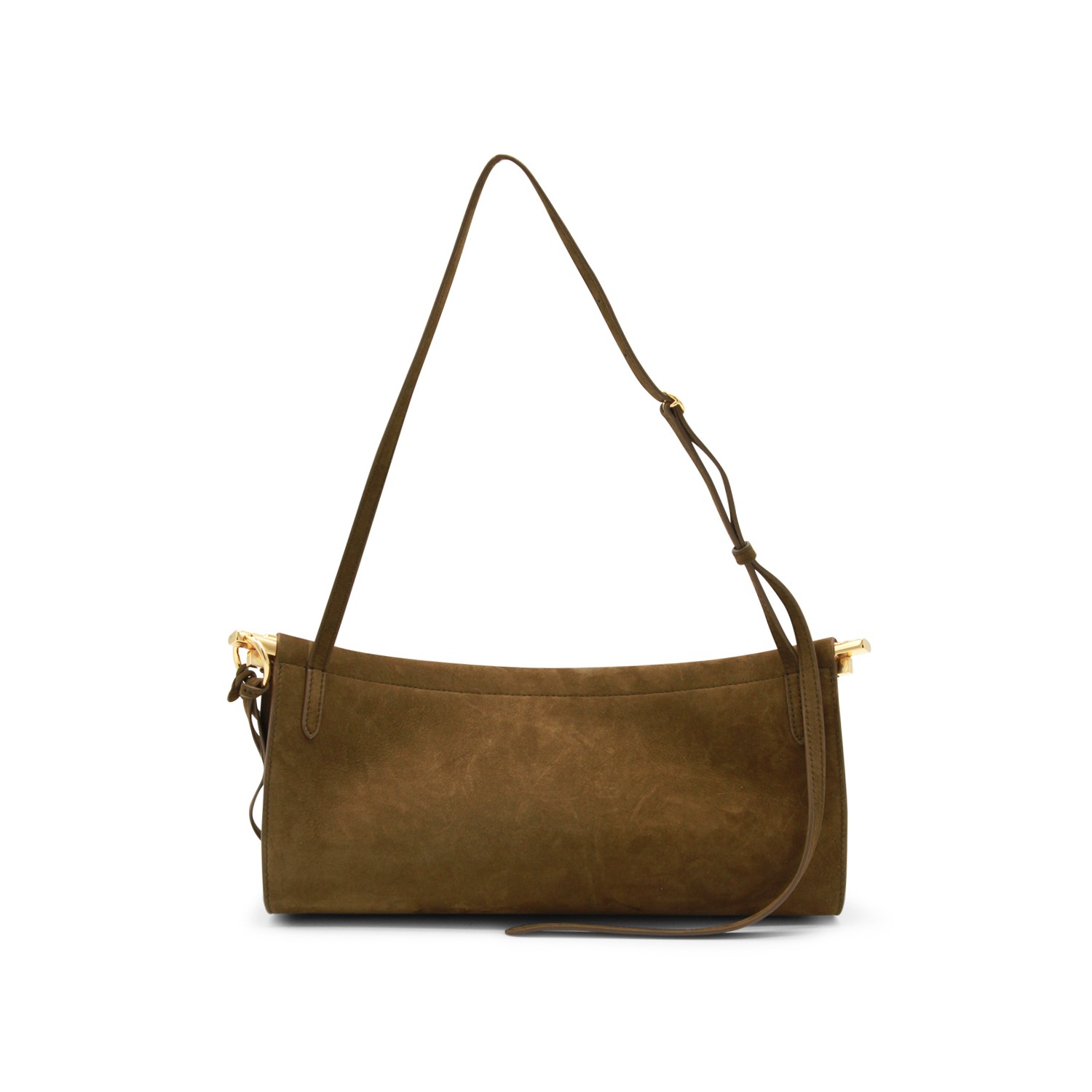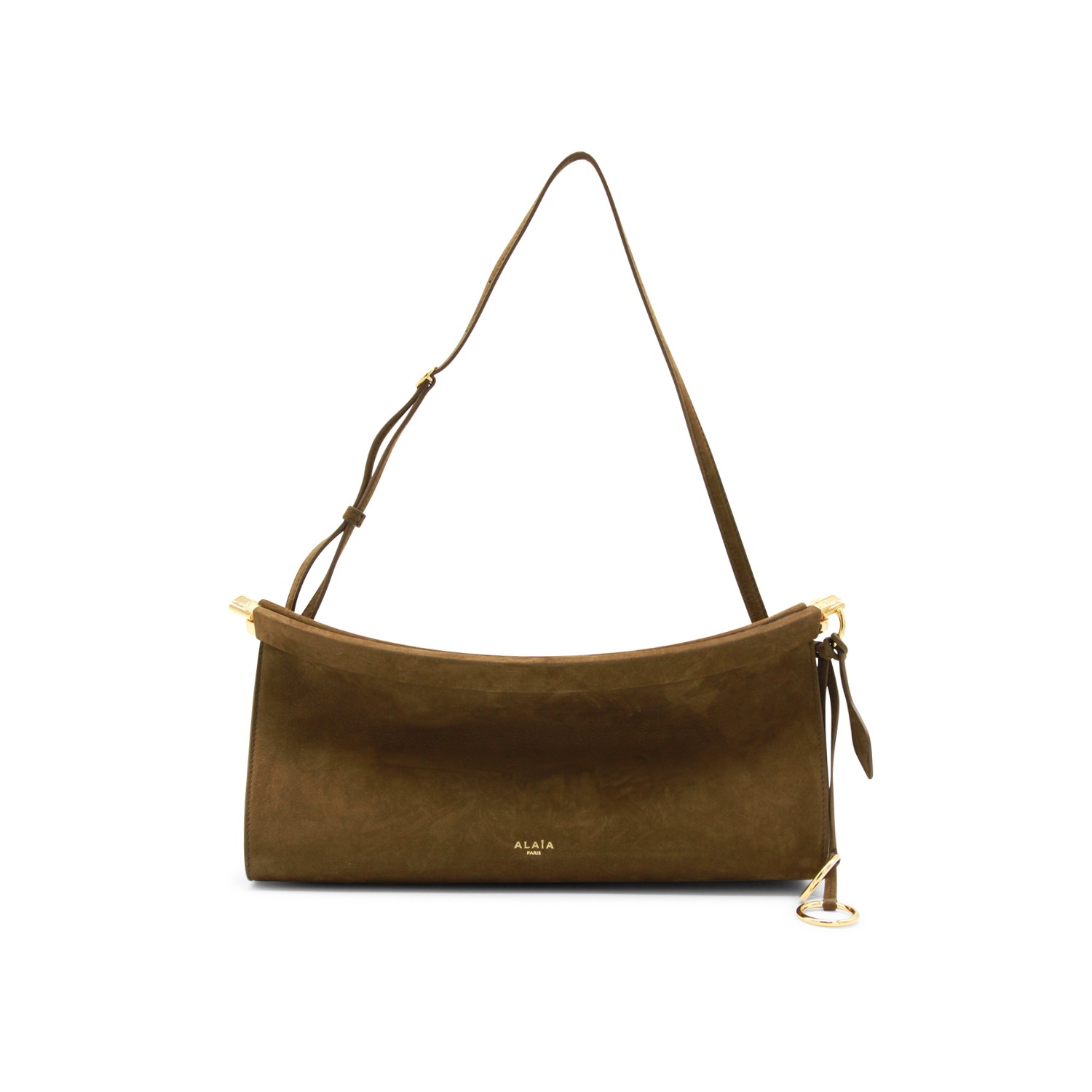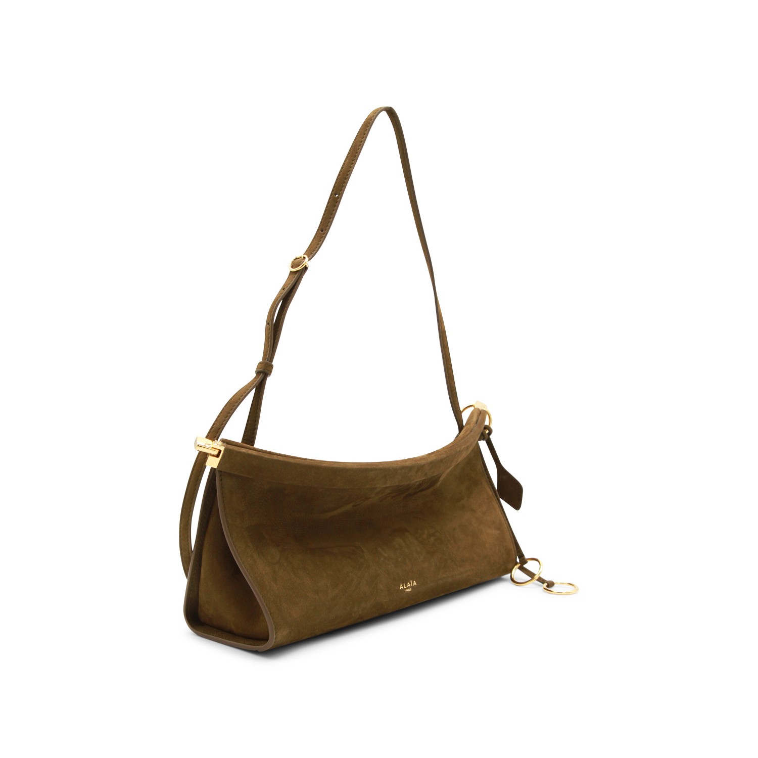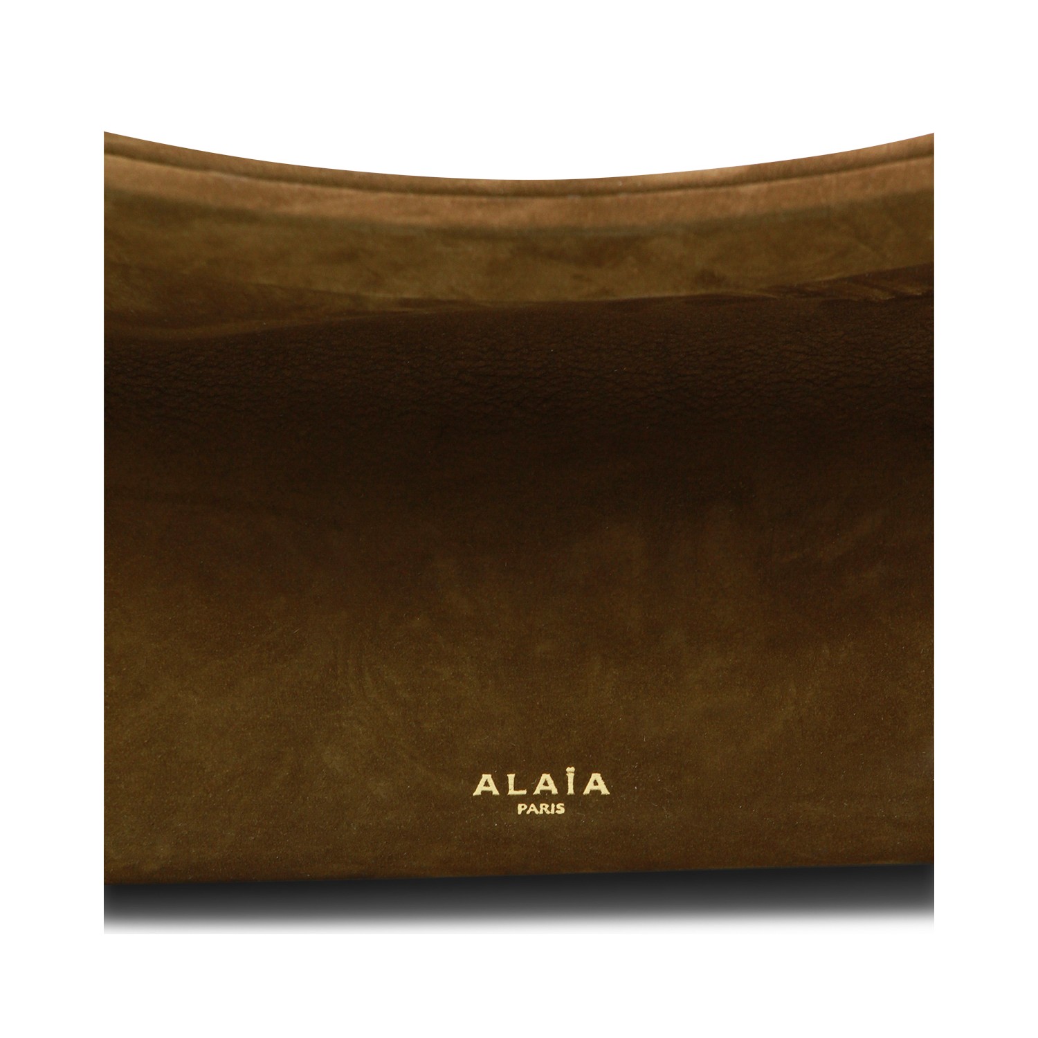 Khaki leather East West medium shoulder bag from Alaia featuring curved line, logo print to the front, gold tone hardware, upper closure, leather strap, suede and main compartment.