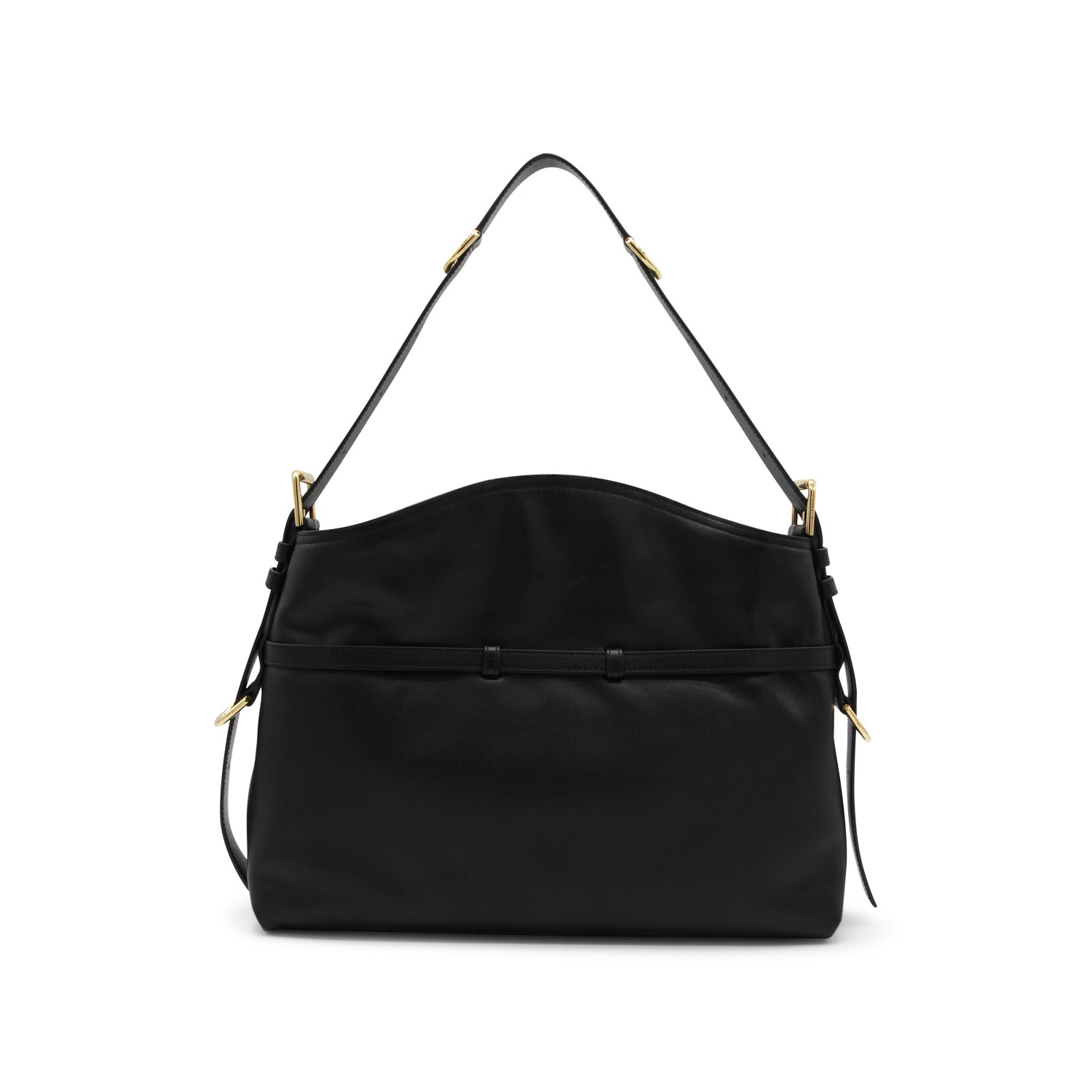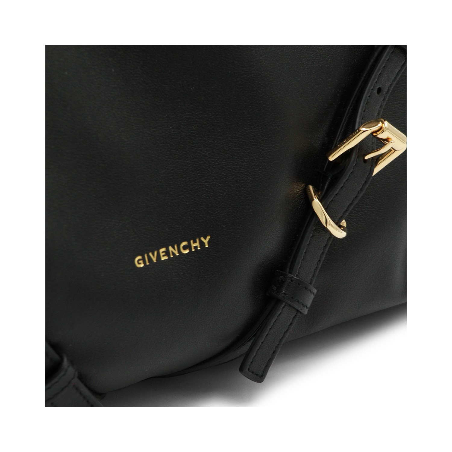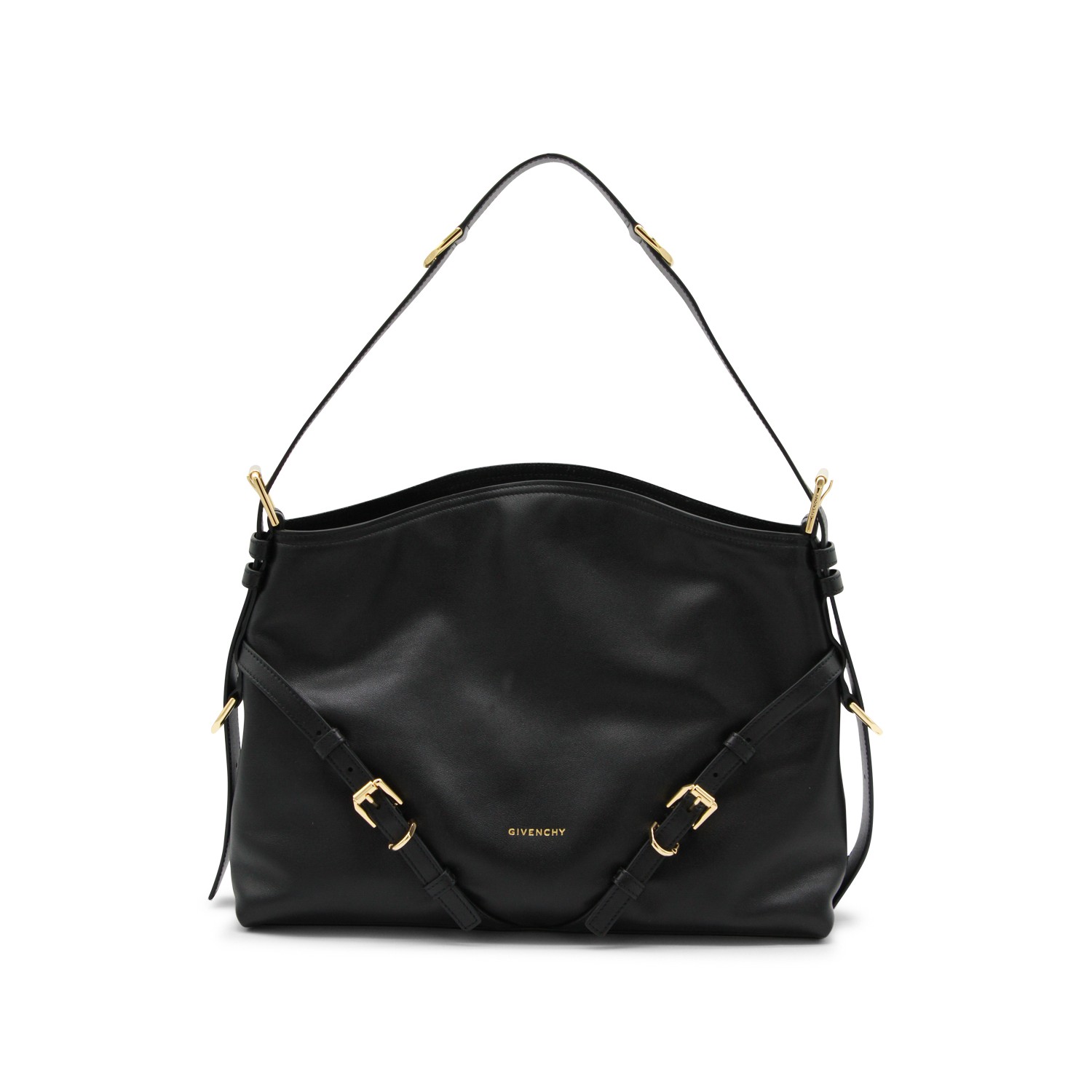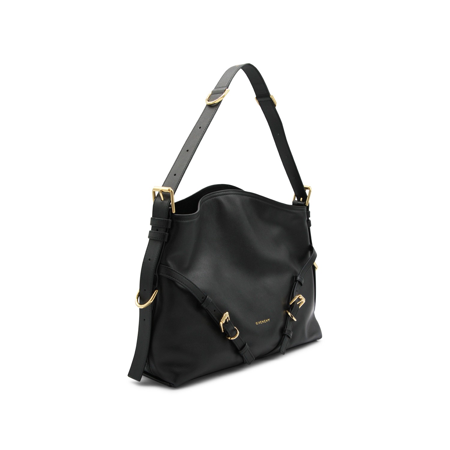 Black leather Voyou medium shoulder bag from Givenchy featuring v shape, adjustable shoulder strap, embossed logo on the front, metal buckles, upper fastening and main compartment.