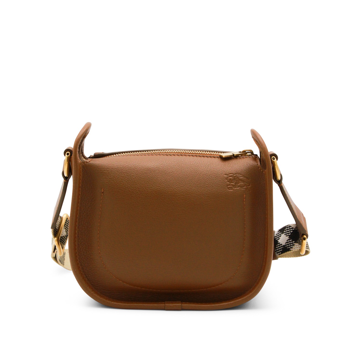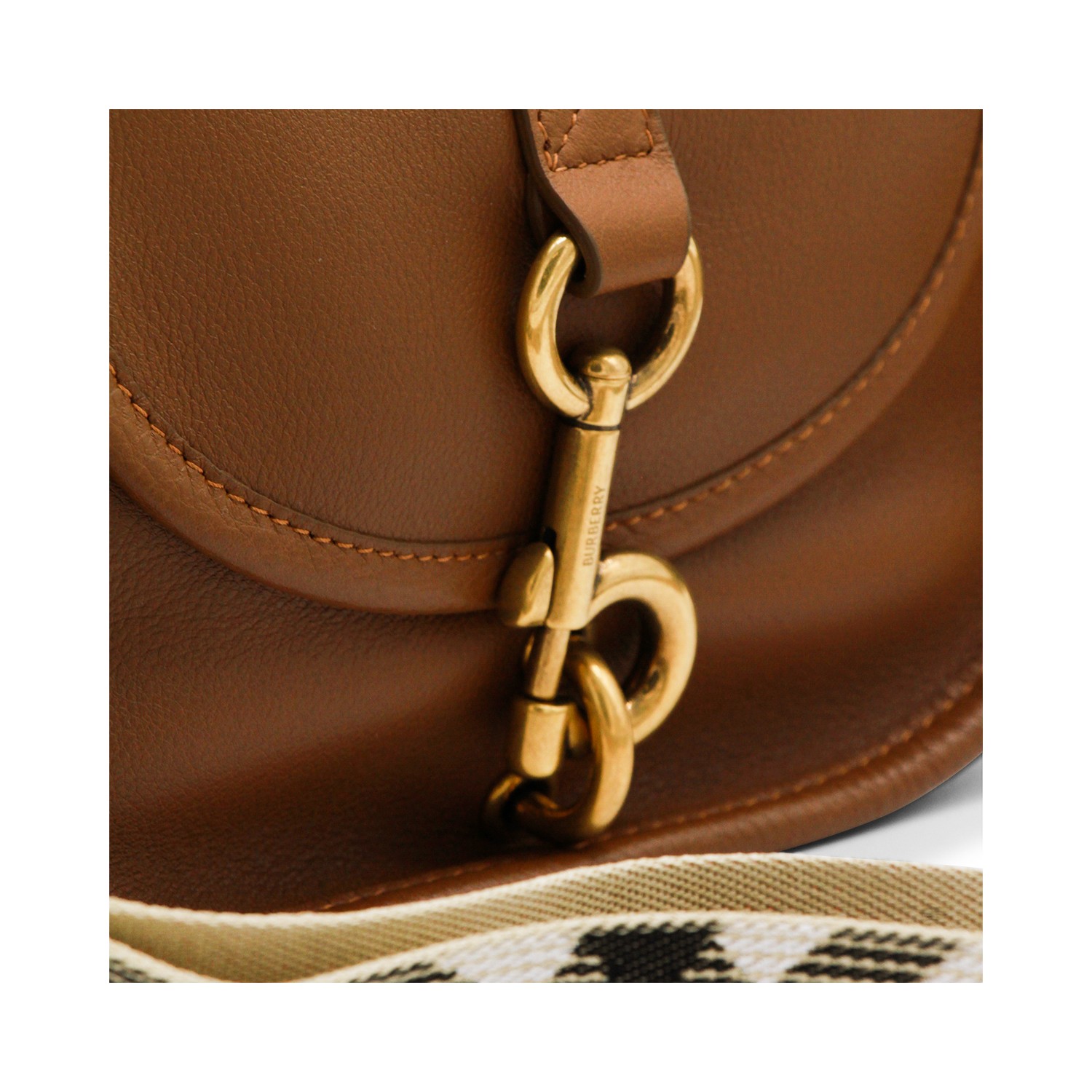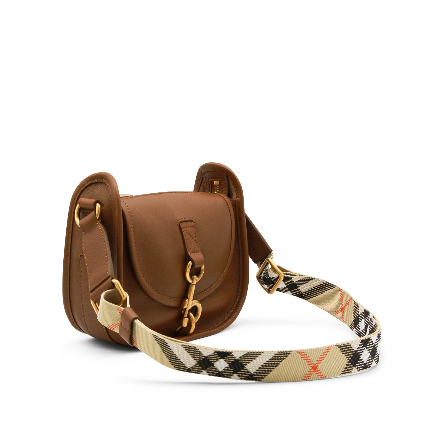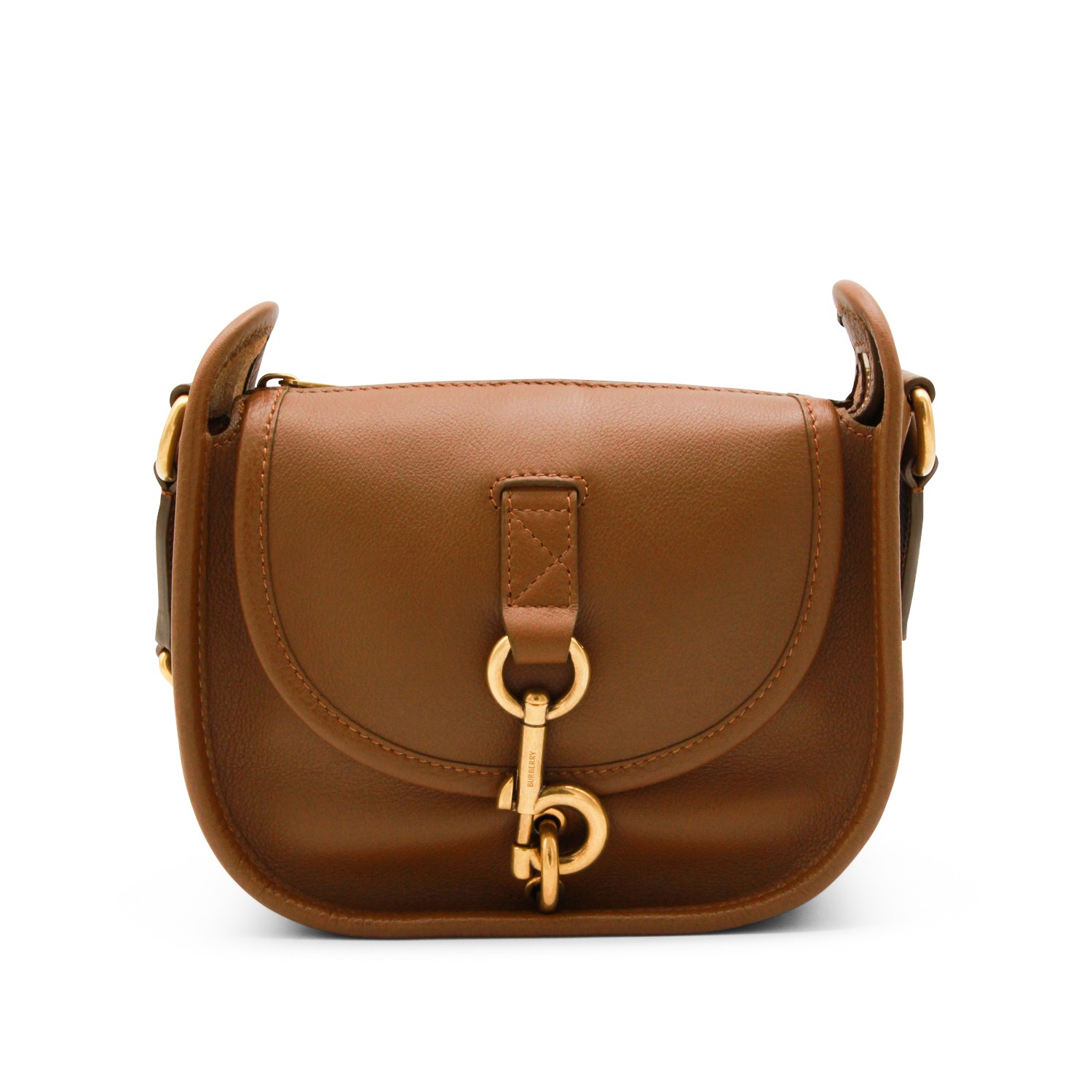 Brown leather shoulder bag from Burberry featuring adjustable strap, flap with metal hook closure, gold tone hardware and main compartment.
