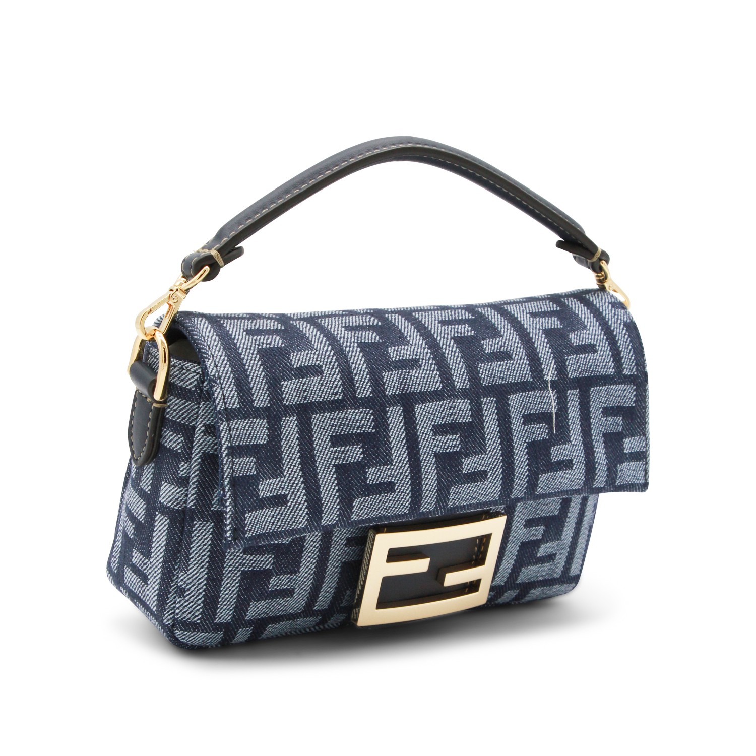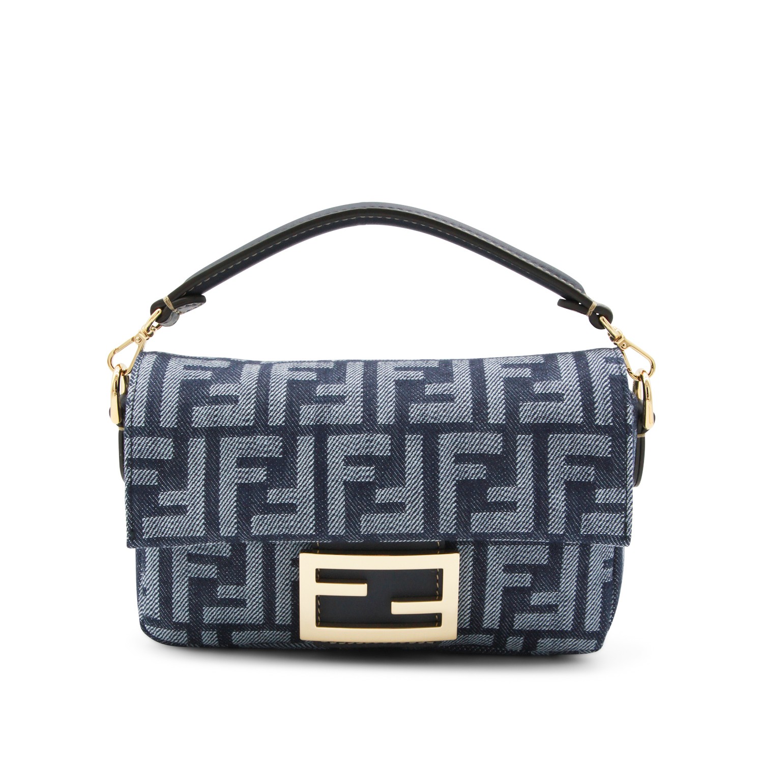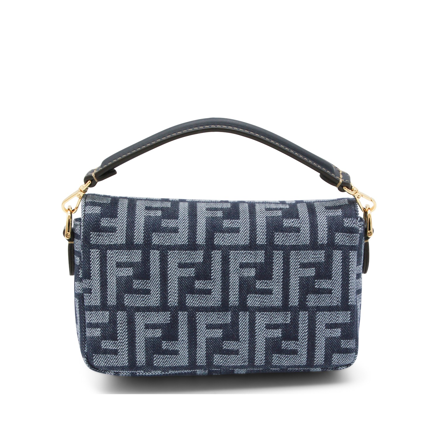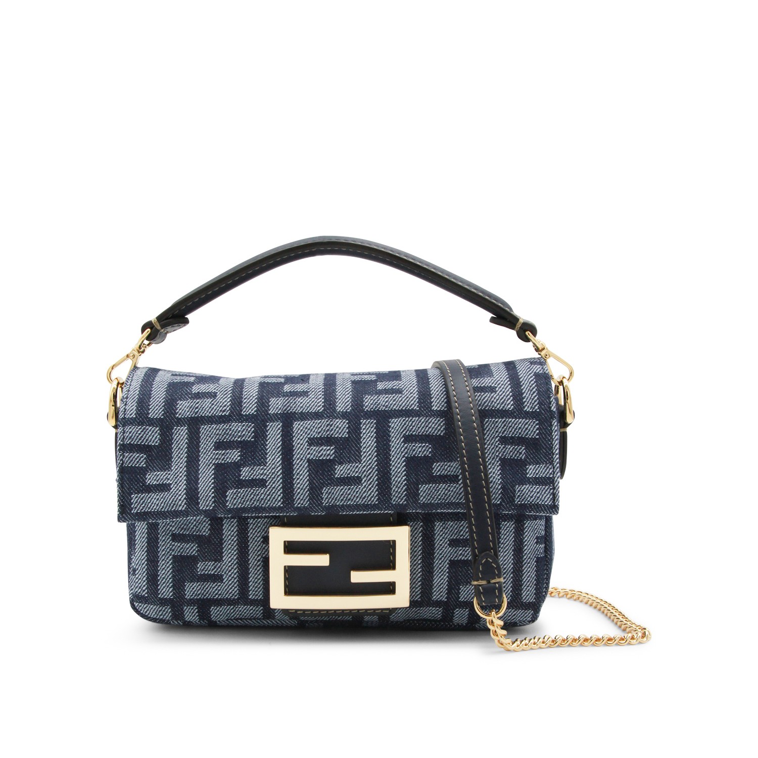 Blue denim Baguette crossbody bag from Fendi featuring top handle, gold tone hardware, leather and metal chain shoulder strap, flap with magnetic closure, all-over FF logo texture and main compartment.