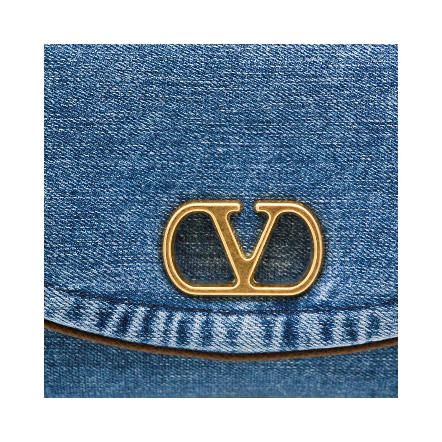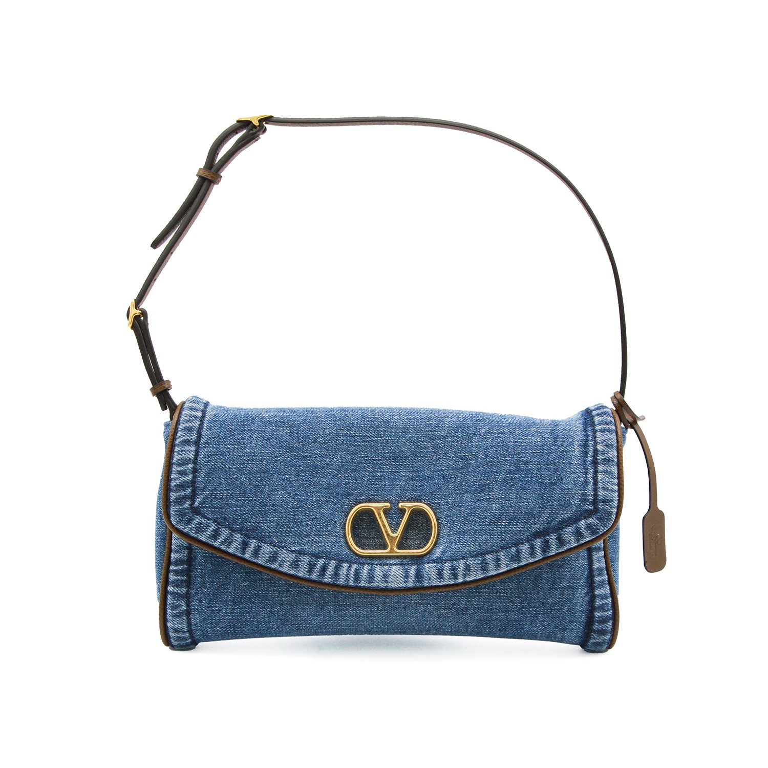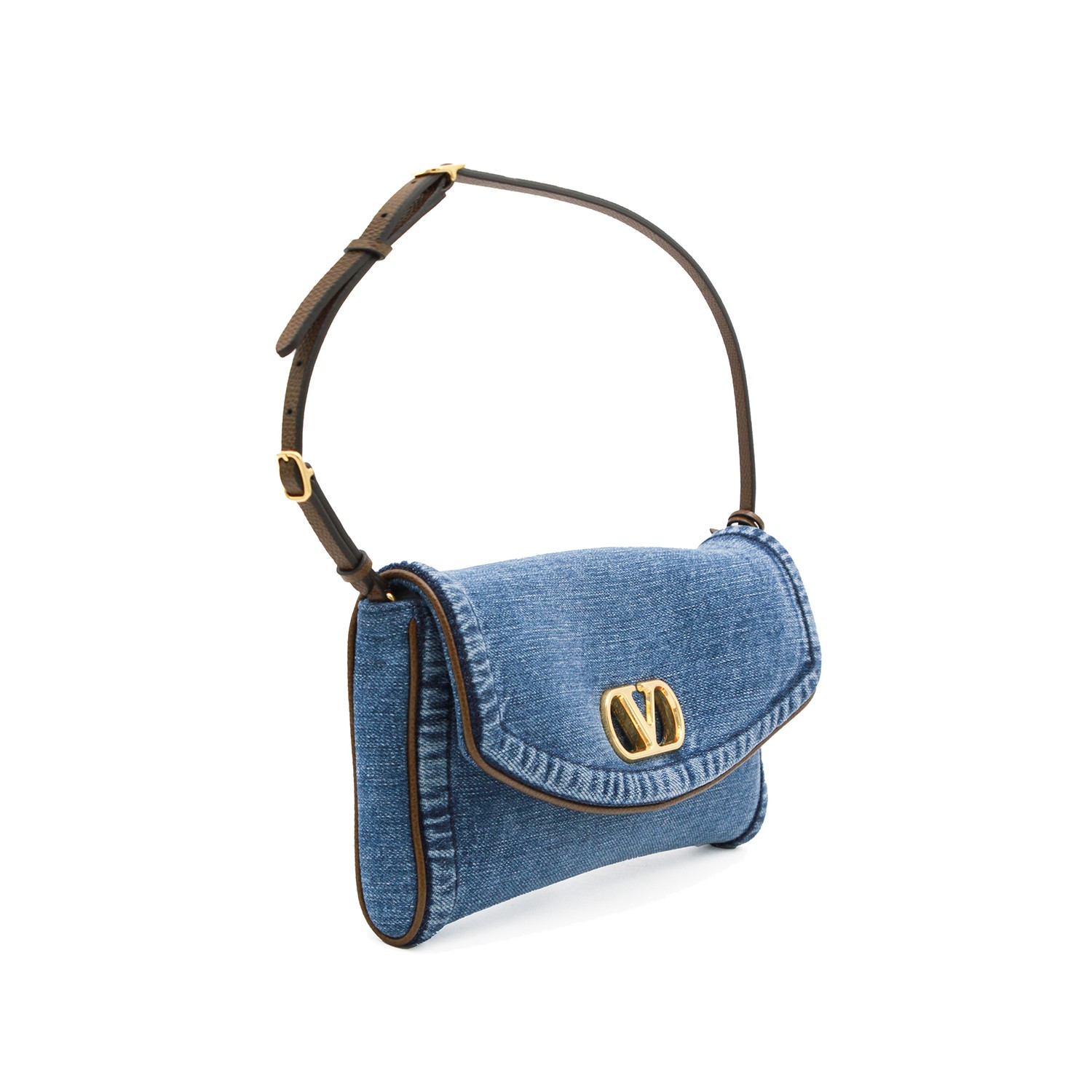 Denim Devain shoulder bag from Valentino Garavani featuring adjustable leather handle, gold tone hardware, foldovertop with magnetic closure, main compartment and internal flat pocket.