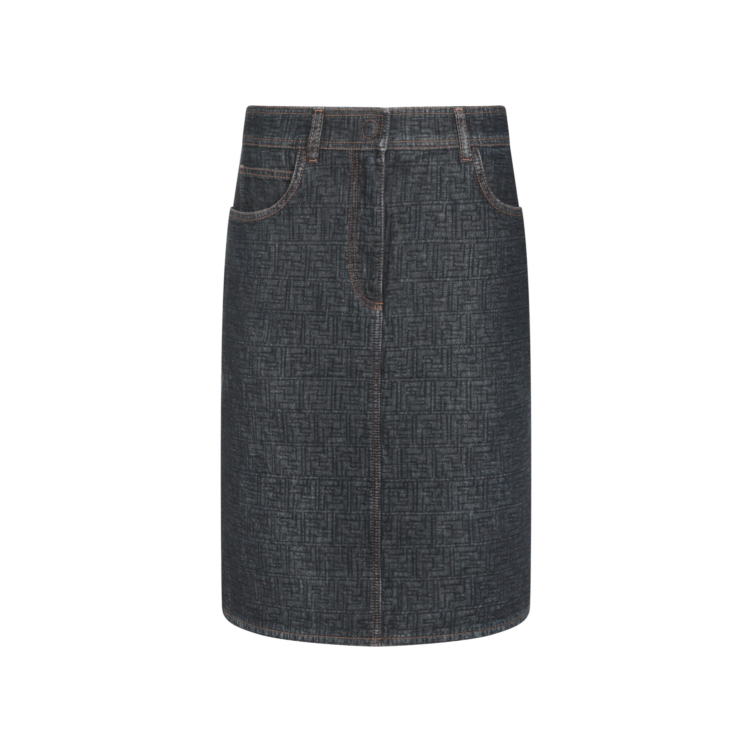 Dark blue cotton skirt from Fendi featuring high waist, belt loops, frontal zip and button fastening, pockets, all over monogram stitchings and mid length.