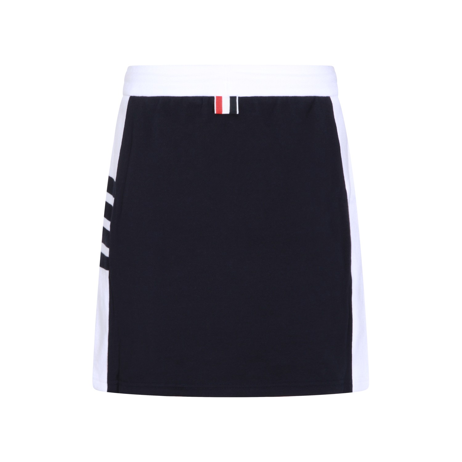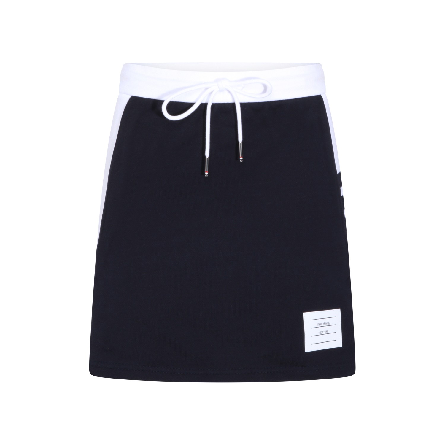 Blue cotton skirt from Thom Browne featuring high waist, lace fastening, white details, logo and regular length.