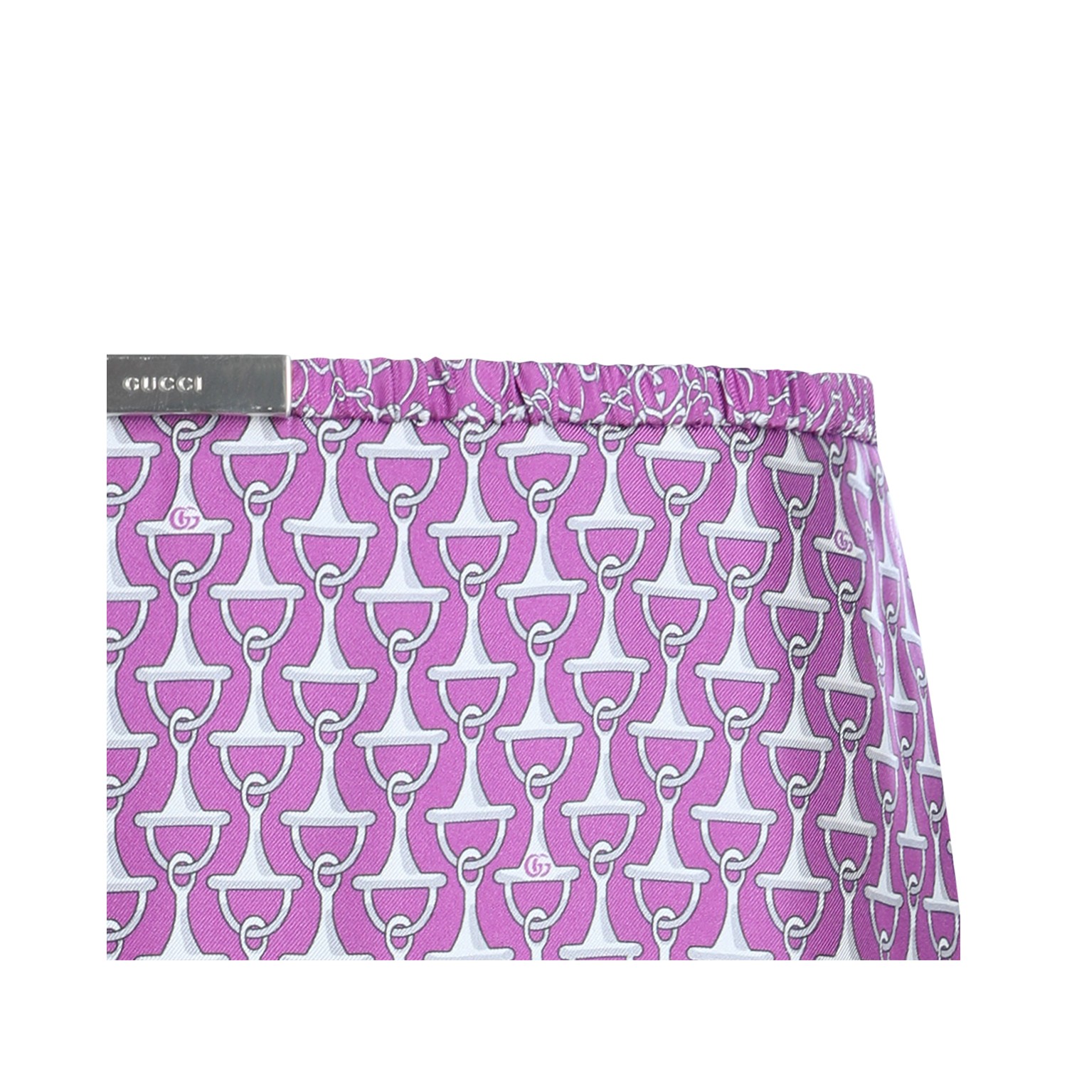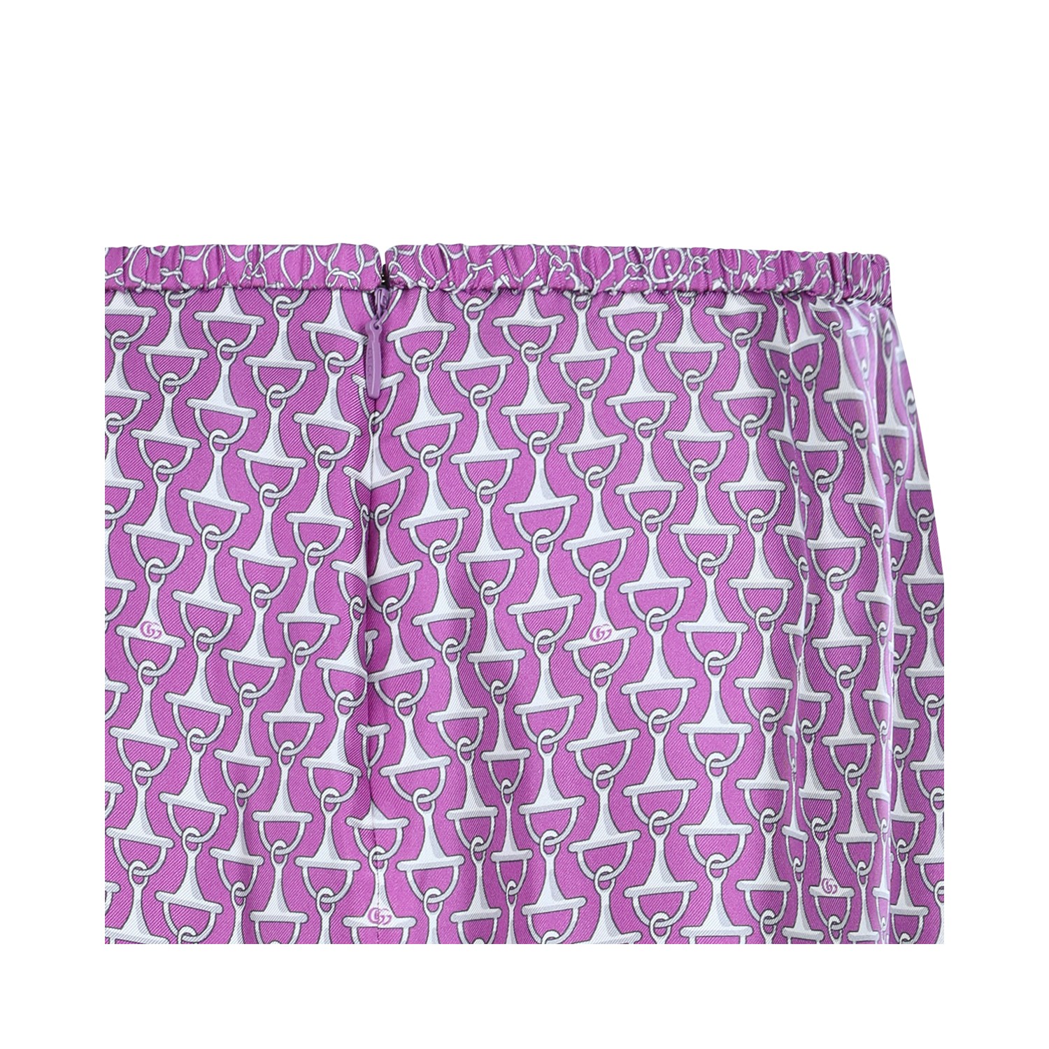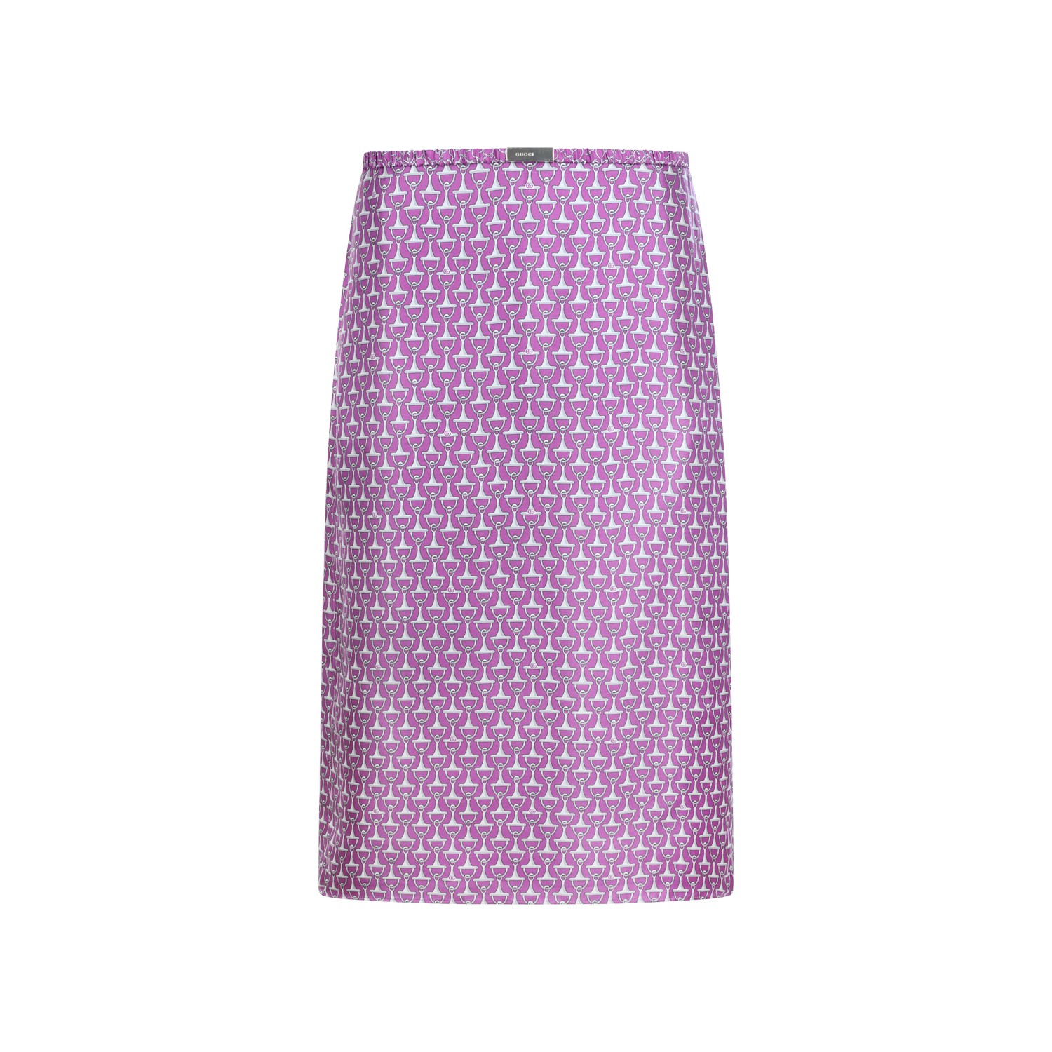Pink silk skirt from Gucci featuring high waist, all over pattern and mid length.