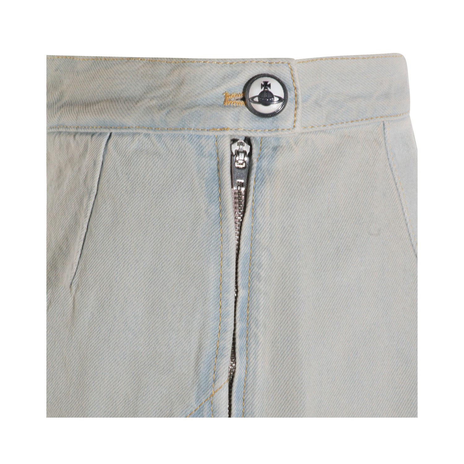 Light blue cotton skirt from Vivienne Westwood featuring lateral zip fastening, mini length and logo patch.