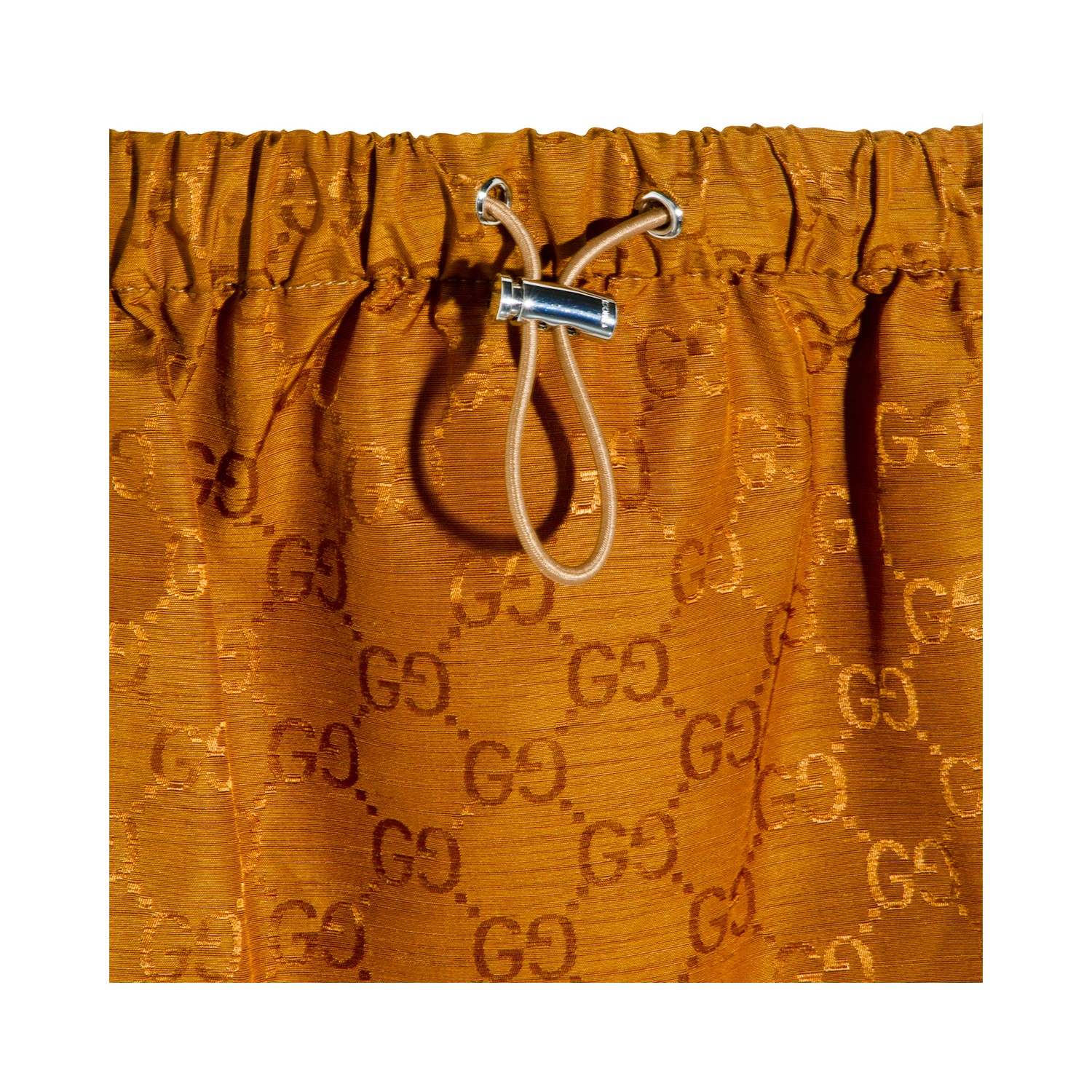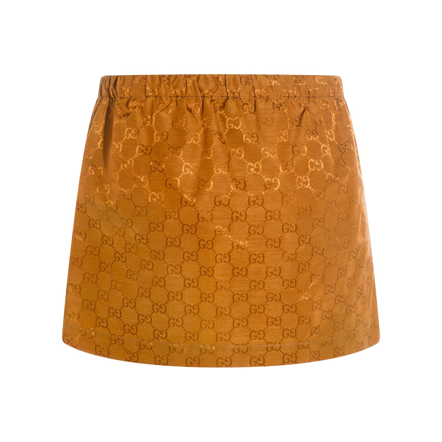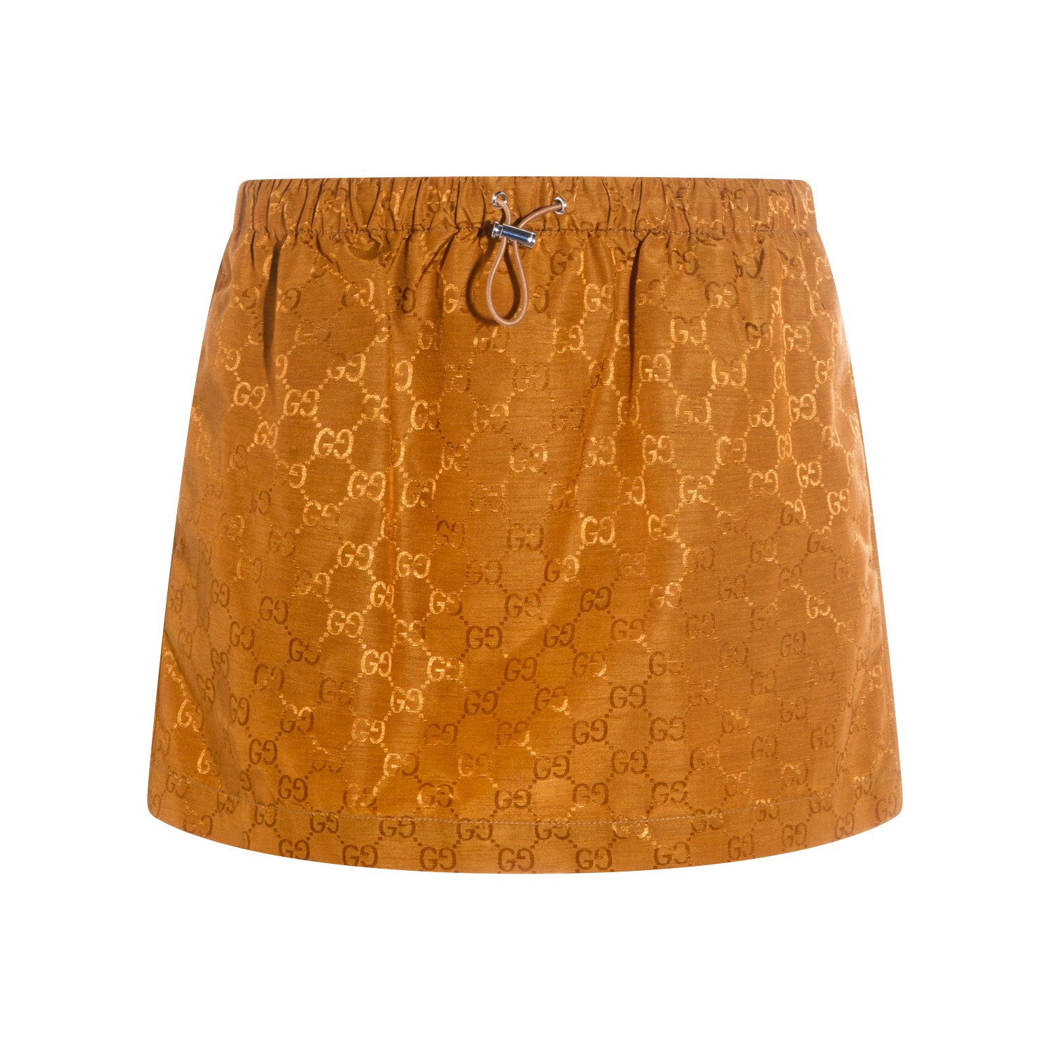 Dark beige mini skirt from Gucci featuring elasticizated waist with drawstring, all over logo pattern, pockets and mini length.