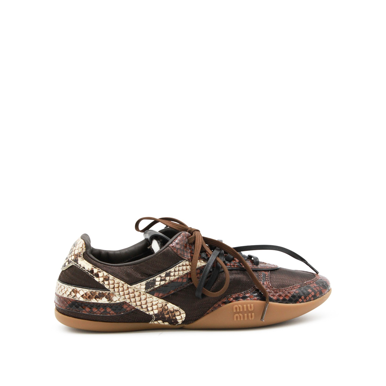 Brown sneakers from Miu Miu featuring round toe, laces fastening, python print, branded tongue and rubber sole.