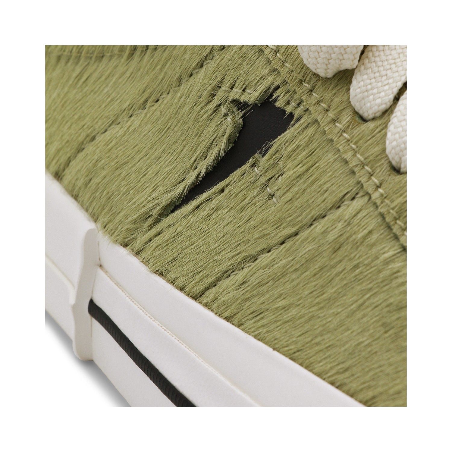 Acid green leather sneakers from Converse X DRKSHDW featuring round toe, lace up contrasting fastening, frontal logo, details and contrasting rubber sole.