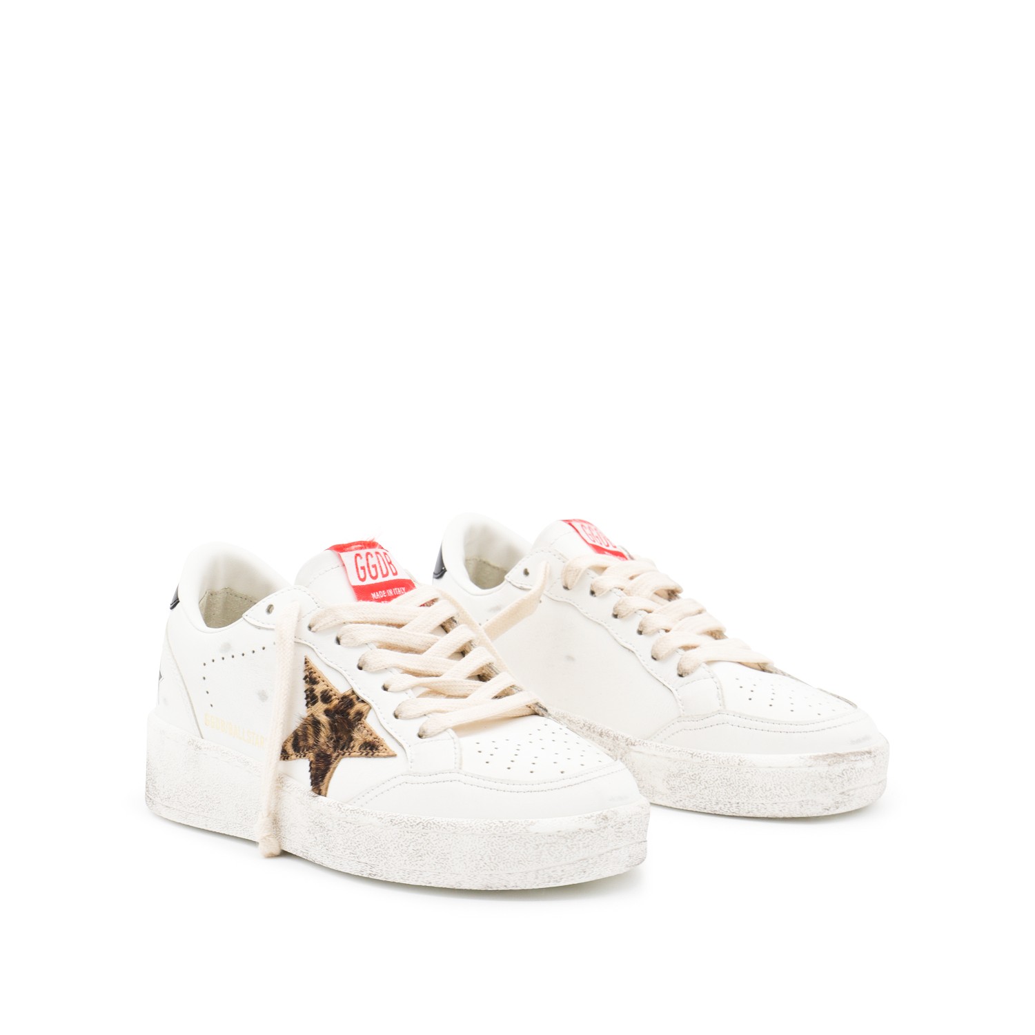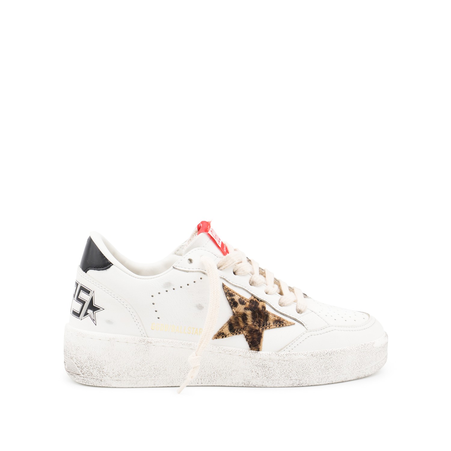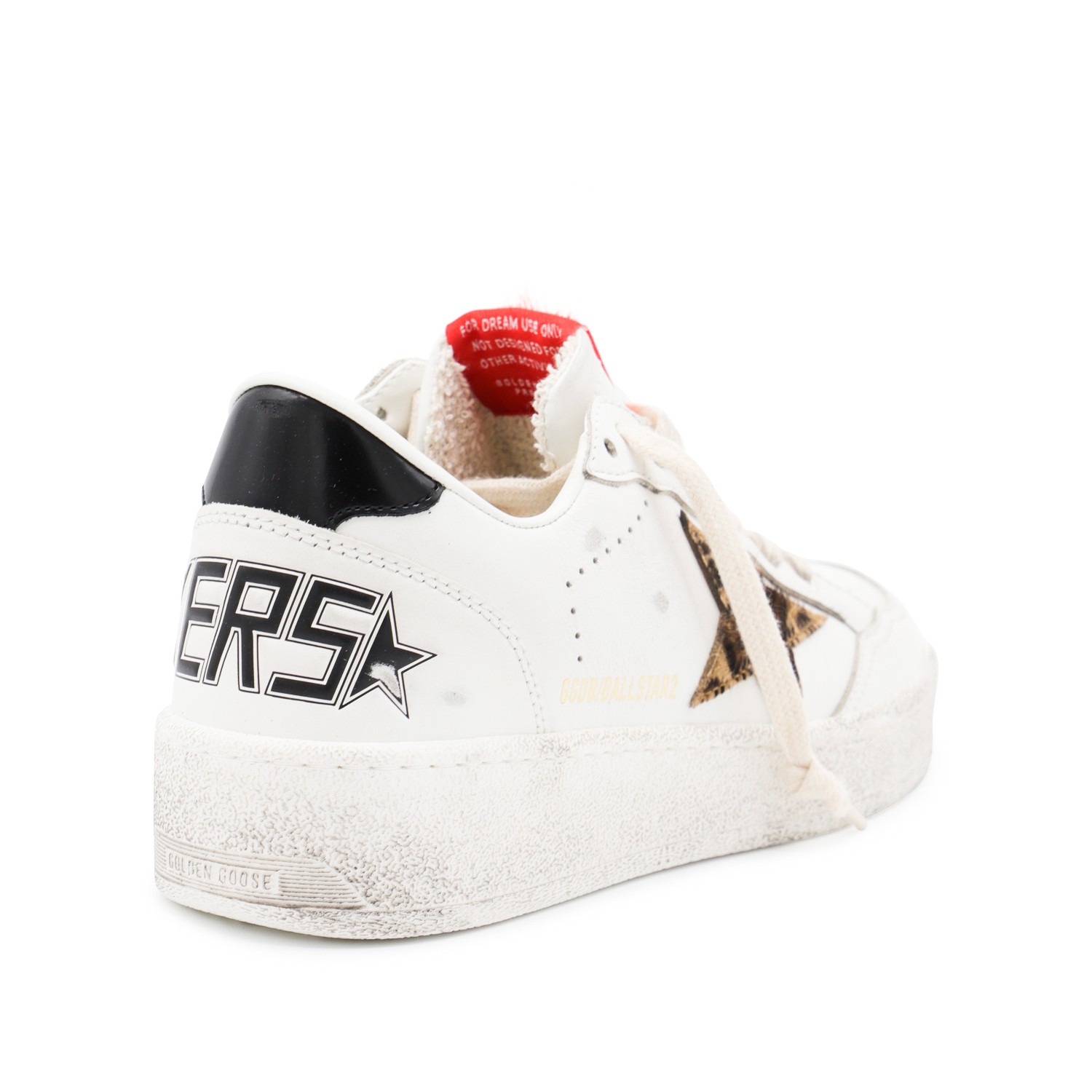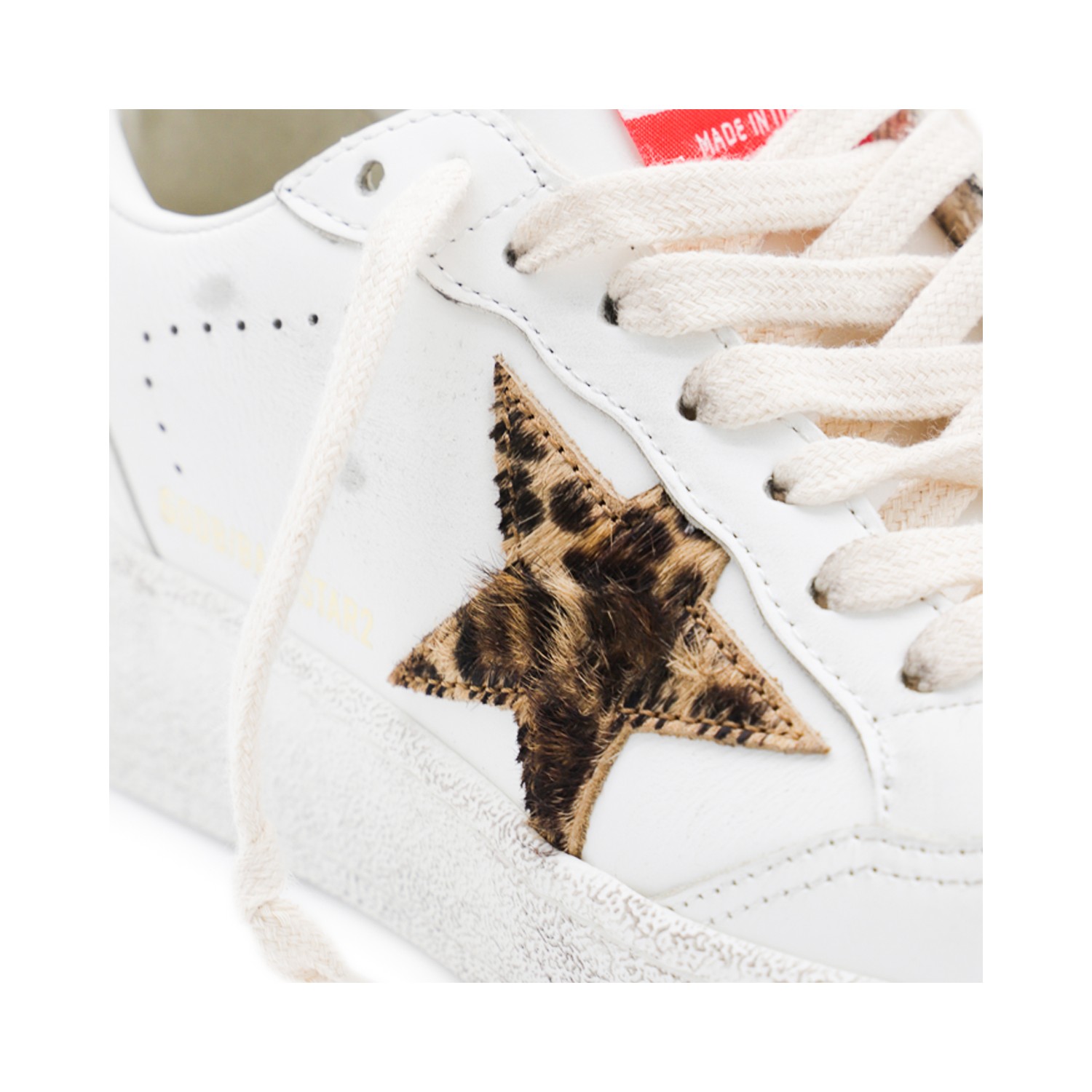 White leather Ballstar 2 sneakers from Golden Goose featuring round toe, cotton laces fastening, leopard side star patch, rubber sole and branded insole.
