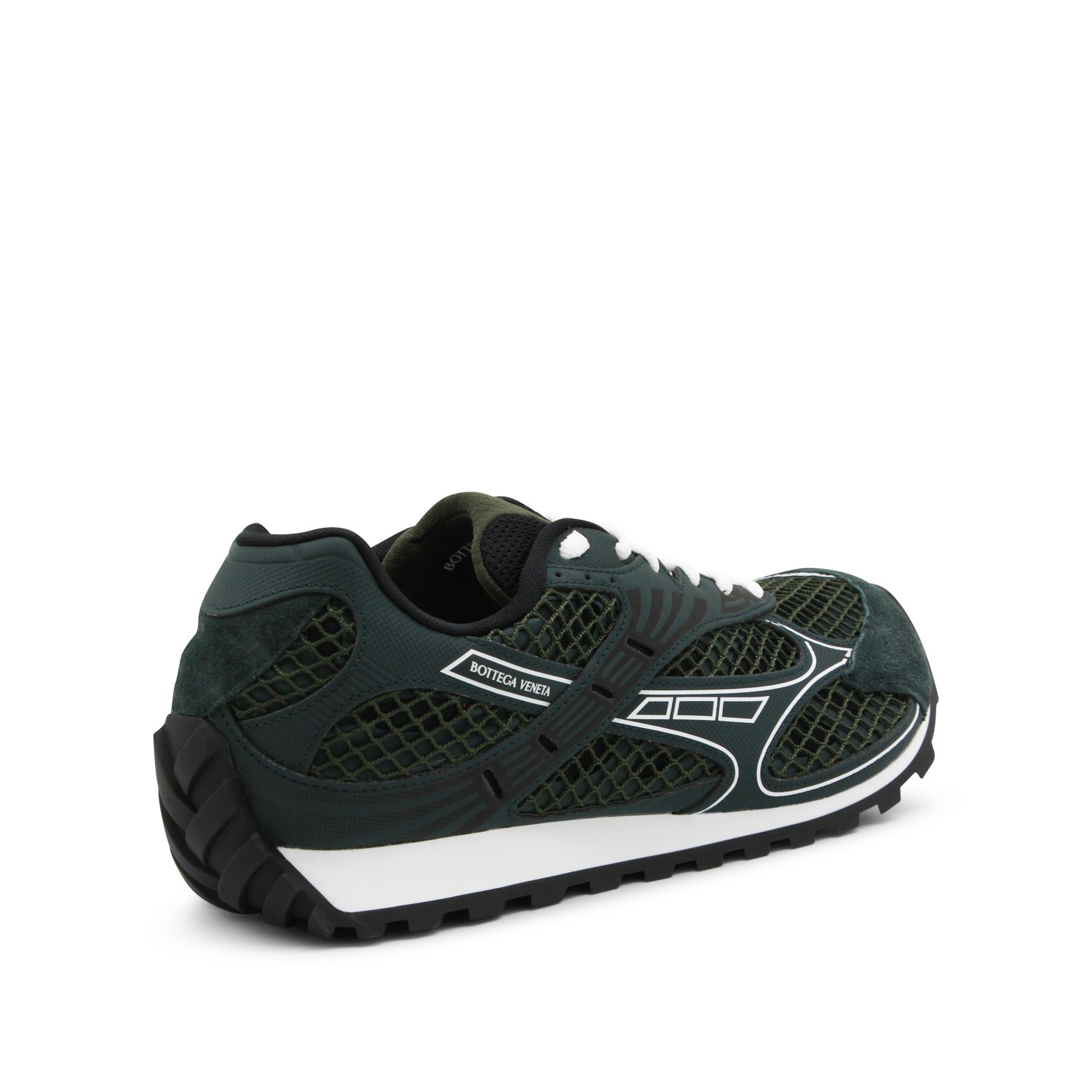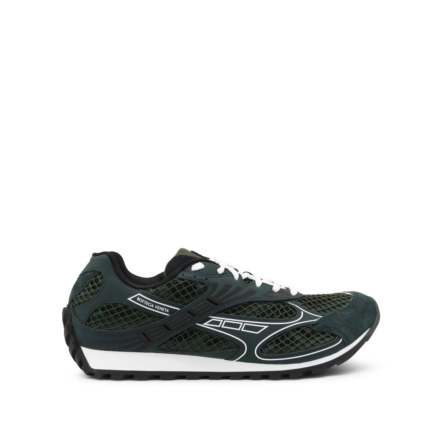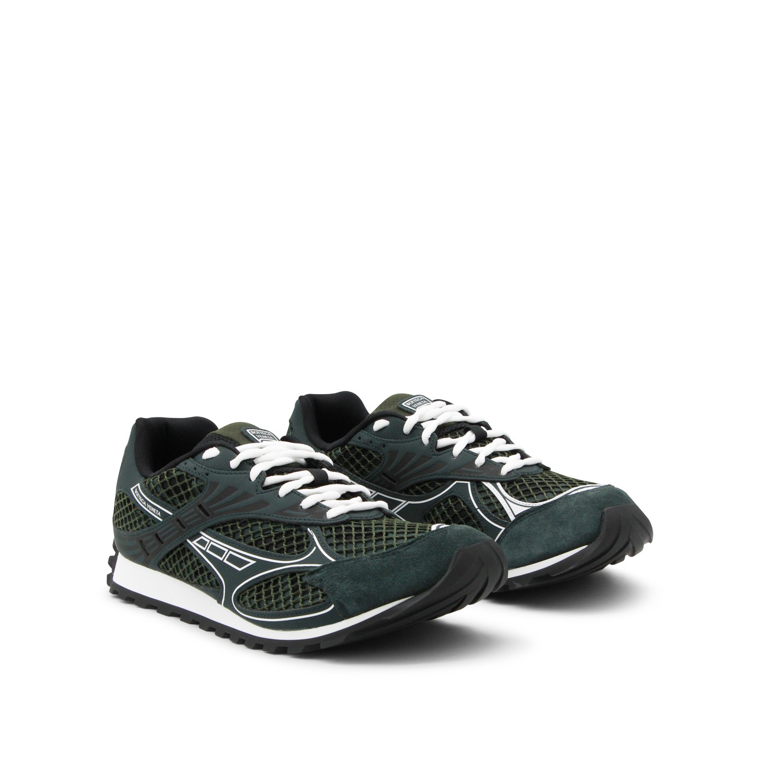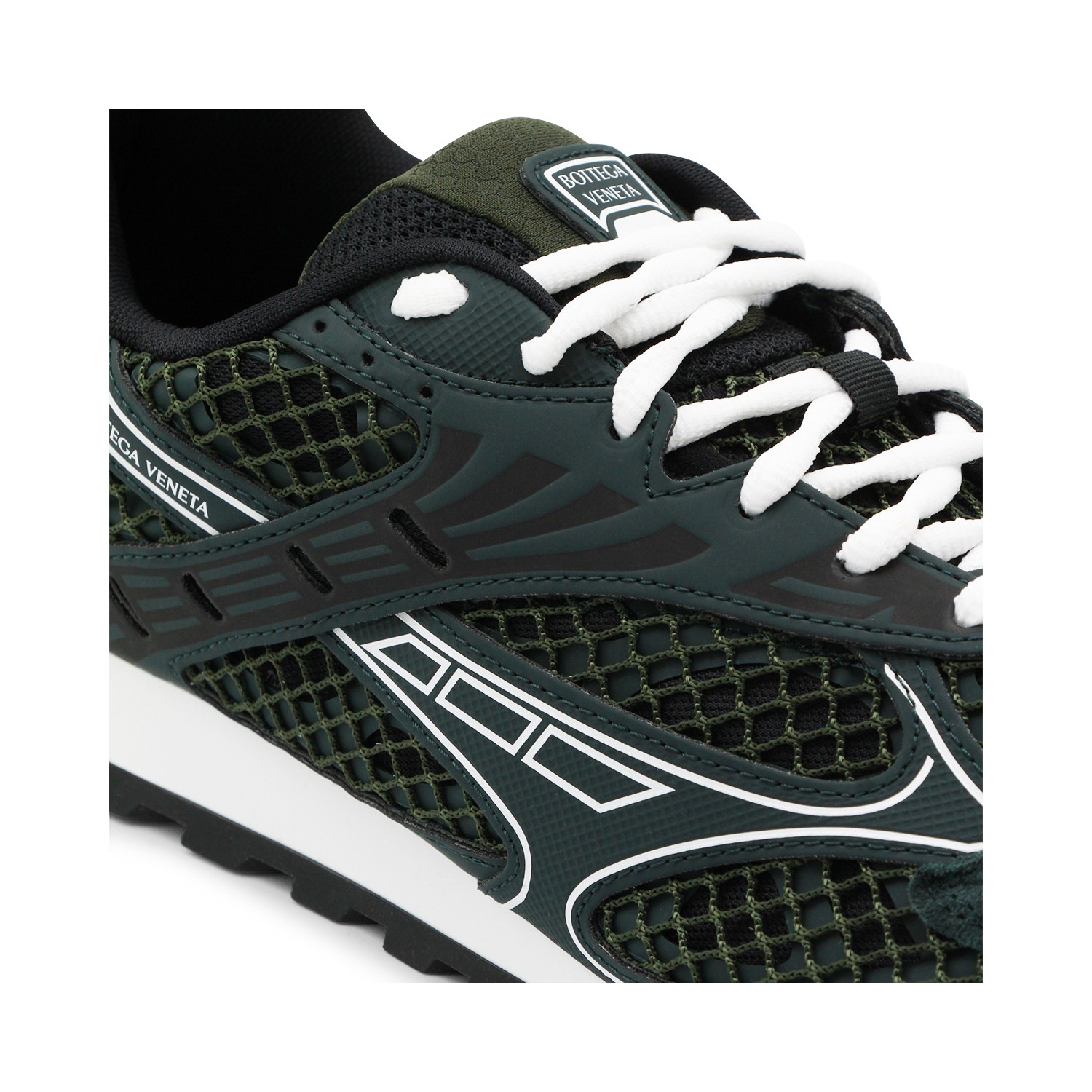 Dark green sneakers from Bottega Veneta featuring round toe, lace up fastening, all over details and rubber sole.
