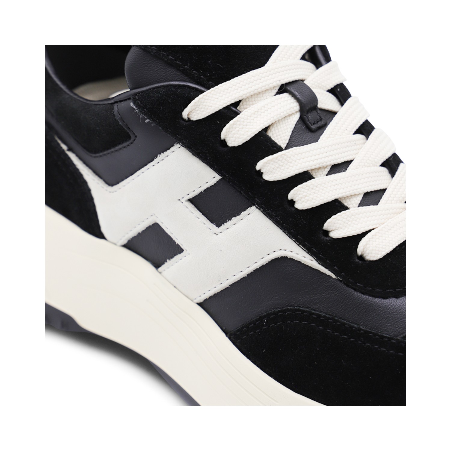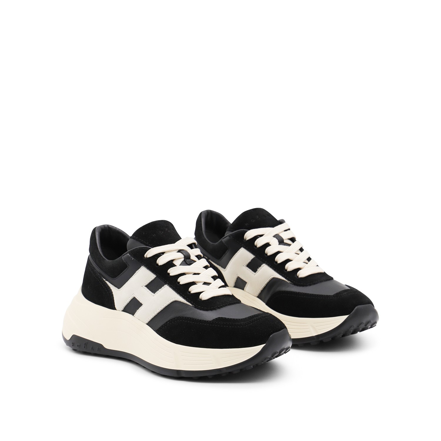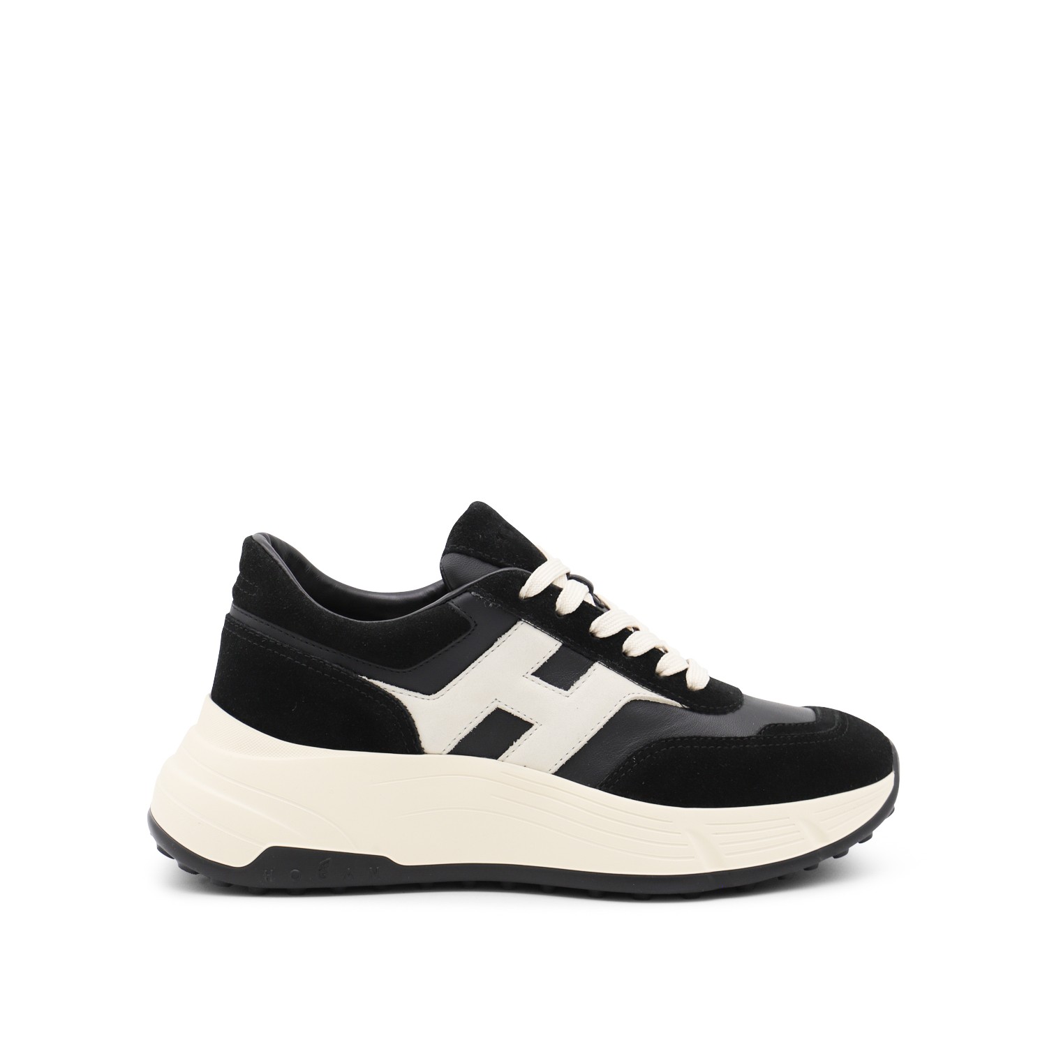 Black and white leather sneakers from Hogan featuring round toe, panelled design, lateral logo, cotton laces fastening, branded insole and chunky sole.