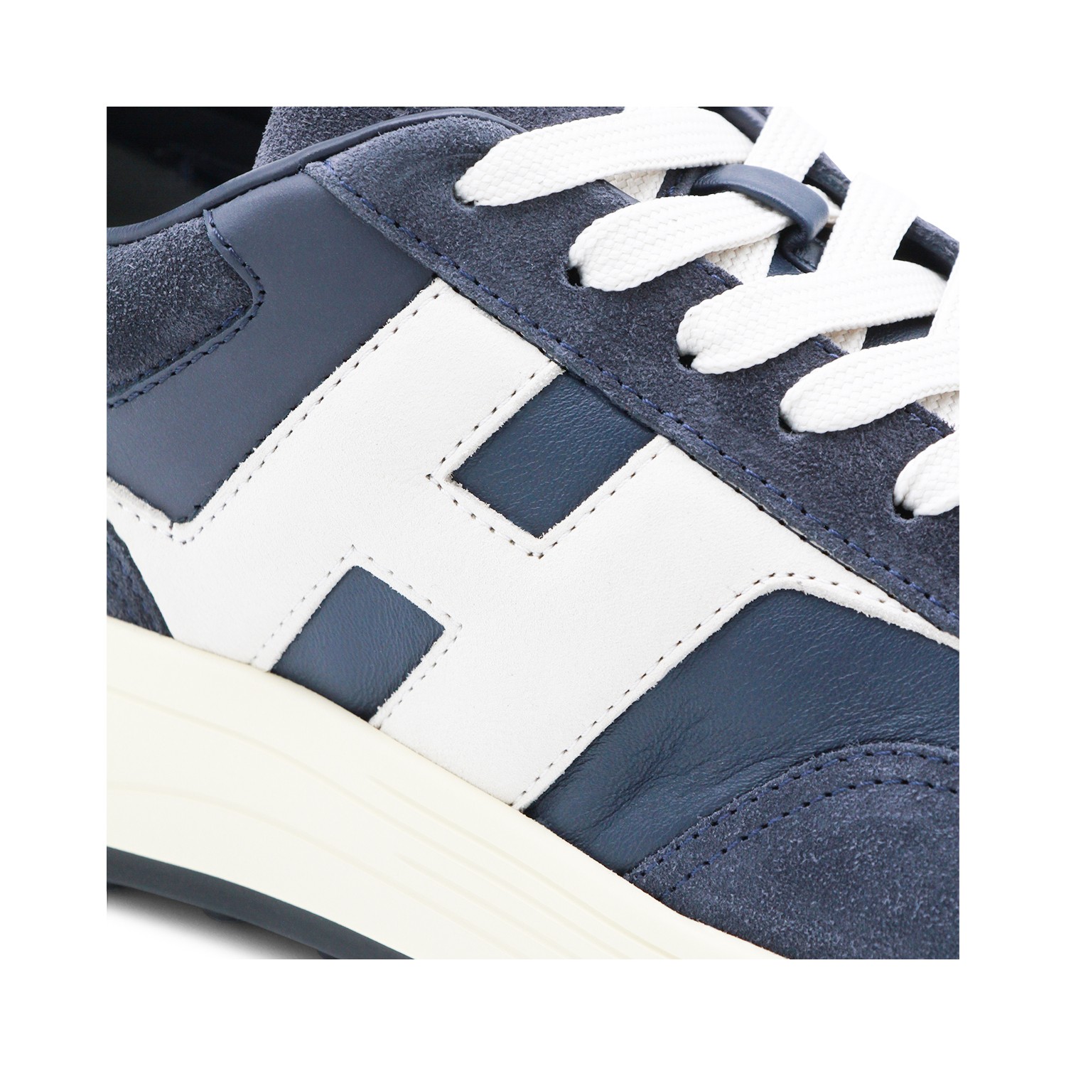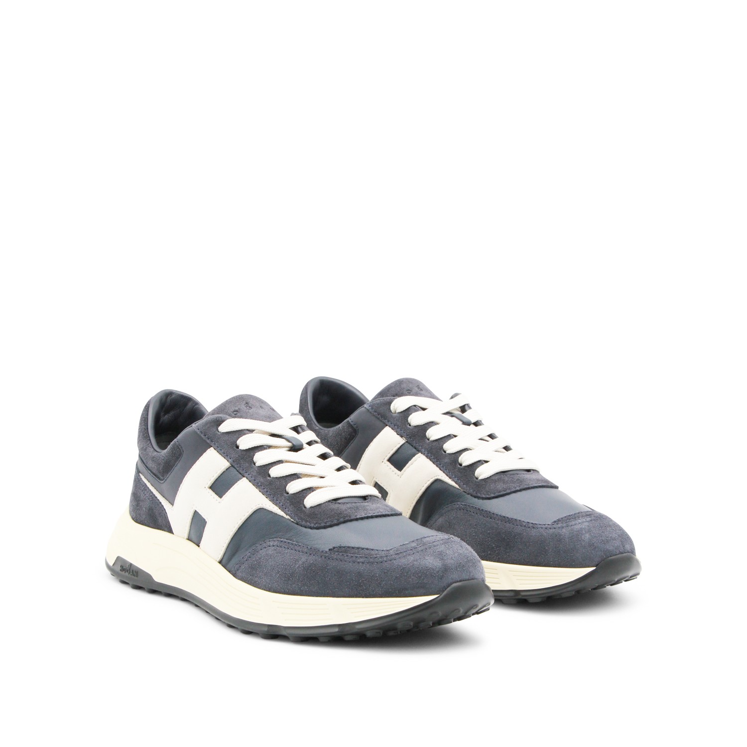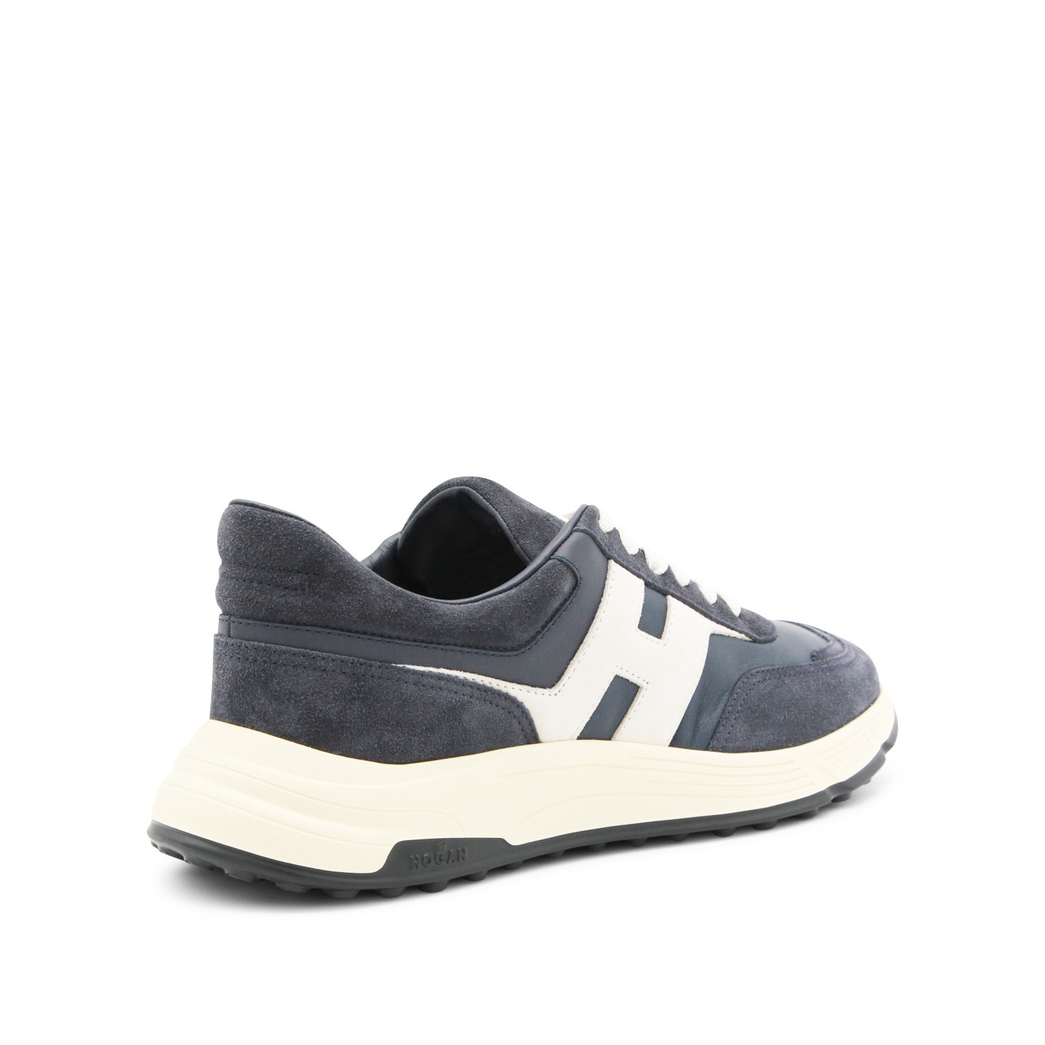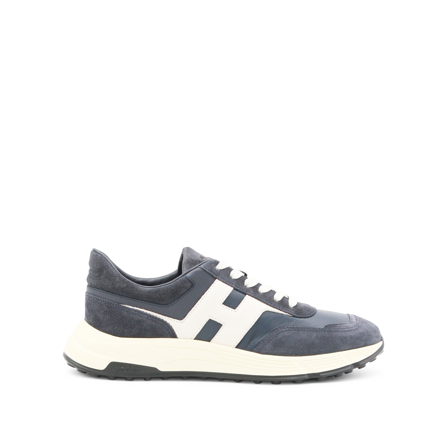 Navy leather sneakers from Hogan featuring round toe, lace-up fastening, lateral contrasting logo and rubber sole.