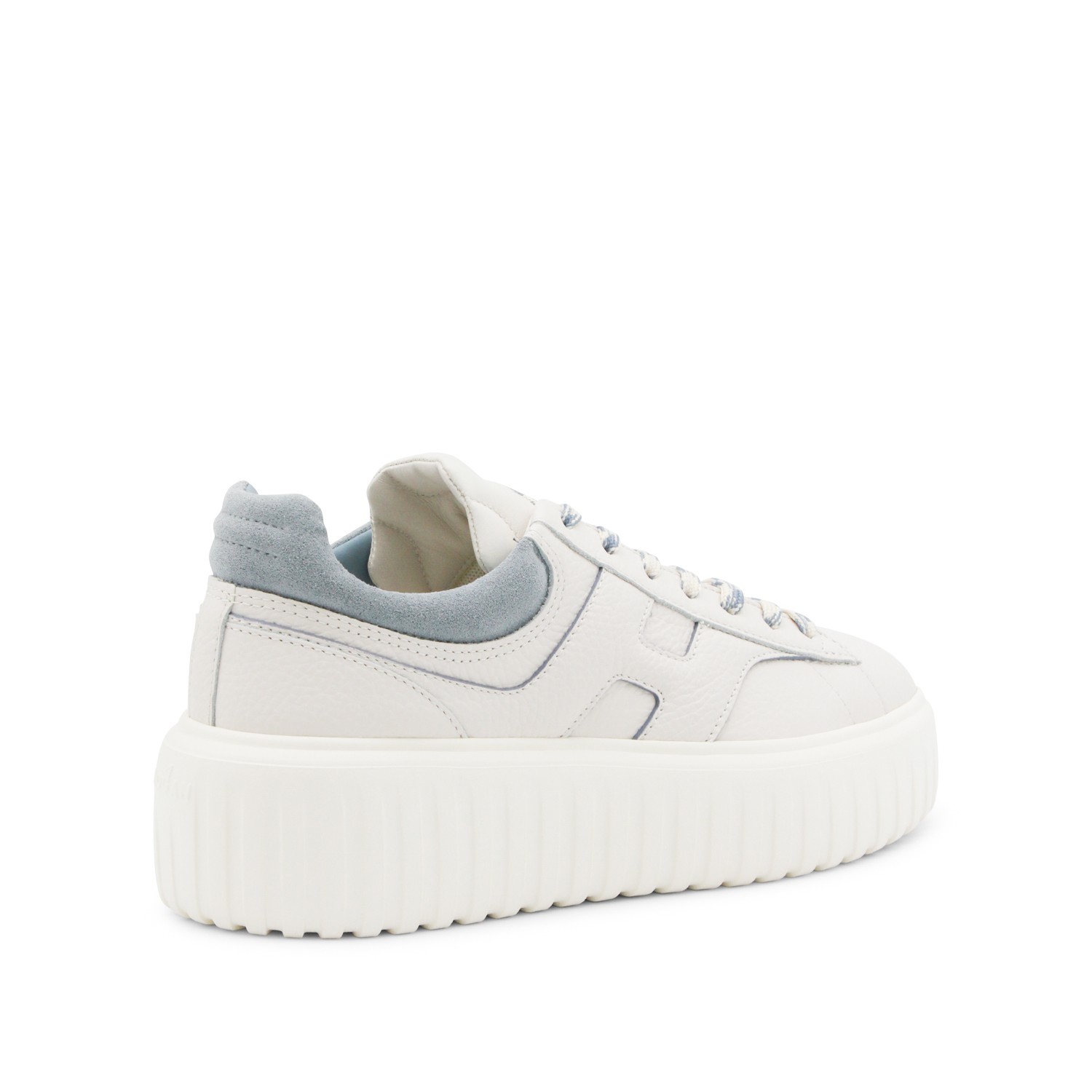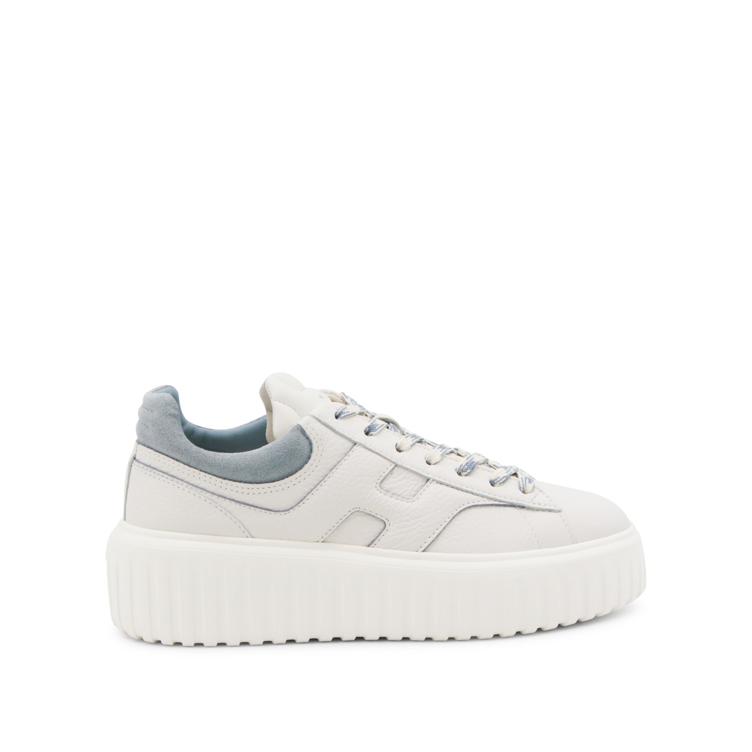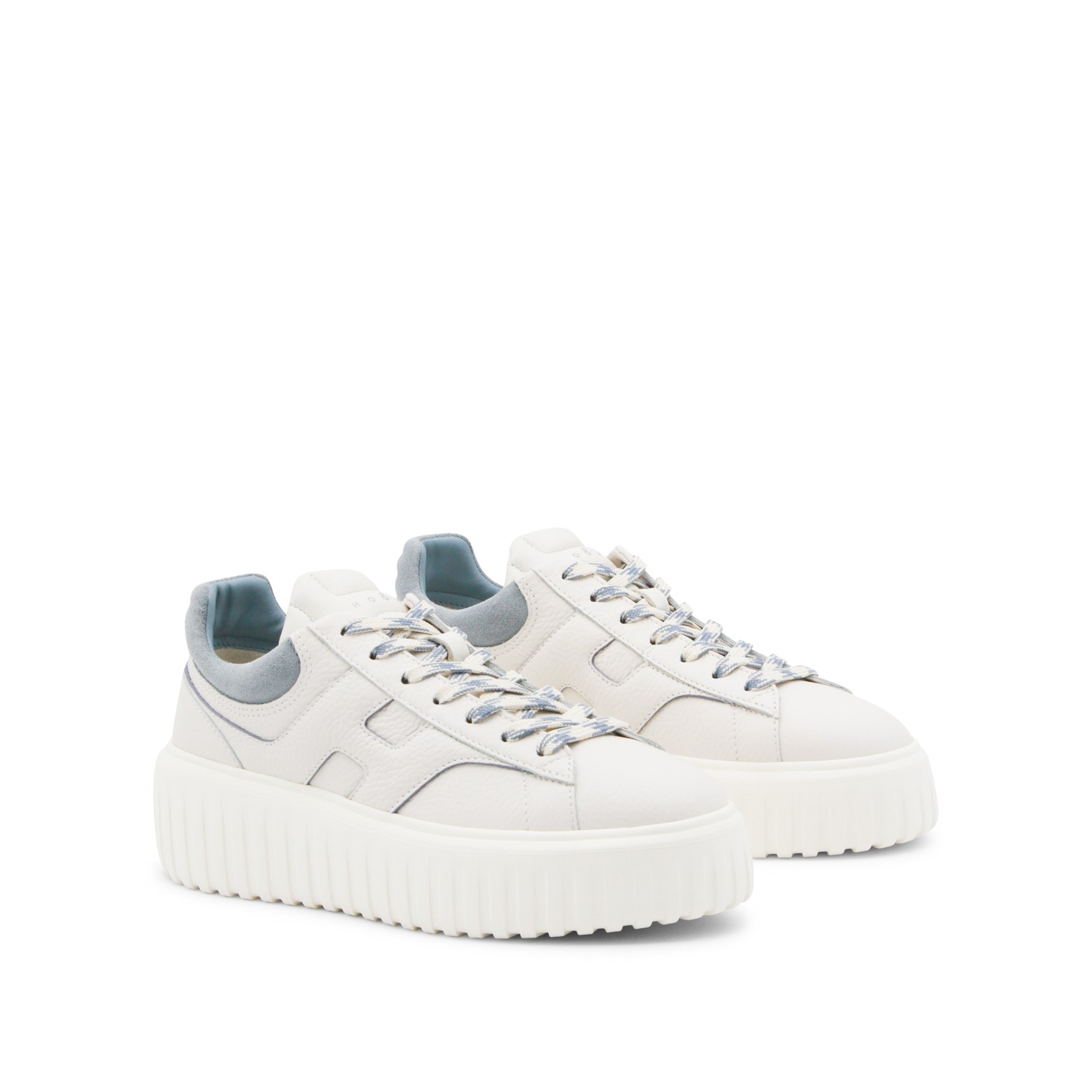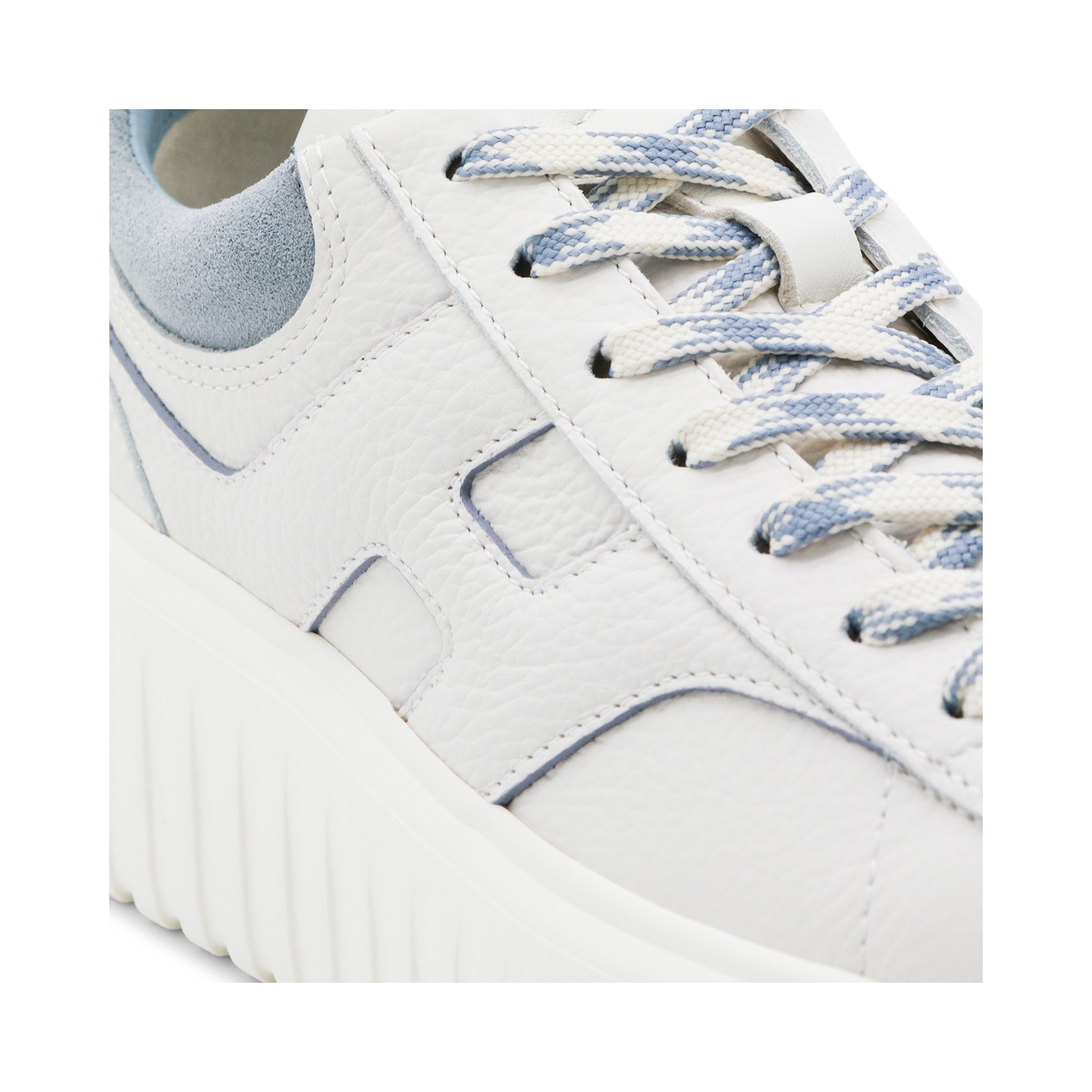 White and light blue leather sneakers from Hogan featuring round toe, lace-up fastening, lateral logo and rubber sole.