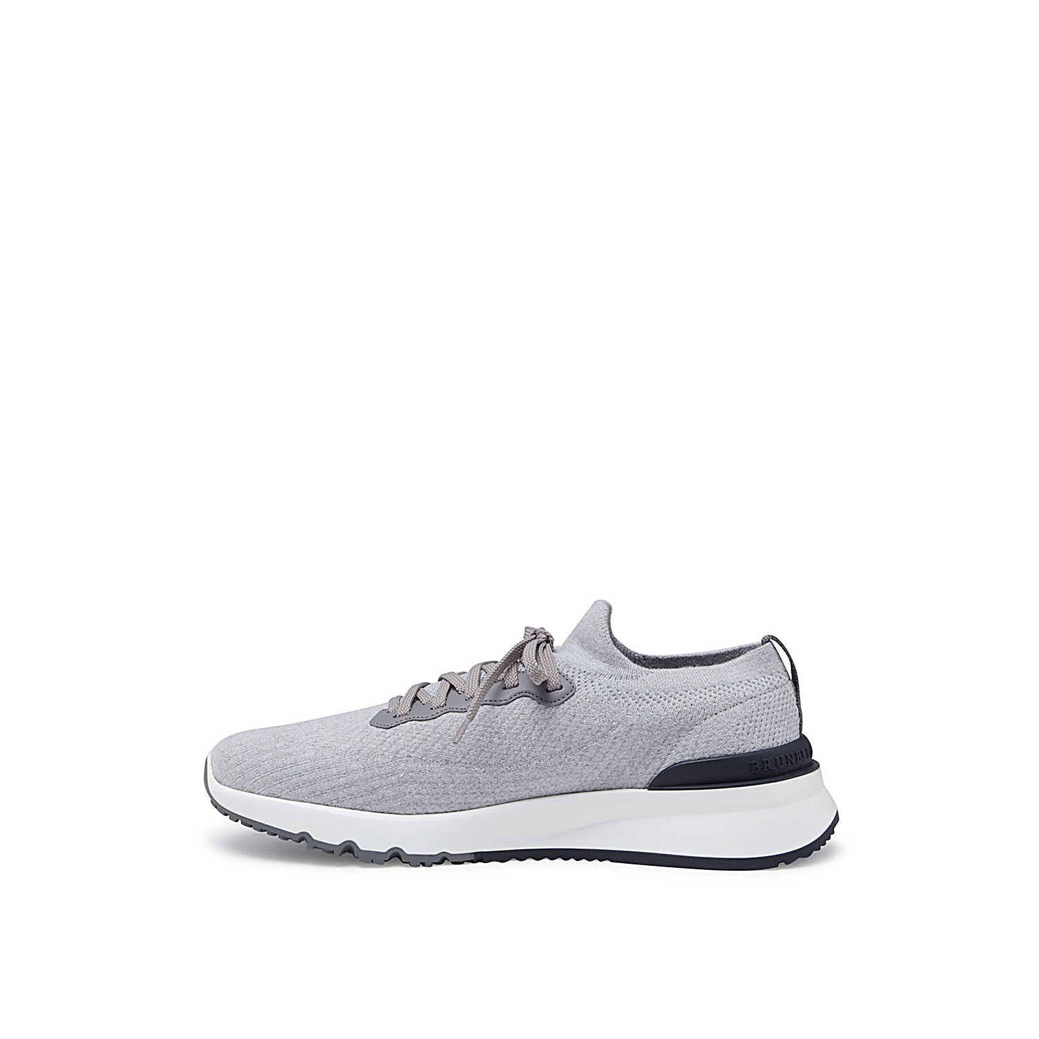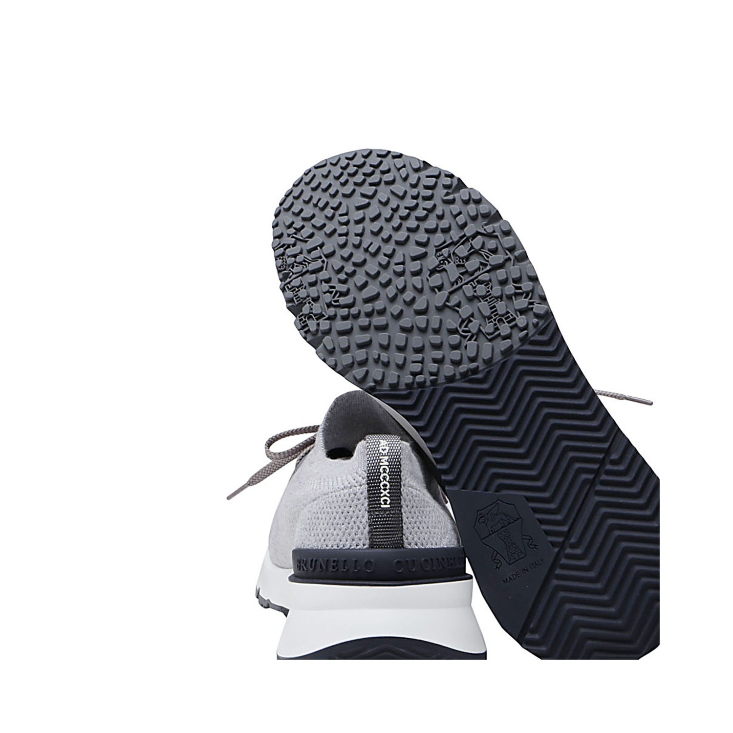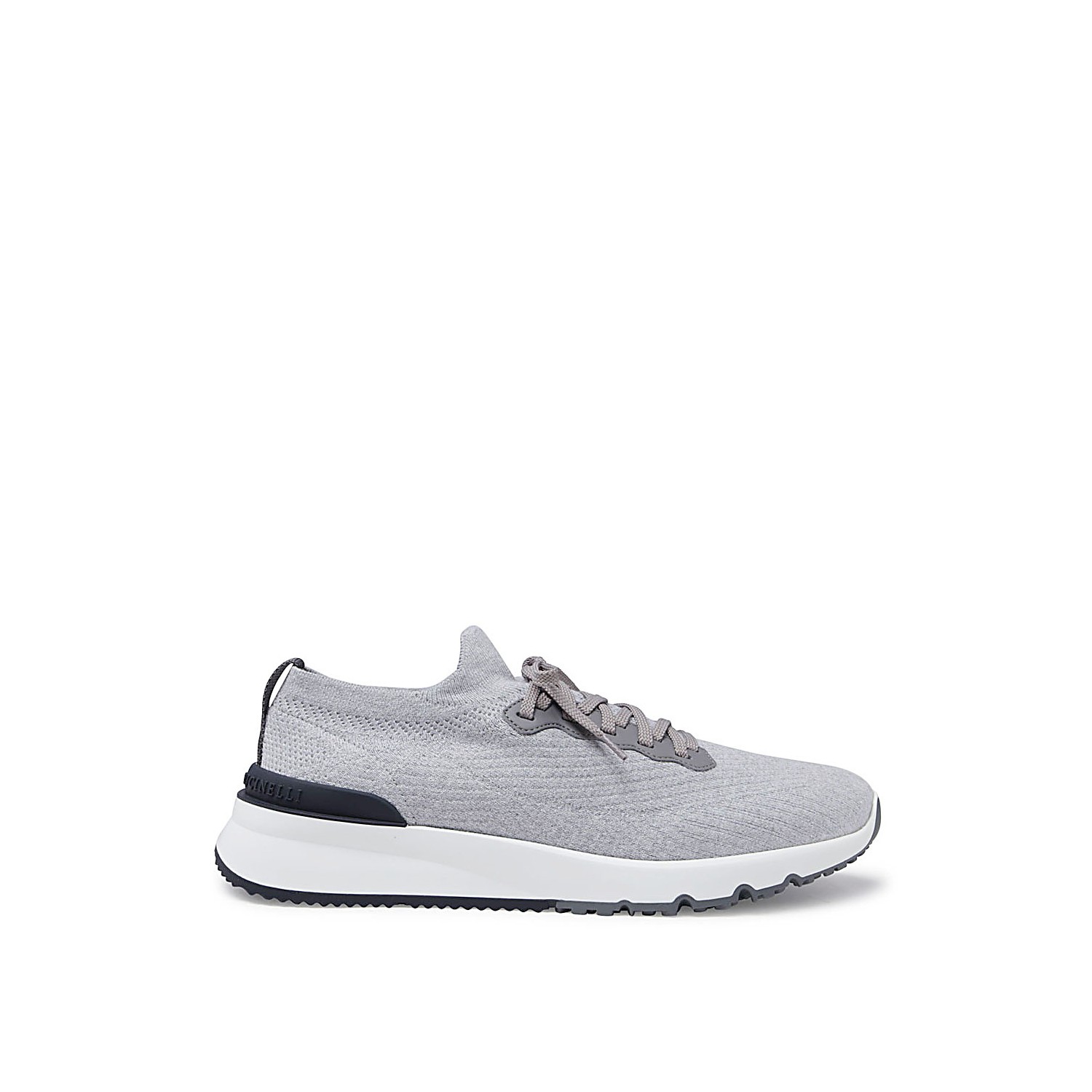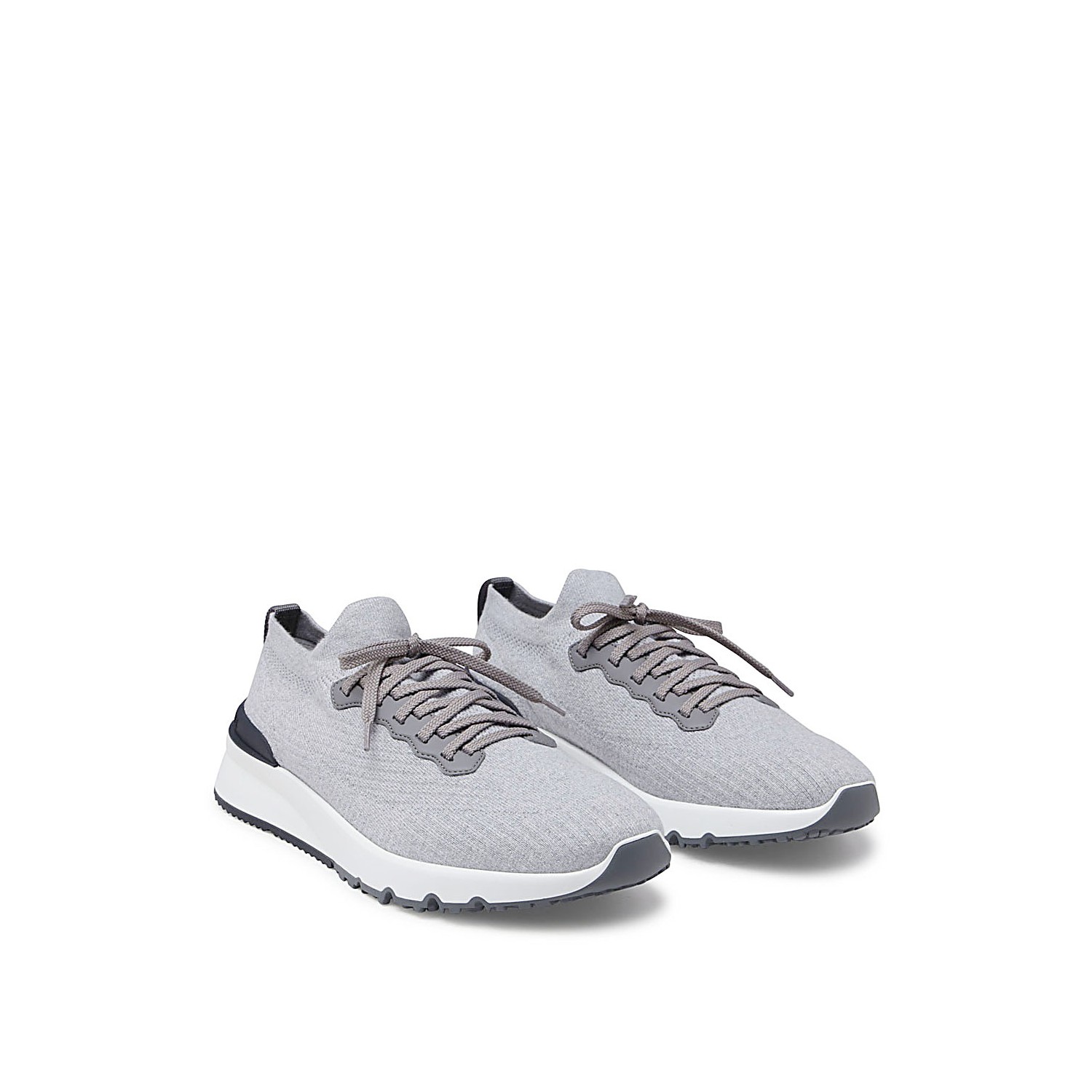 Grey cotton sneakers from Brunello Cucinelli featuring a round toe, front lace-up fastening, knitted design and ridged rubber sole.