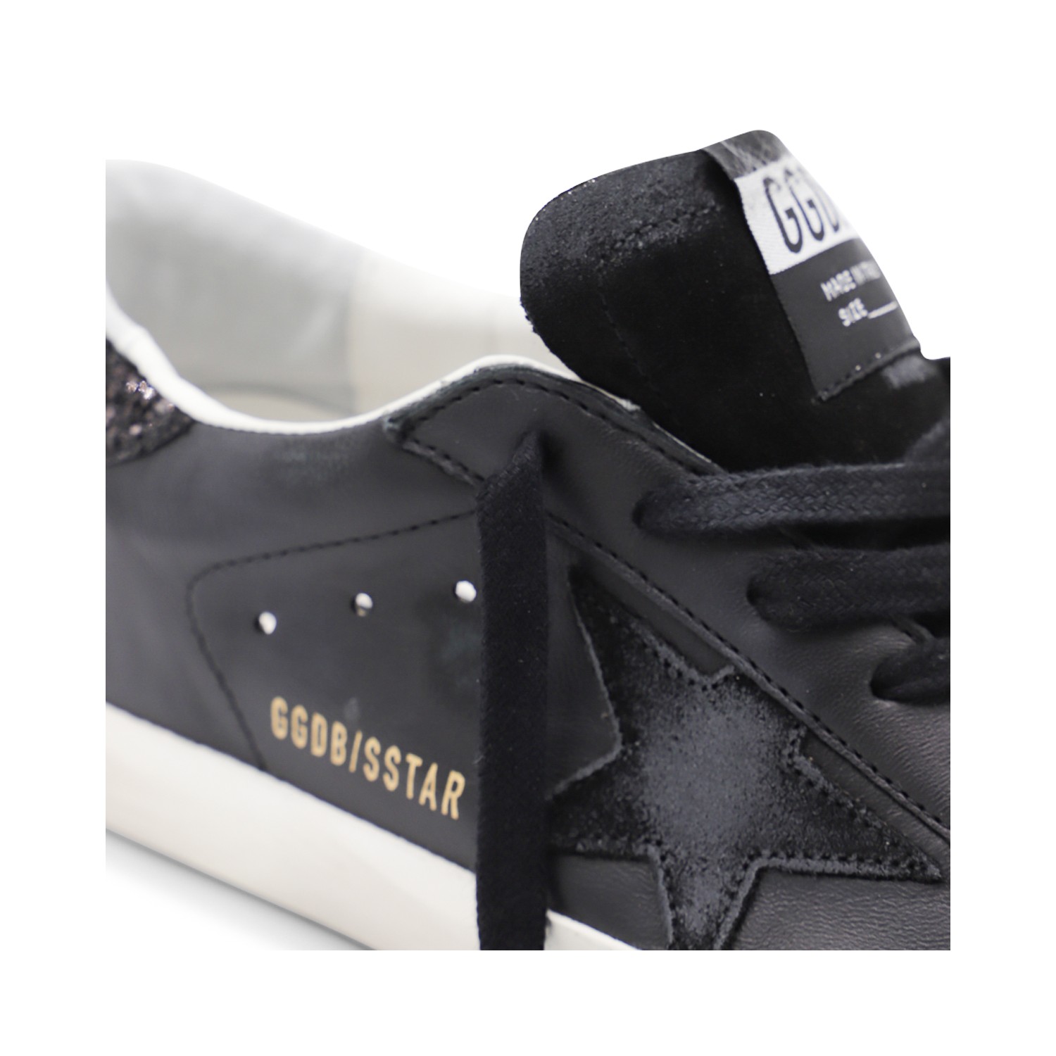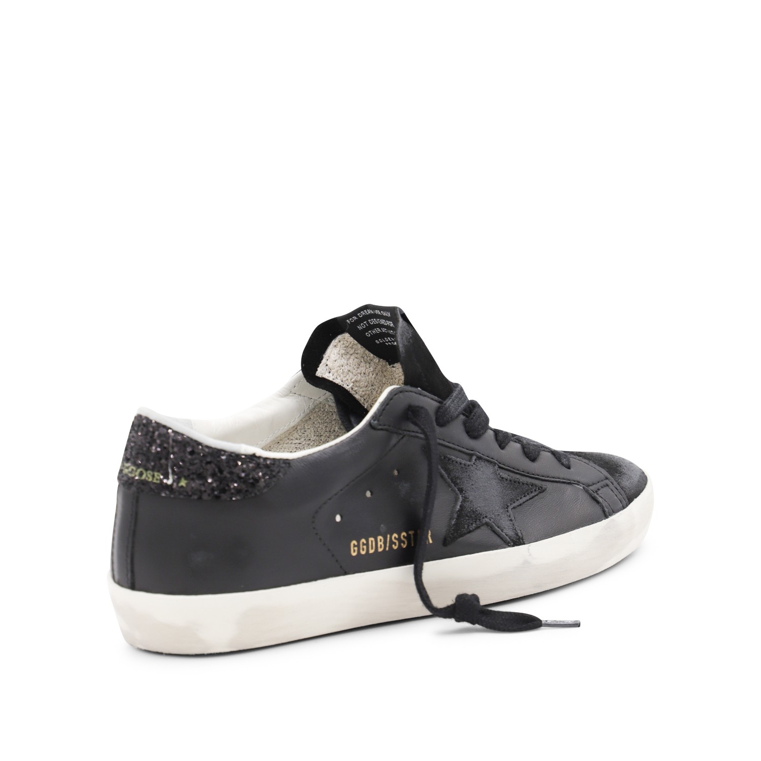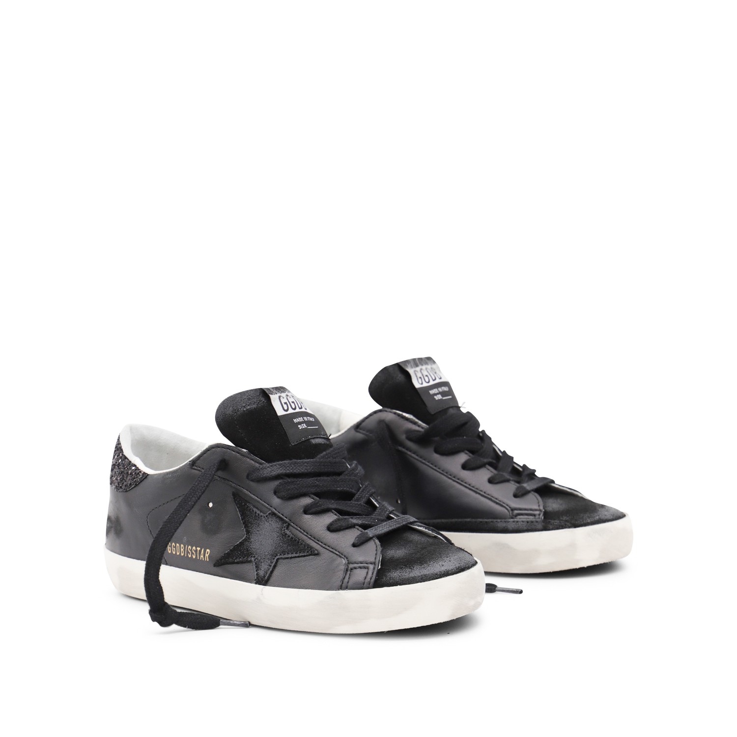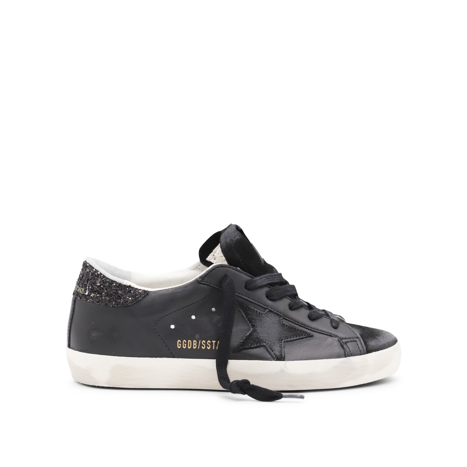 Black leather Super Star sneakers from Golden Goose featuring round toe, cotton laces fastening, suede details on the heel, rubber sole, branded insole, logo and star patch.