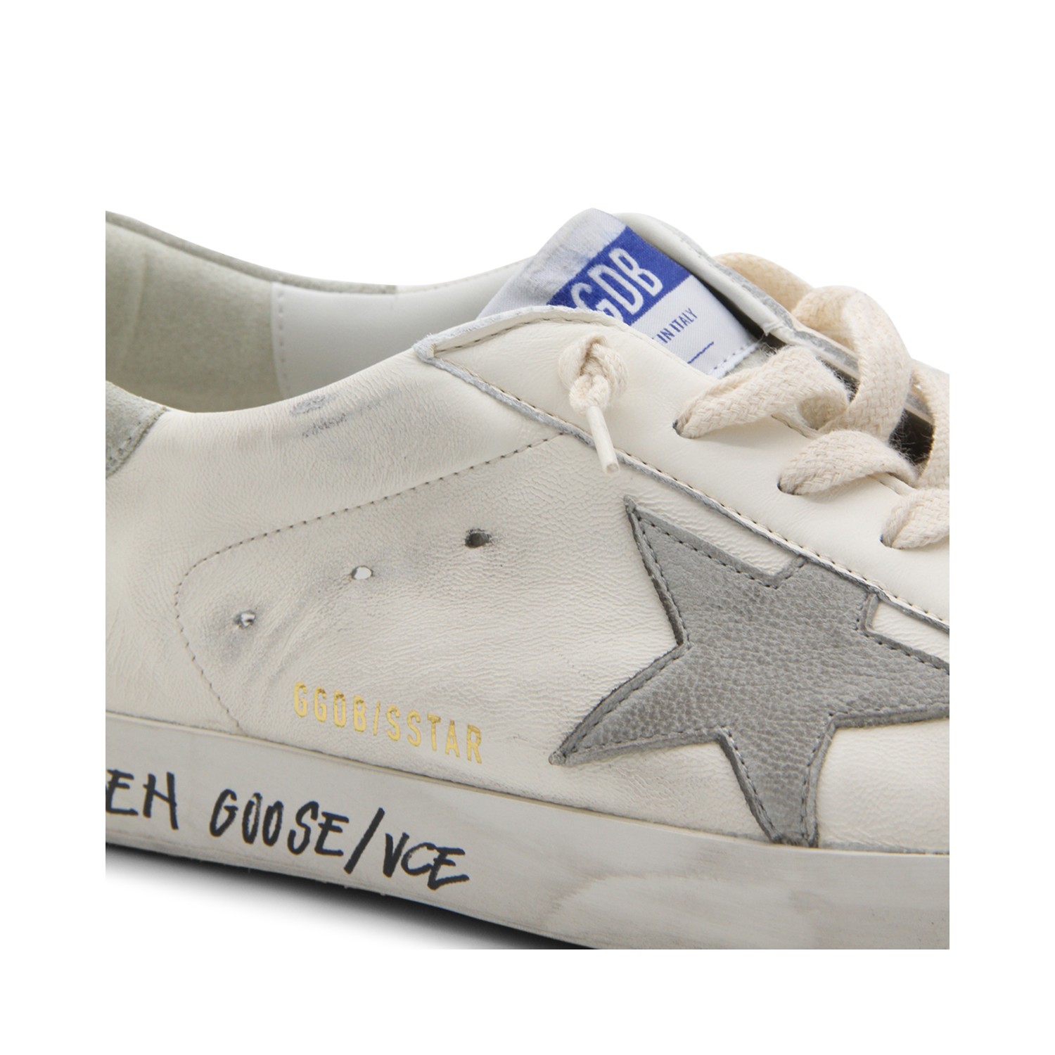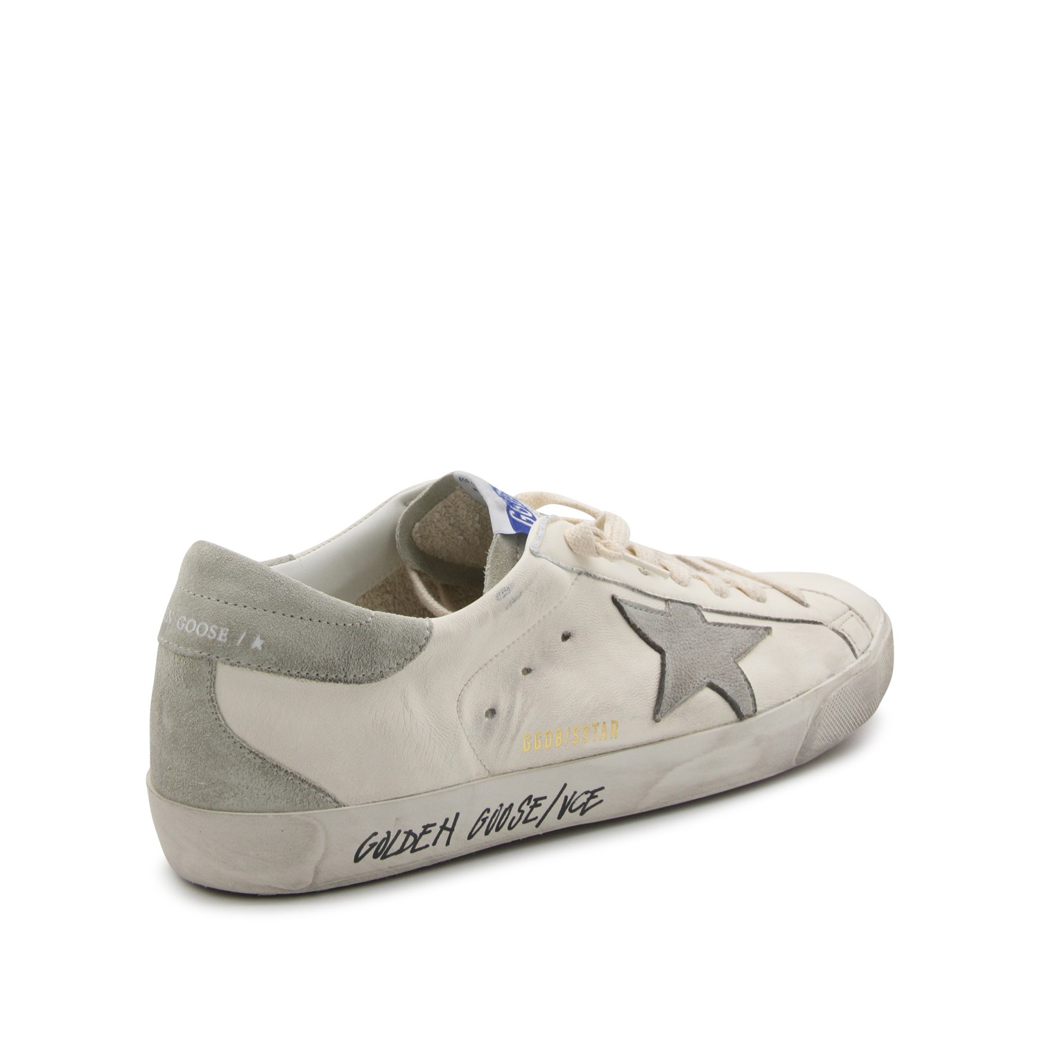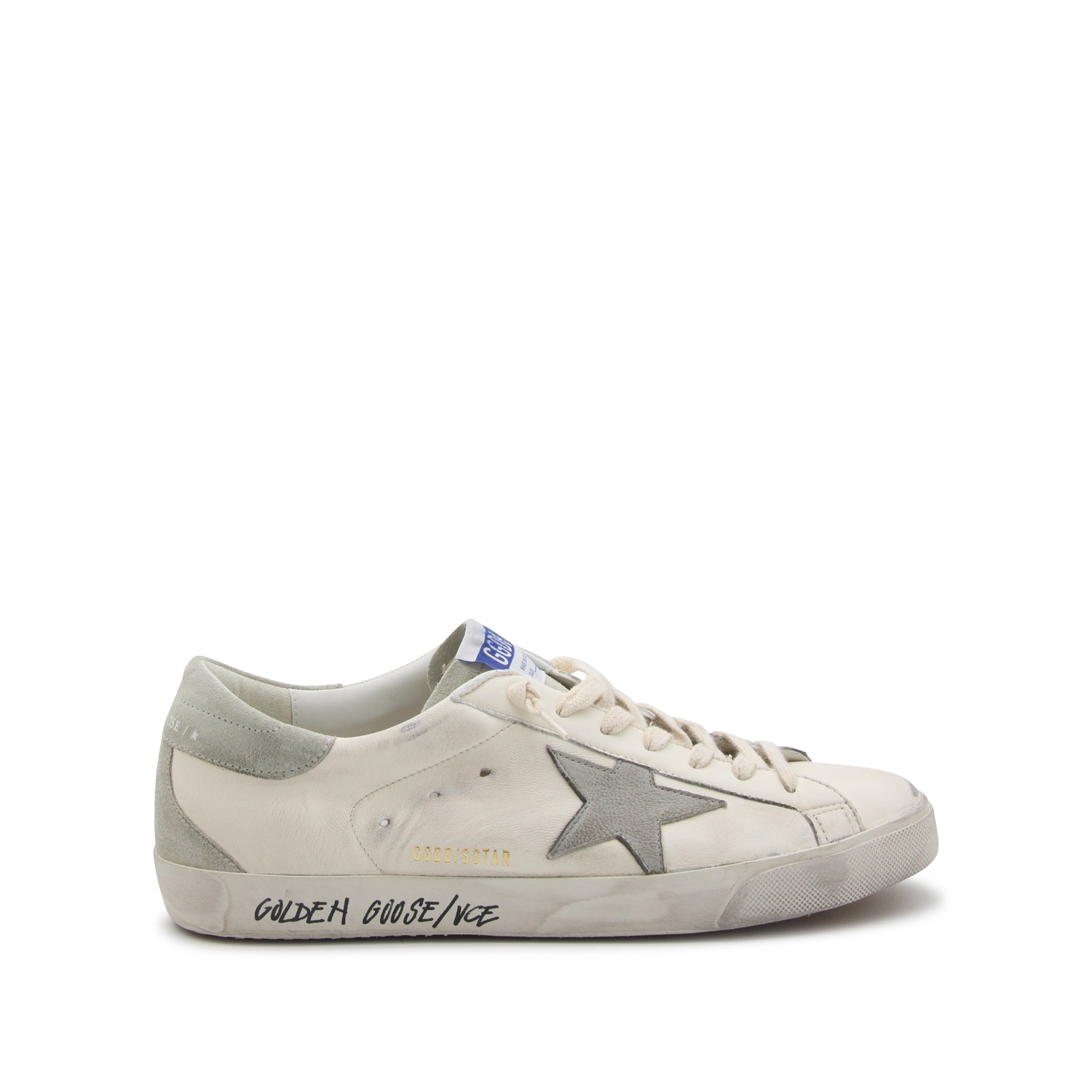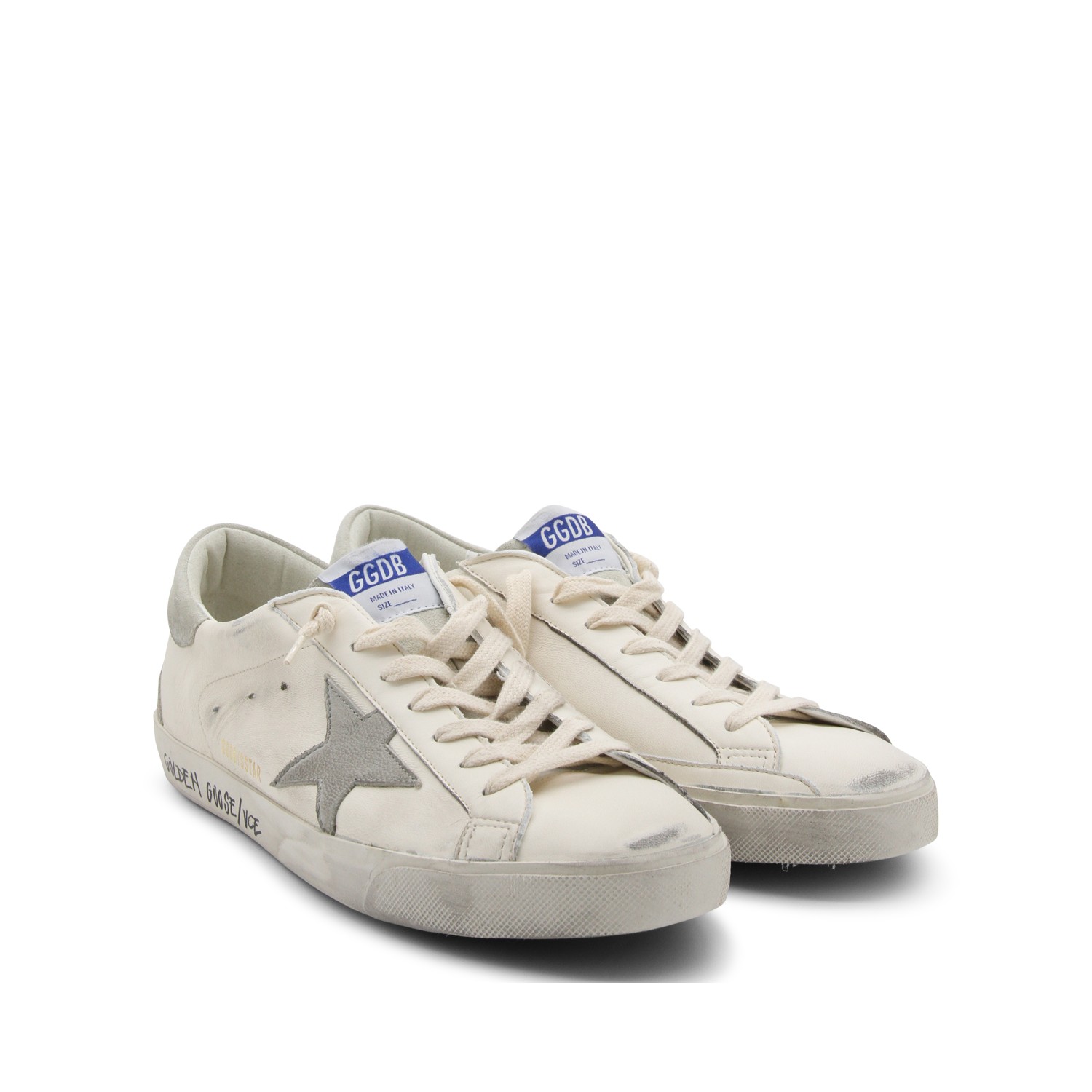 White and grey leather sneakers from Golden Goose featuring round toe, cotton laces, lateral logo and leather sole.
