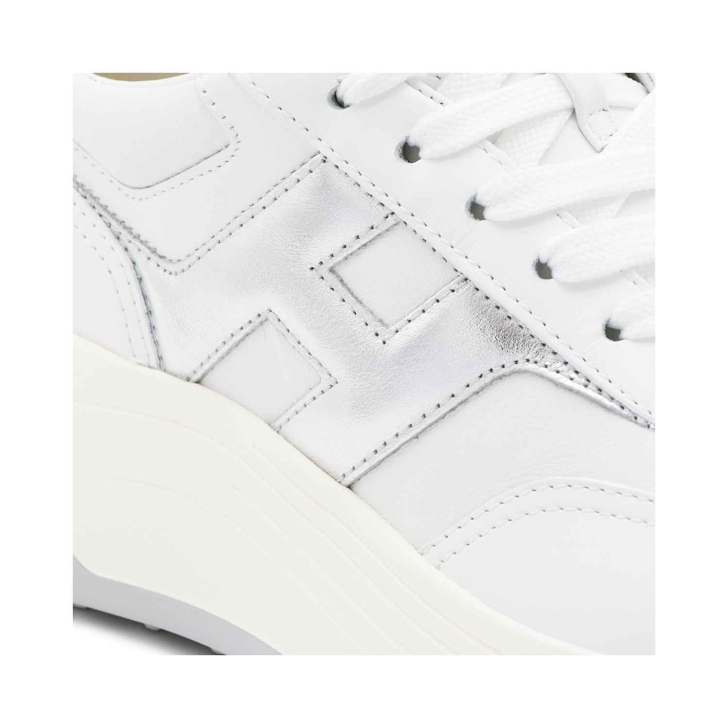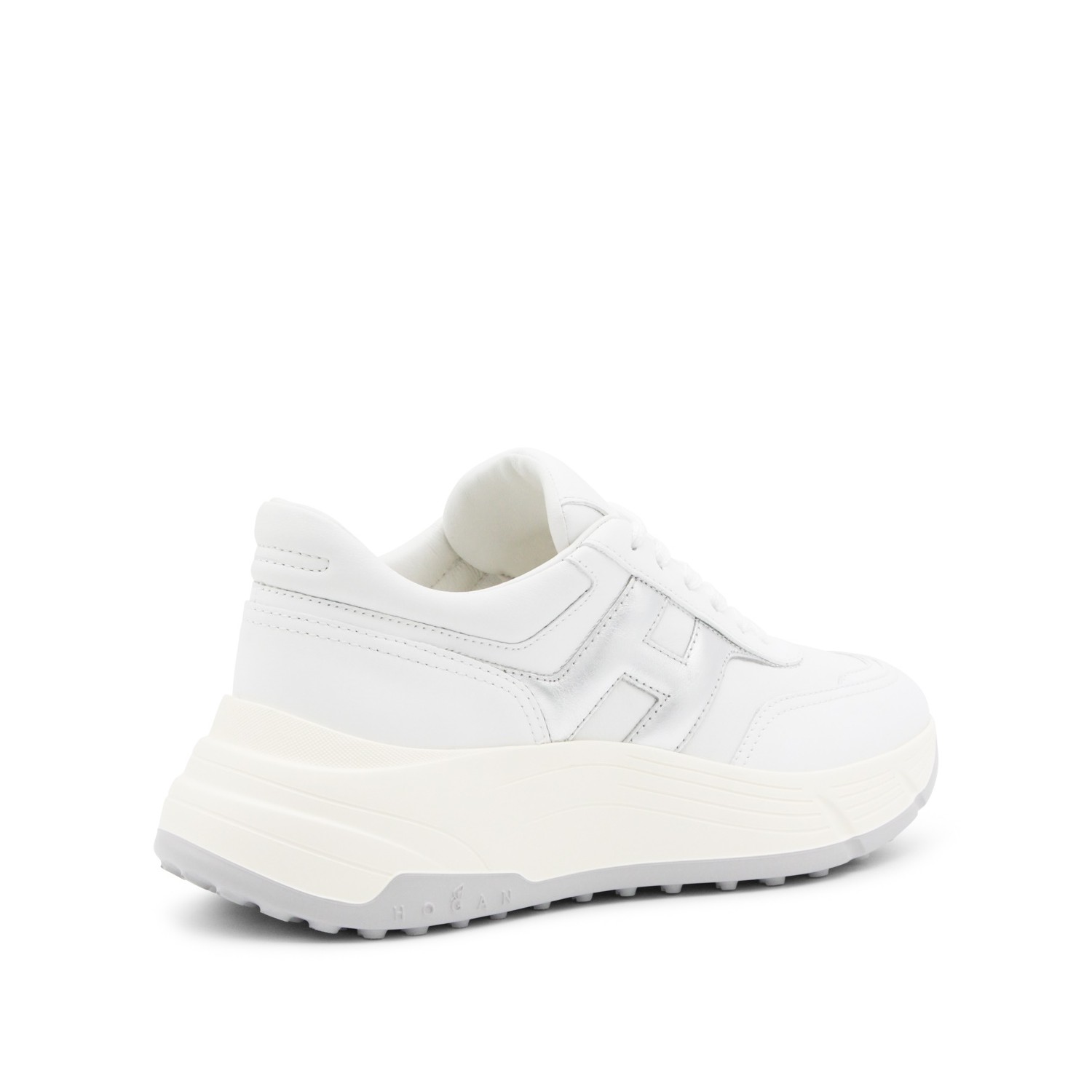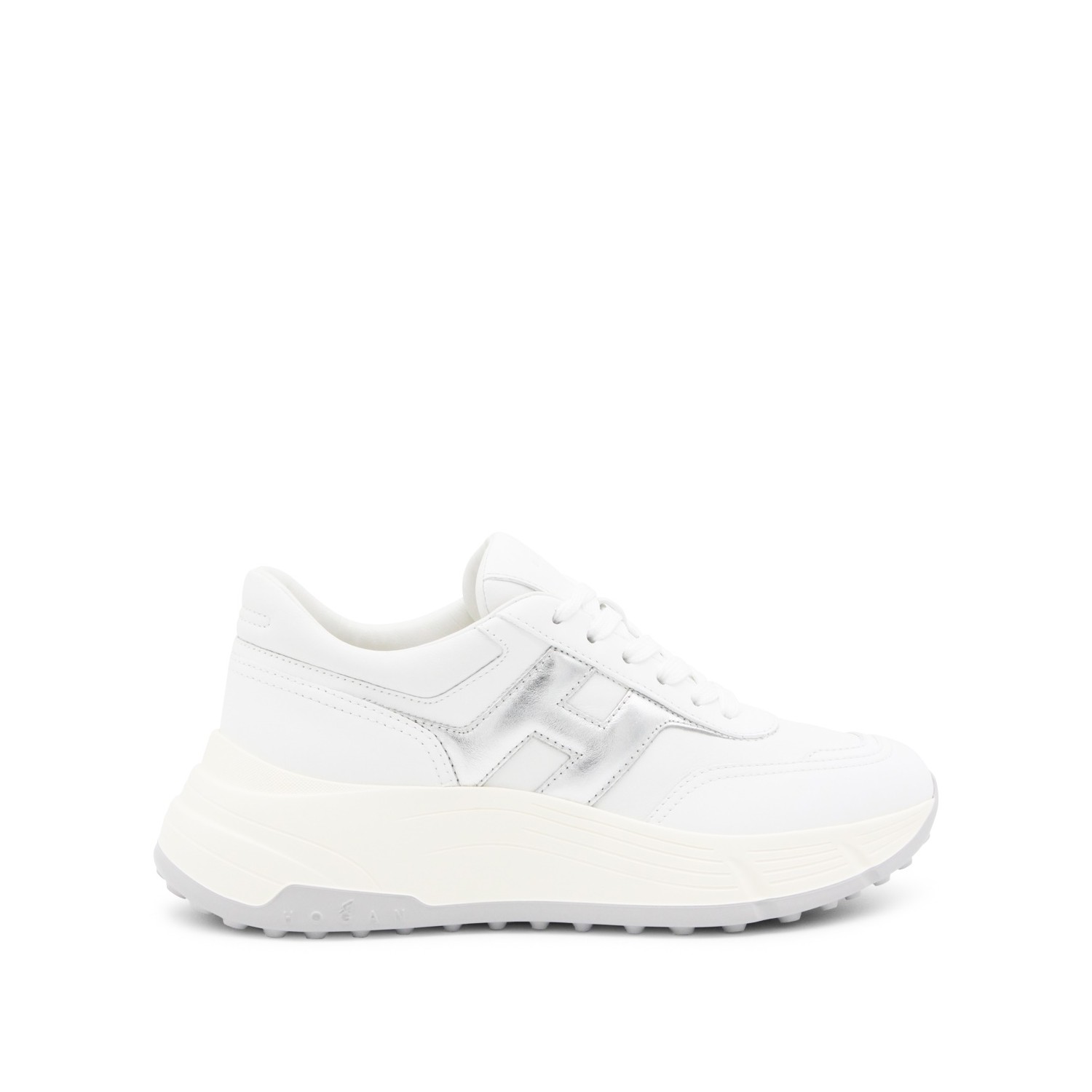 White and silver leather sneakers from Hogan featuring round toe, laces fastening, leather sole and lateral logo.