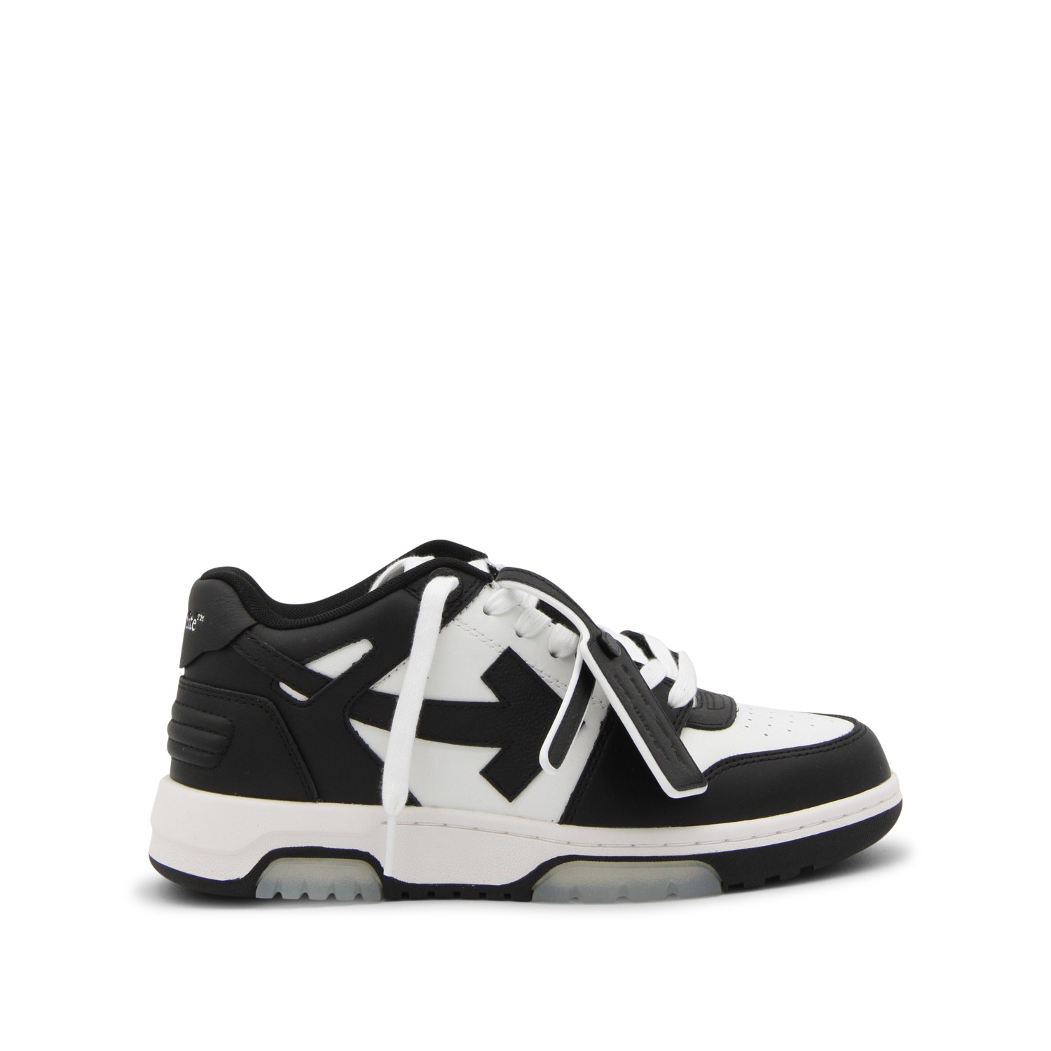 Black and white leather Out Of Office sneakers from Off White featuring round toe, cotton laces, rubber sole, logo label, Arrow contrasting detail at side and logo signature on the heel.