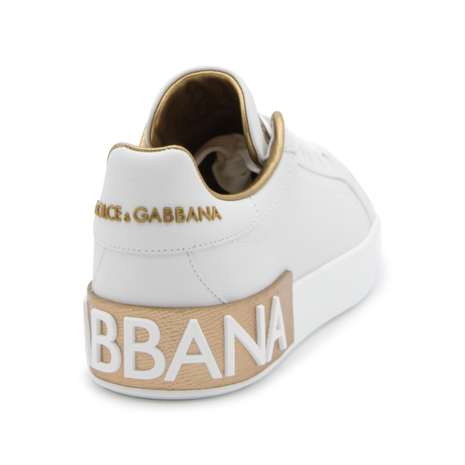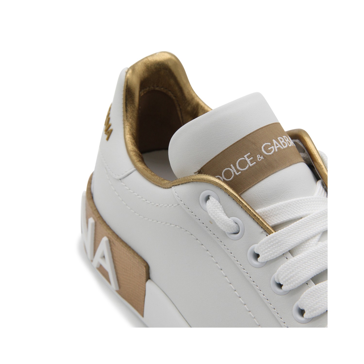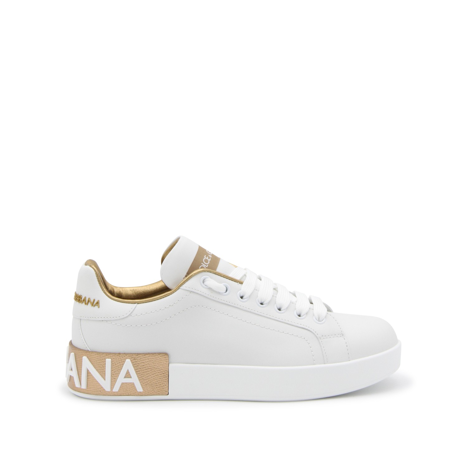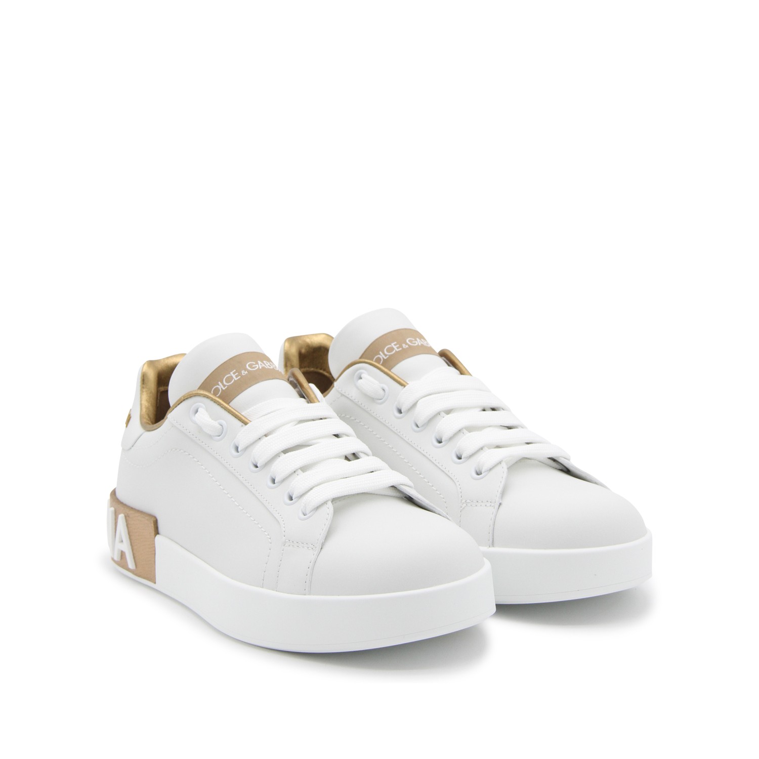 White leather Portofino sneakers featuring branded heel counter, logo patch at the tongue, round toe, front lace-up fastening, flat rubber sole and logo patch at the heel.
