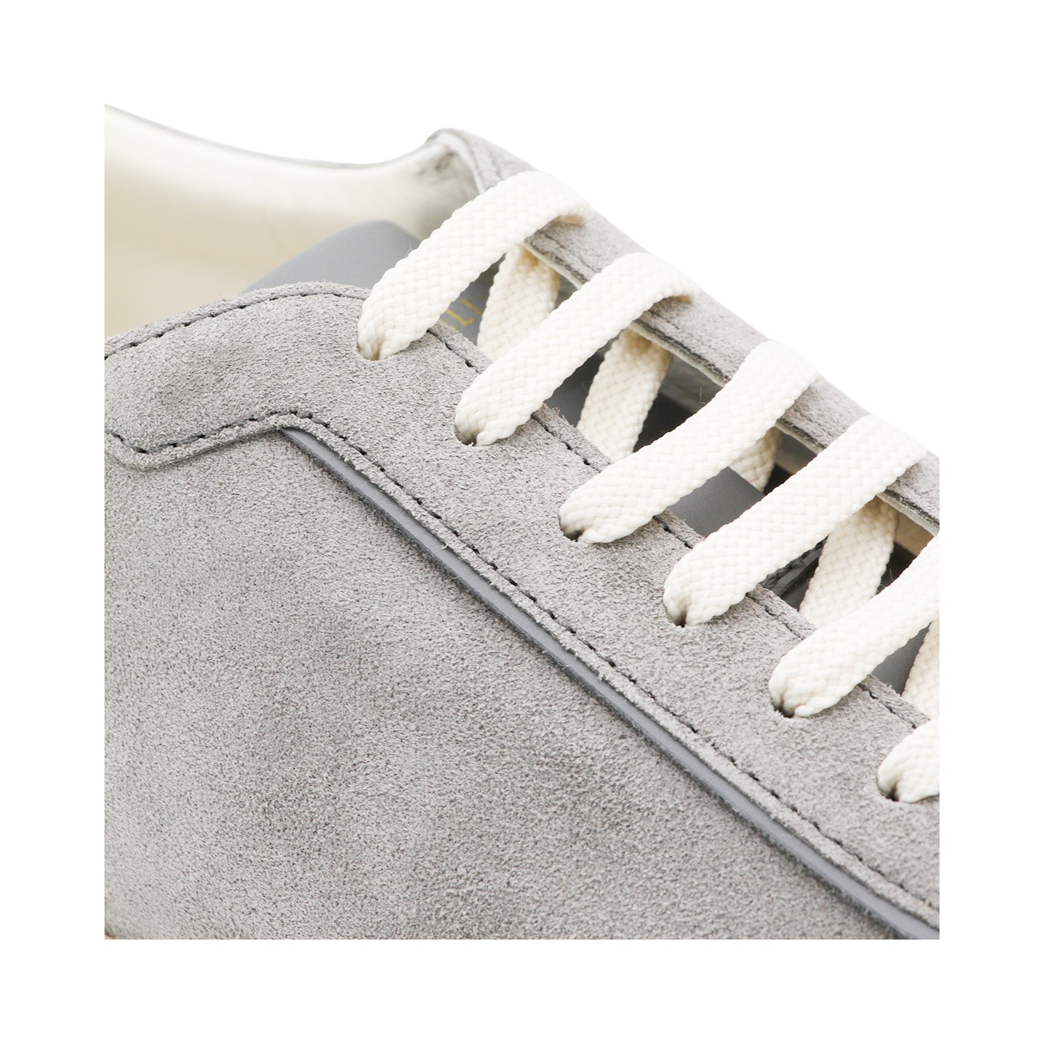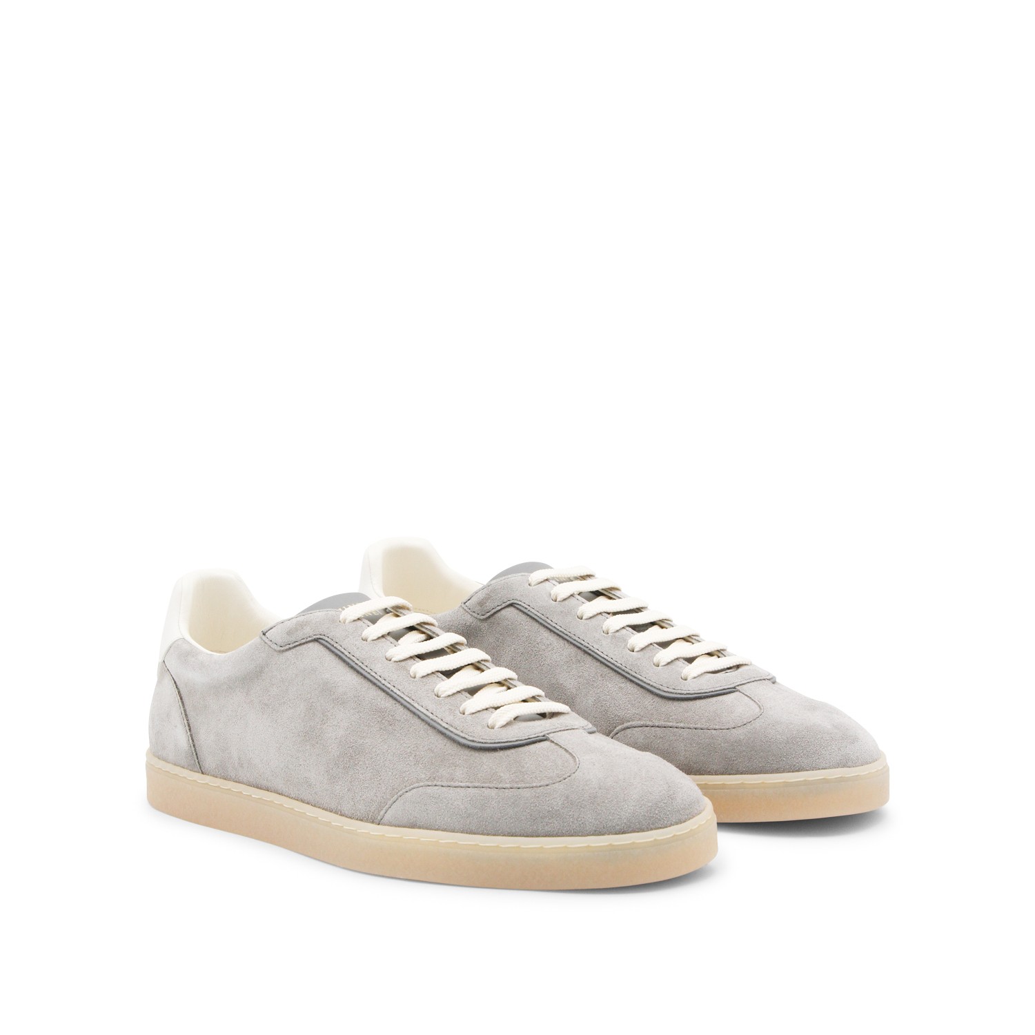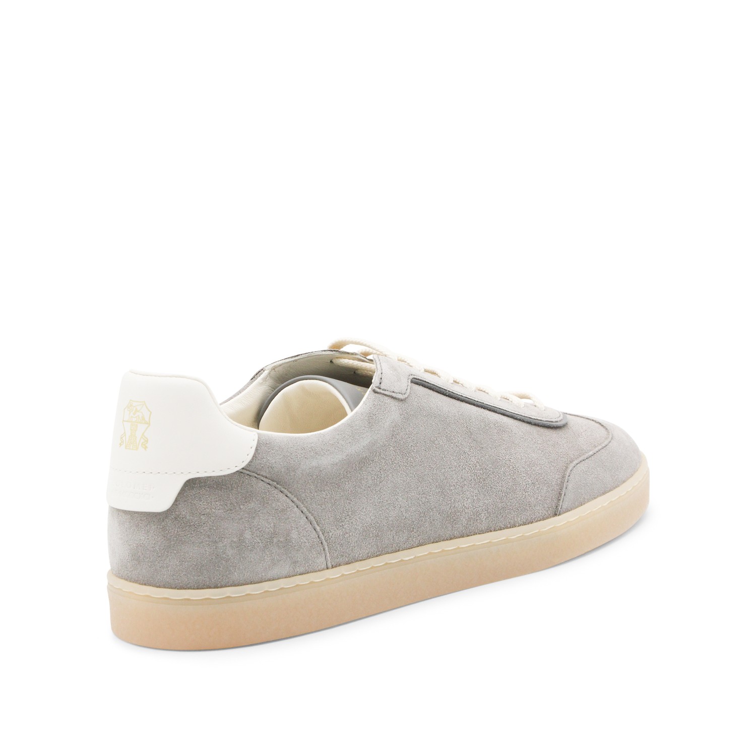 Grey leather sneakers from Brunello Cucinelli featuring round toe, lace up fastening, back logo, stitching details and rubber sole.