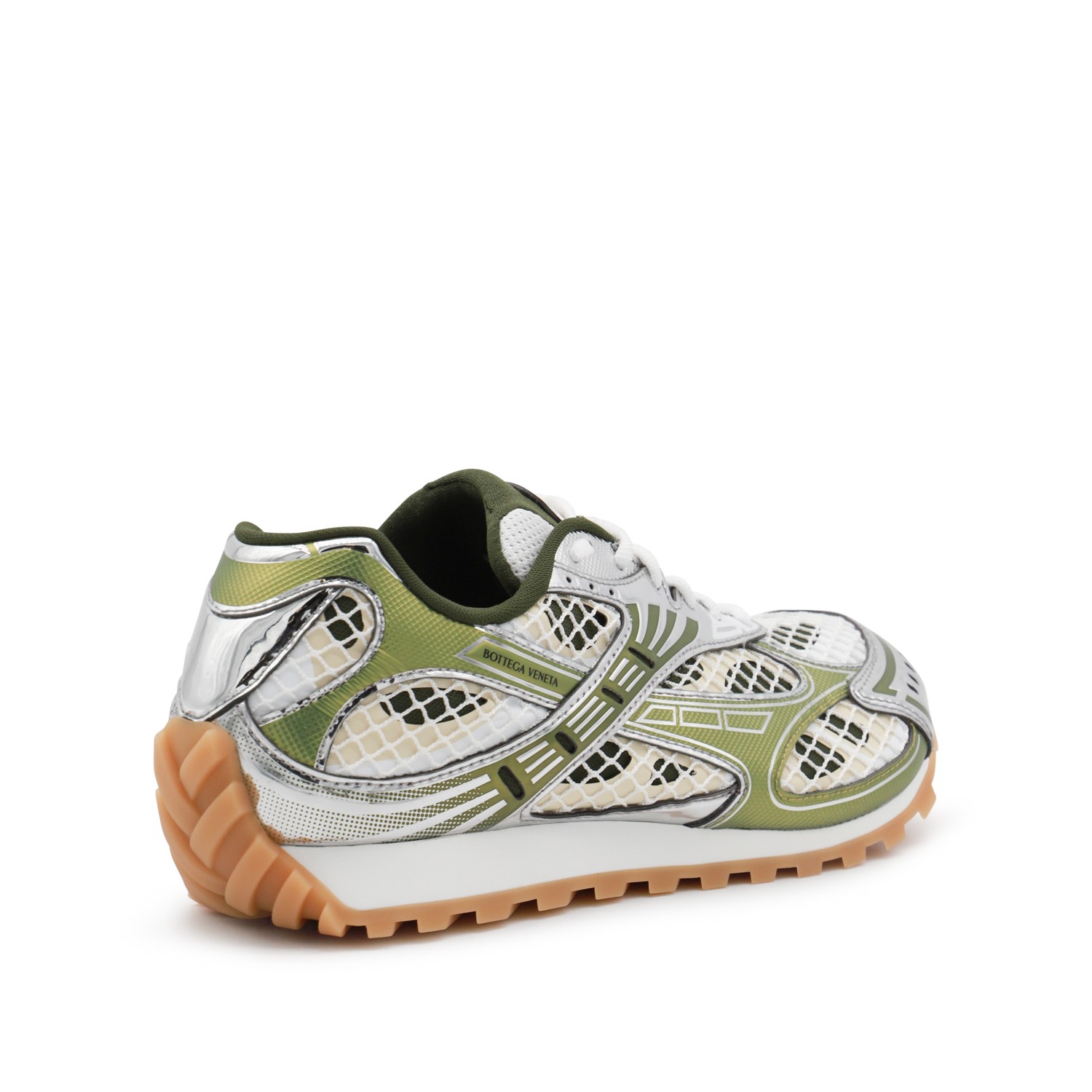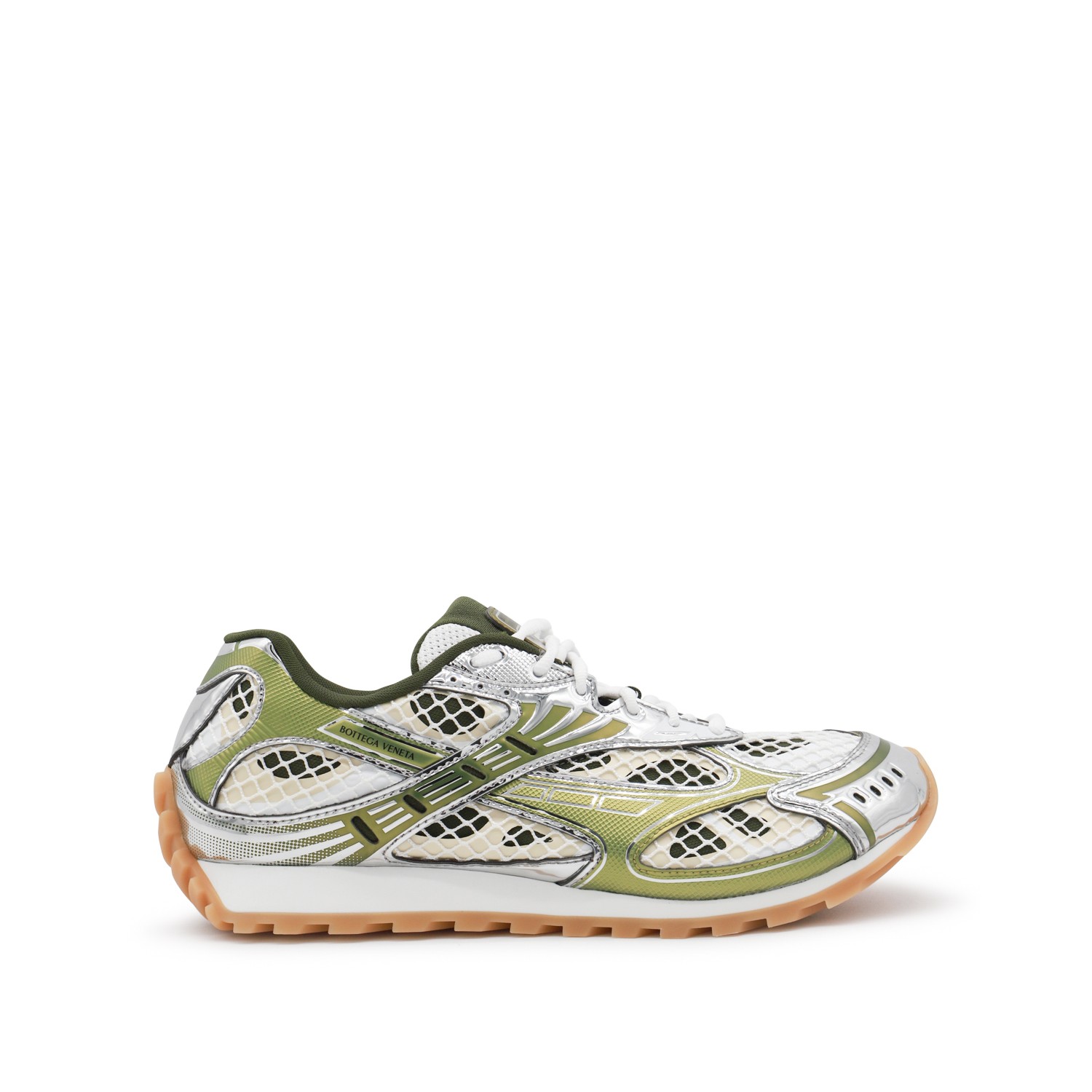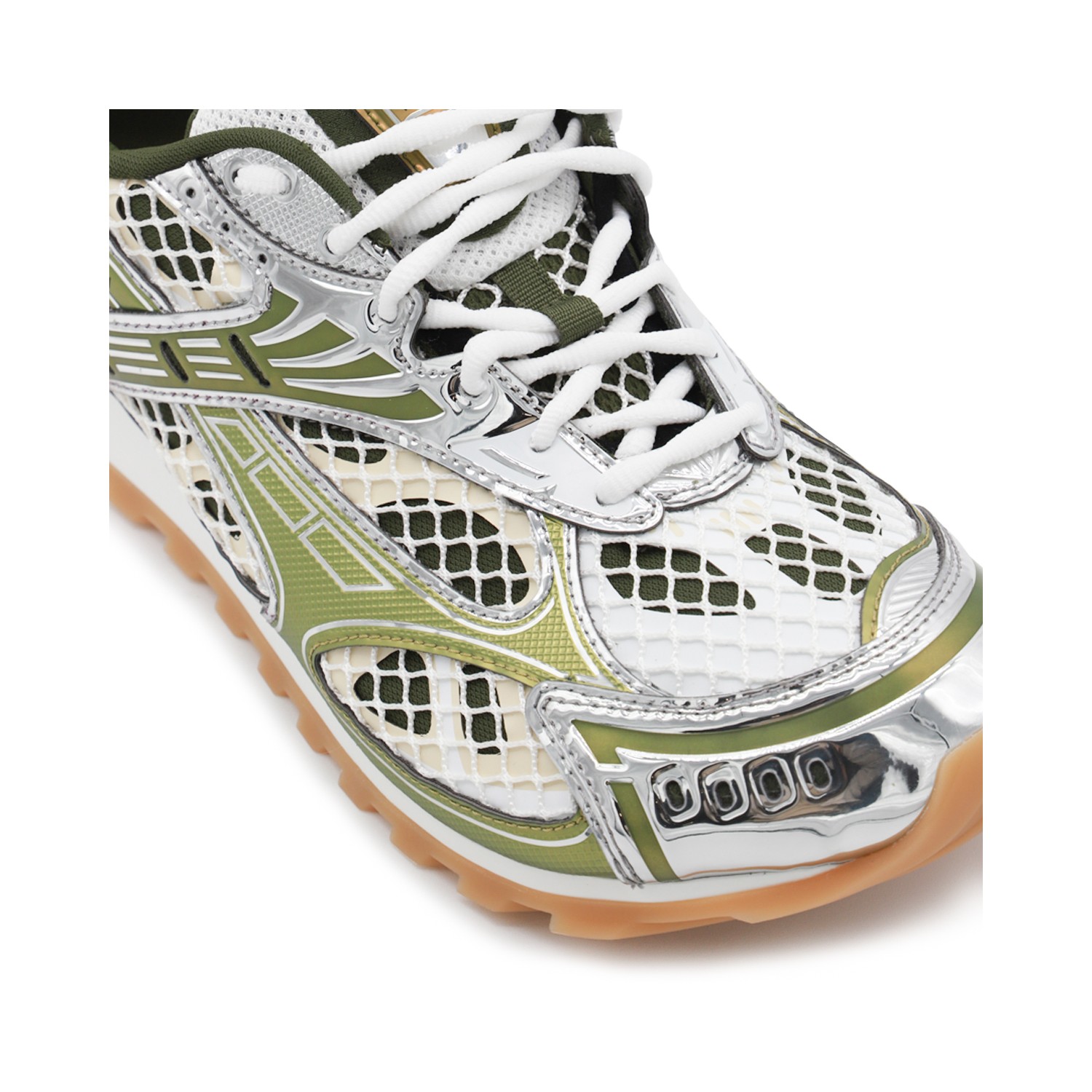 White and green Orbit sneakers from Bottega Veneta featuring round toe, cotton laces fastening, leather sole and details.