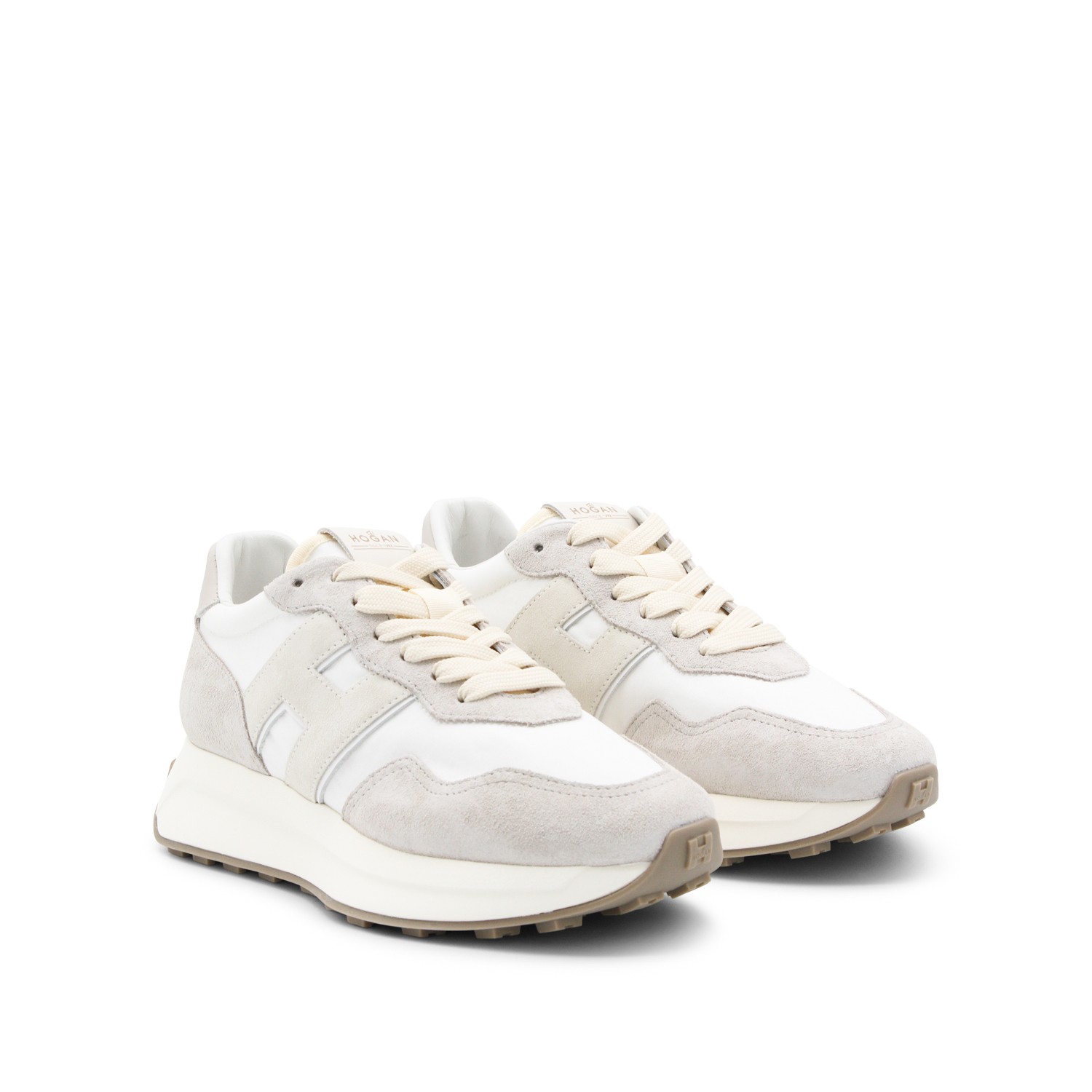 White and beige leather sneakers from Hogan featuring round toe, lace up fastening, lateral logo and rubber sole.