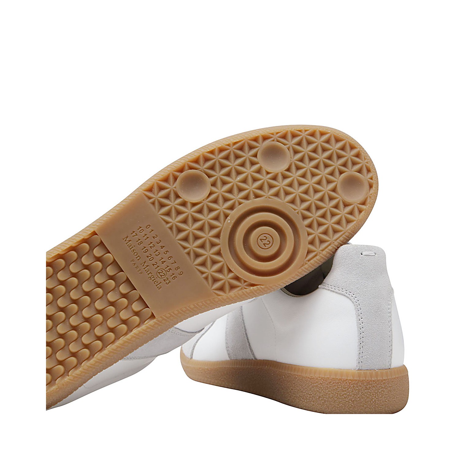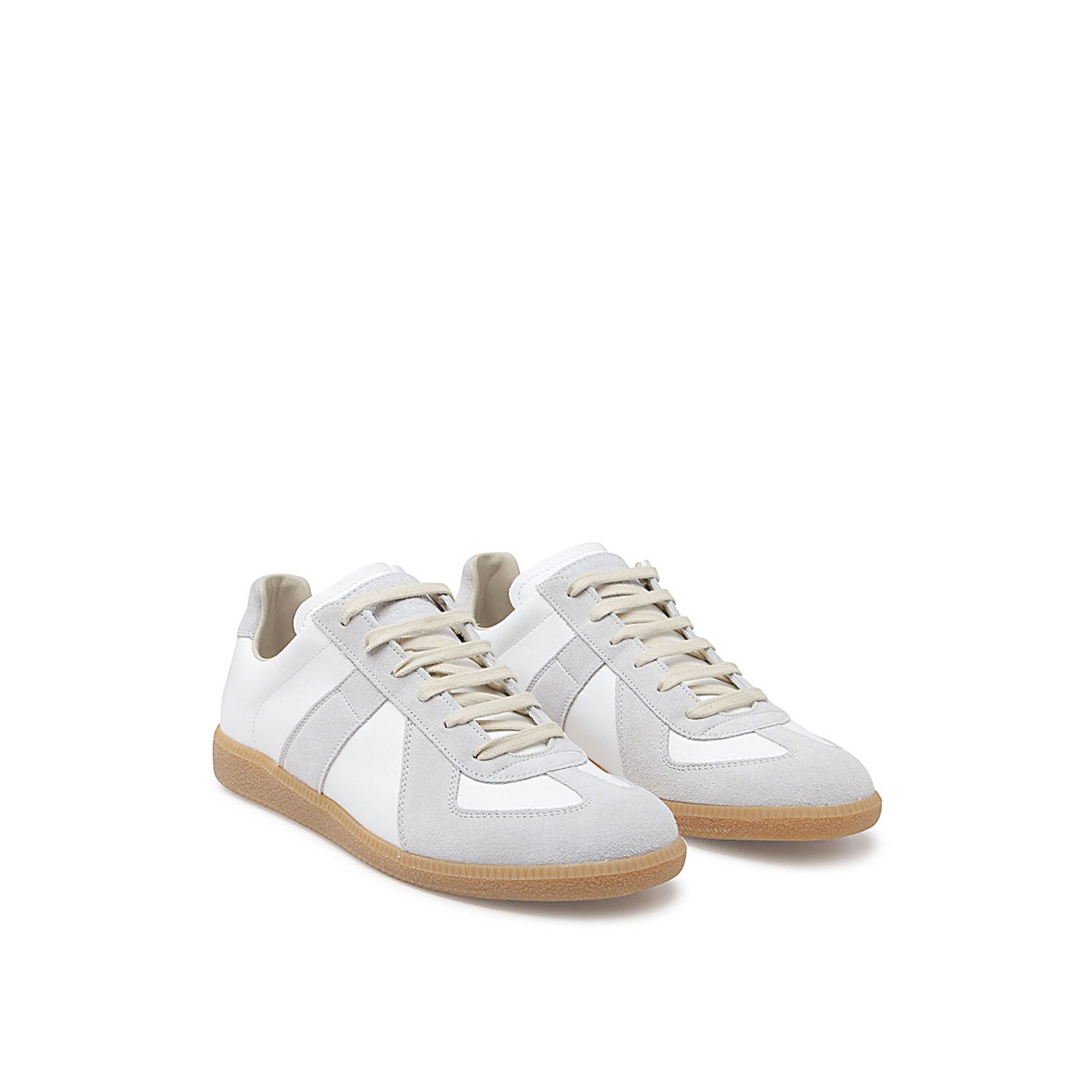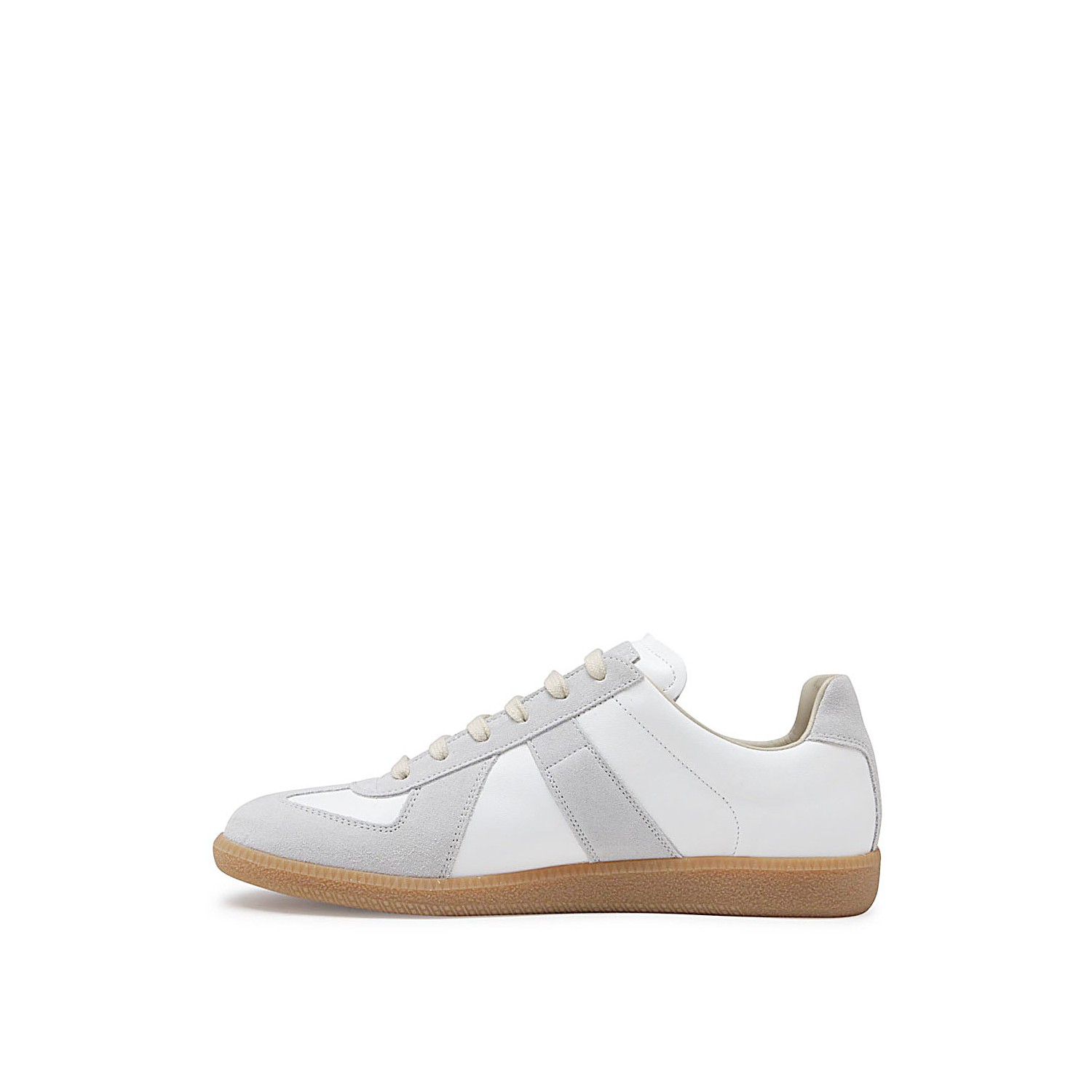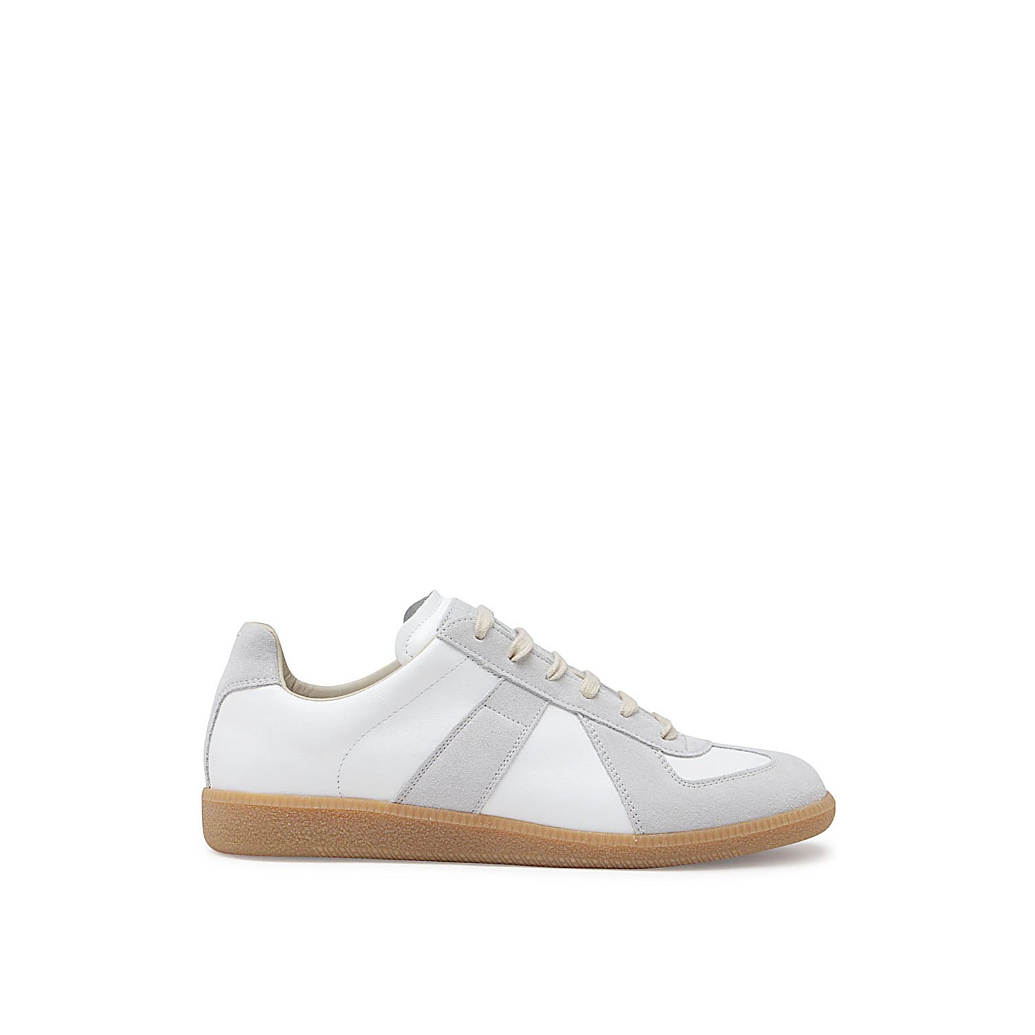 White and grey leather Replica sneakers from Maison Margiela featuring round toe, lace-up fastening, panelled design, branded tongue and flat rubber sole.