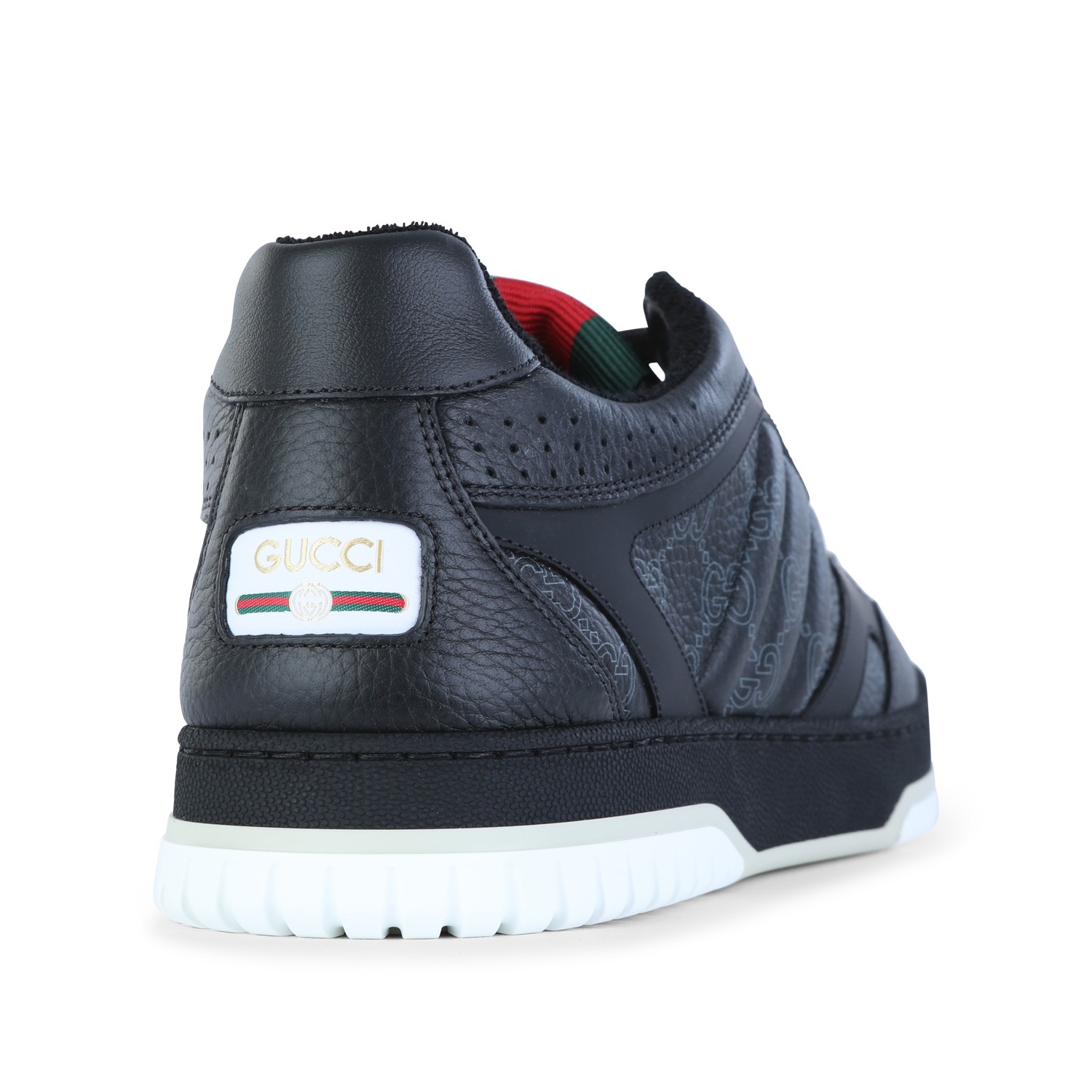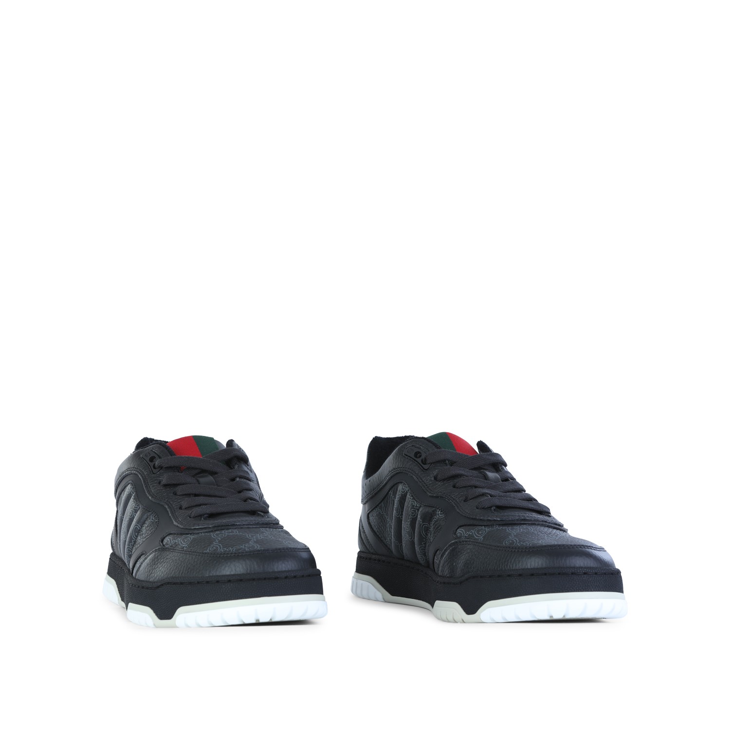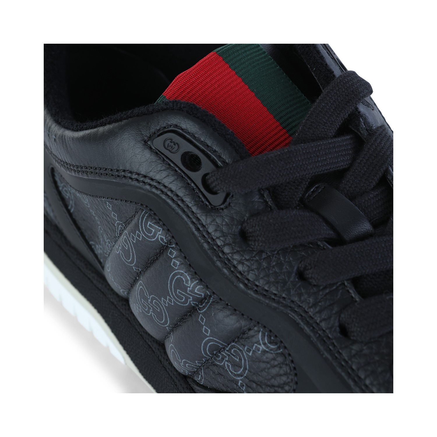 Black leather sneakers from Gucci featuring round toe, lace-up fastening, back logo, all over monogram and contrasting sole.