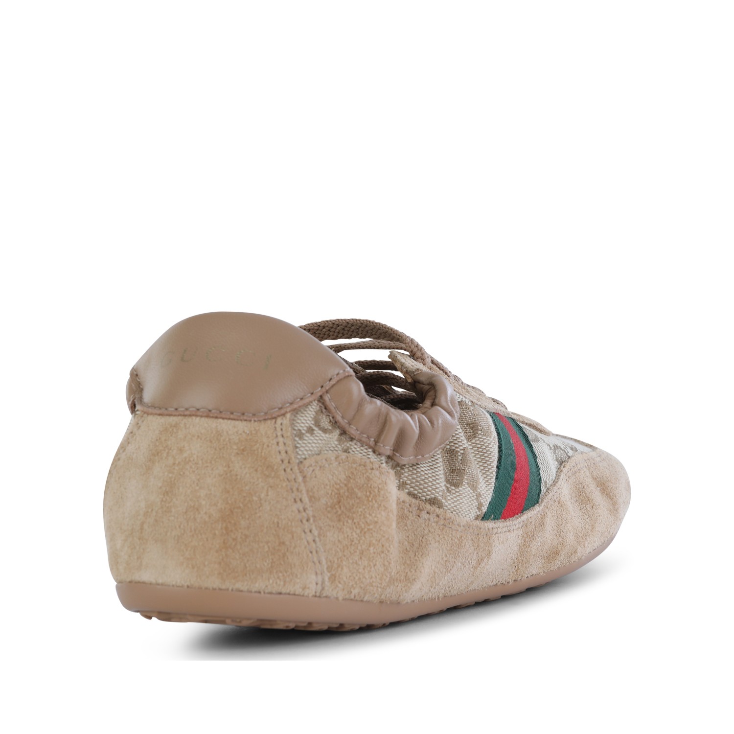 Beige leather sneakers from Gucci featuring round toe, lace-up fastening, elasticated waist, monogram, logo detail and leather sole.