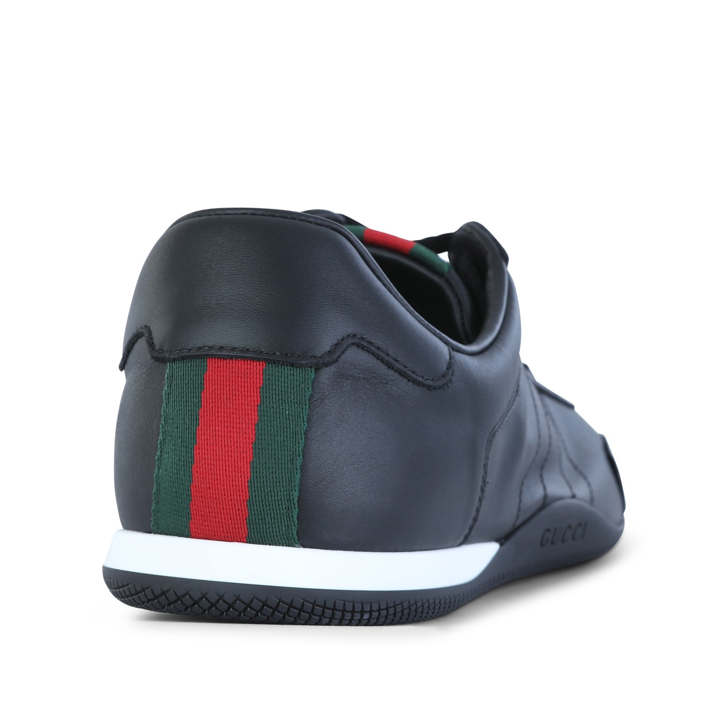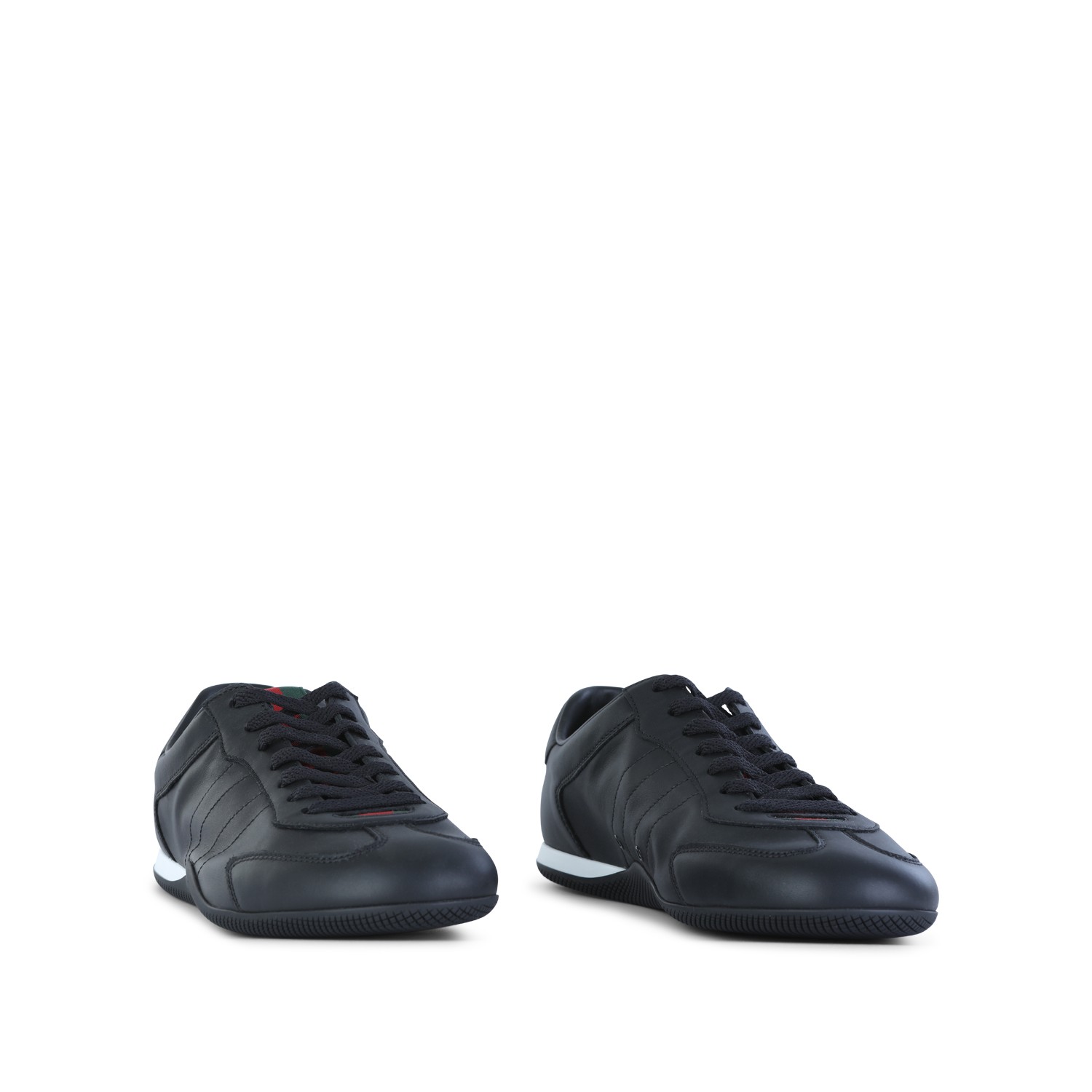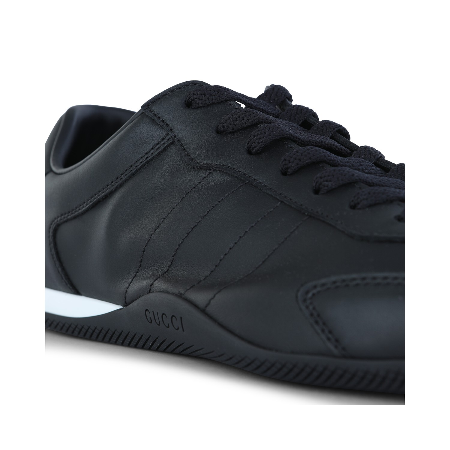 Black leather sneakers from Gucci featuring round toe, lace up fastening, stitching details and leather sole.