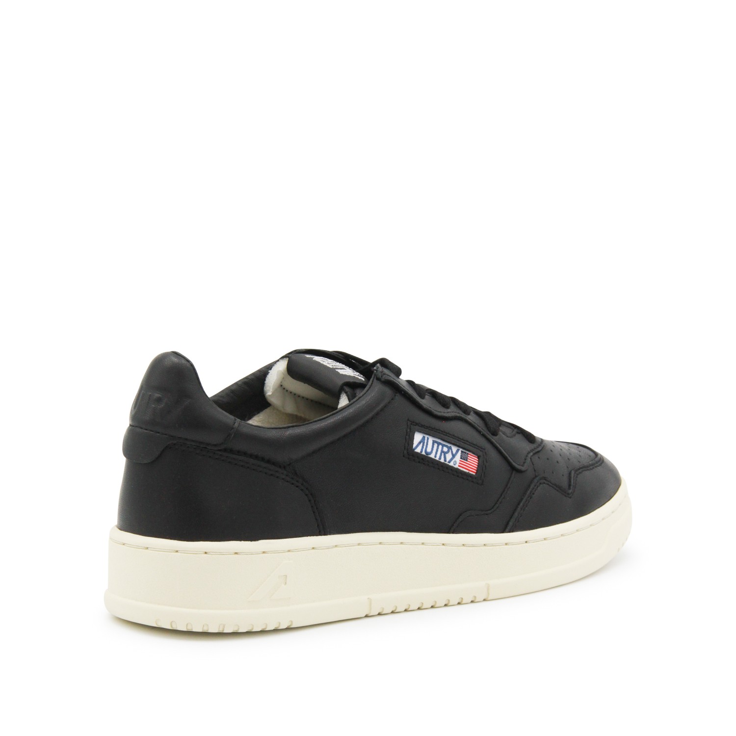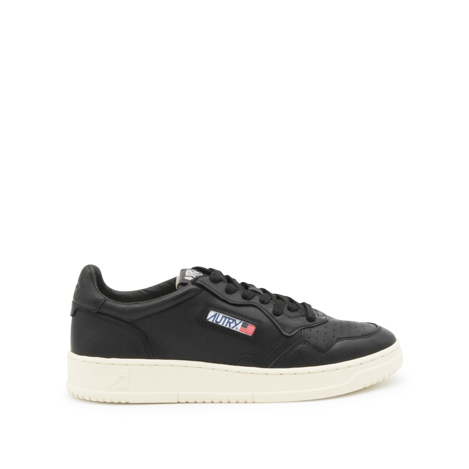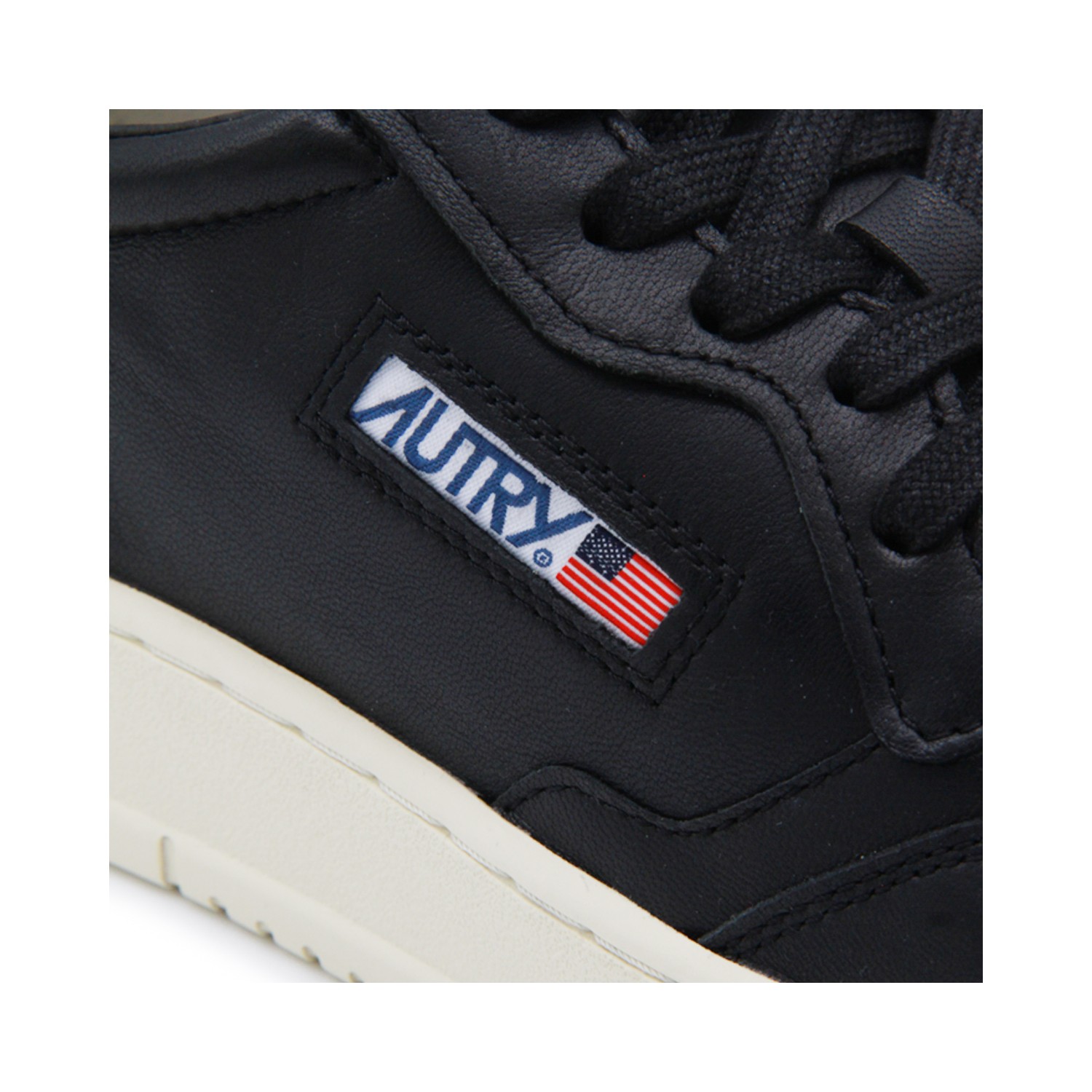 Black leather Medalist sneakers from Autry featuring round toe, lace-up fastening, lateral logo, suede details and flat rubber sole.