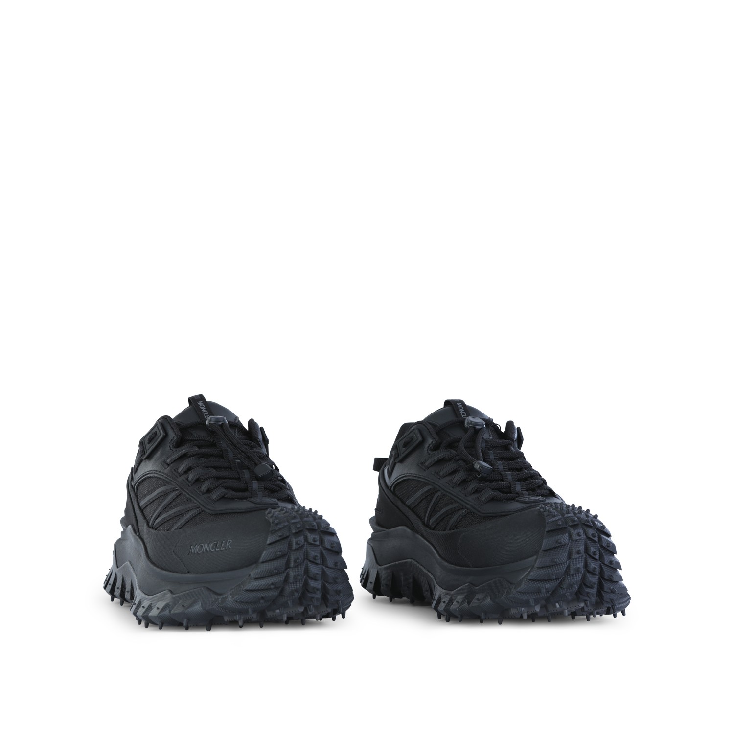 Black leather sneakers from Moncler featuring round toe, lace up fastening, all over details and rubber sole.