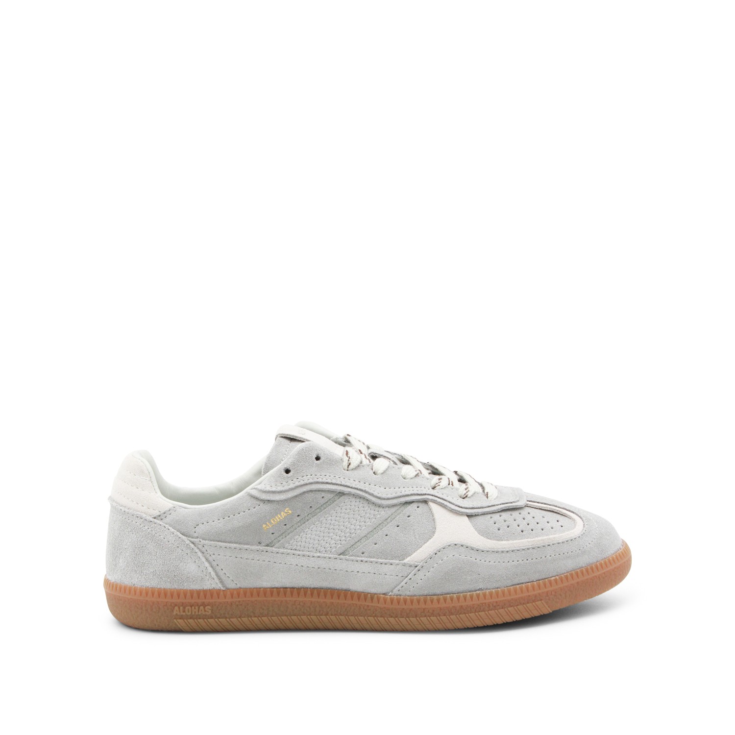 Light grey leather sneakers from Alohas featuring round toe, lace-up fastening, all-over details and rubber sole.