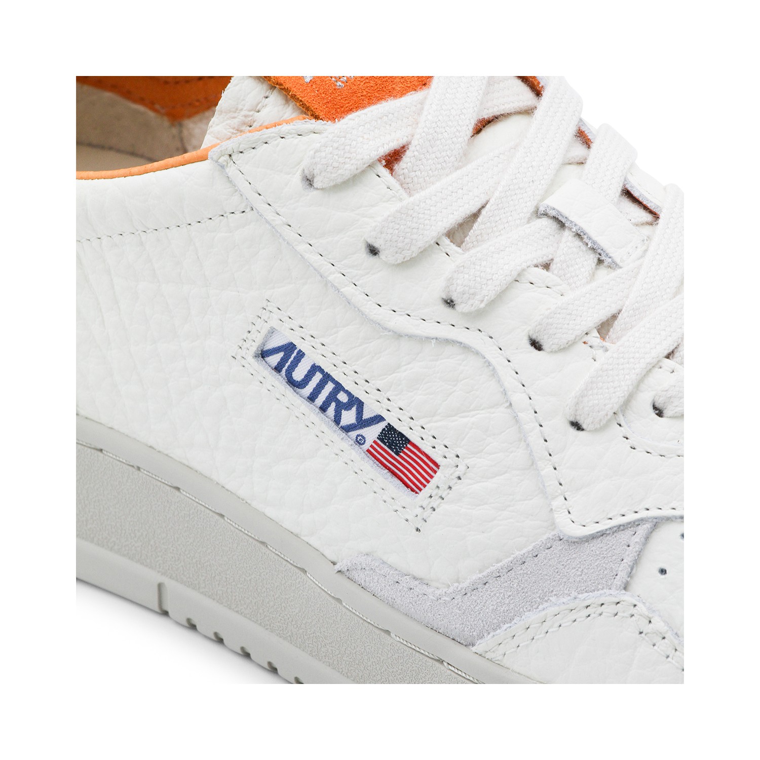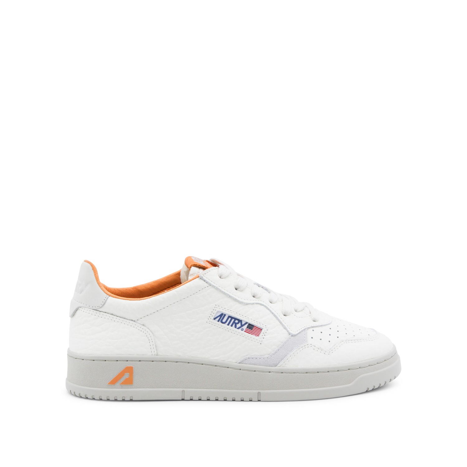 White and orange leather Medalist low sneaker from Autry featuring round toe, rubber sole, cotton laces, logo label and contrasting logo inserts.