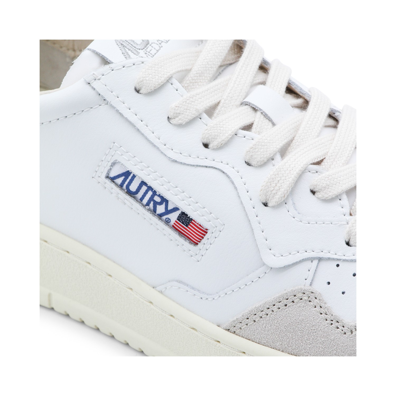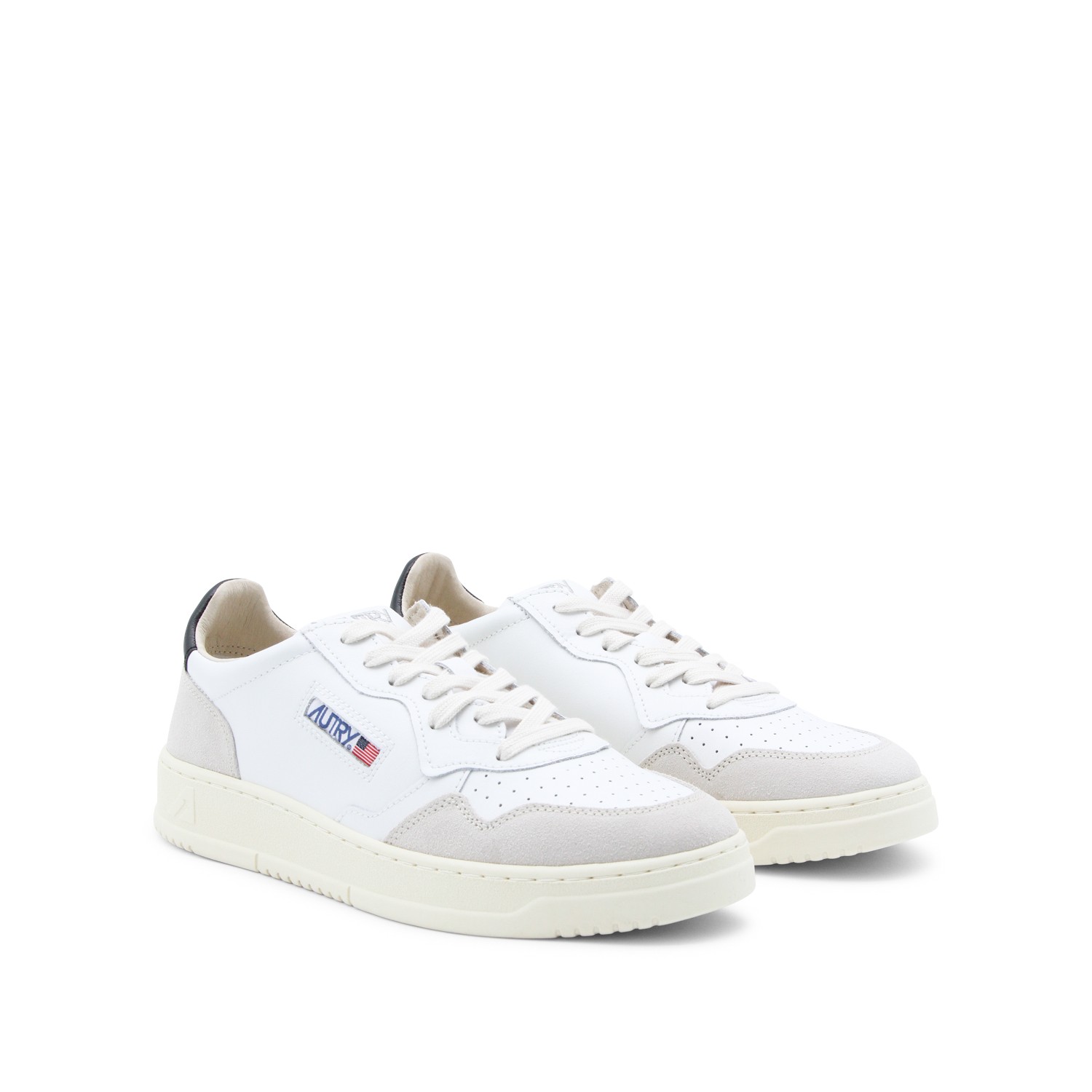 White and black leather and suede Medalist sneakers from Autry featuring round toe, rubber sole, cotton laces, contrasting details and logo label at front.