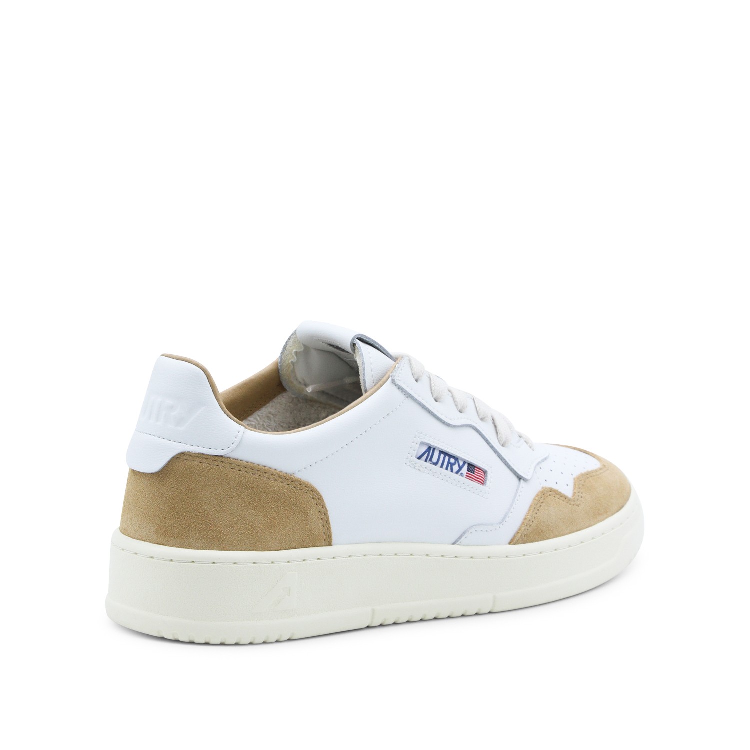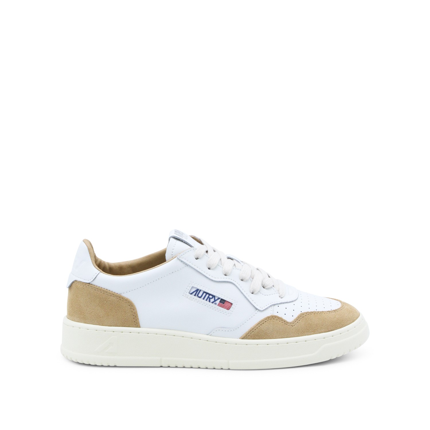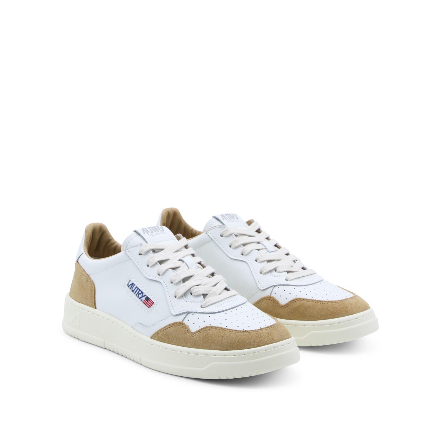 White and beige sneakers from Autry feaaturing round toe, laces fastening, leather sole and lateral logo patch.