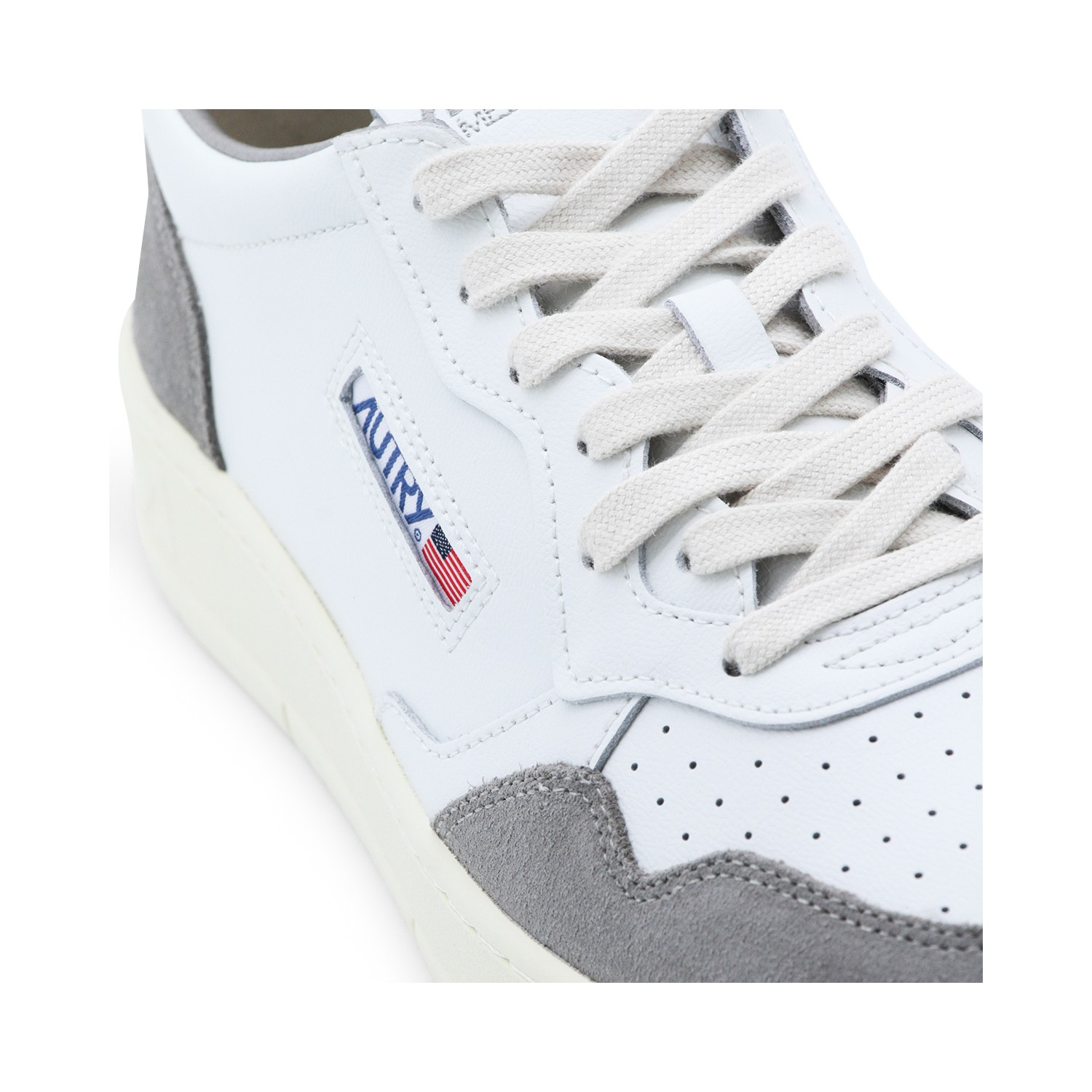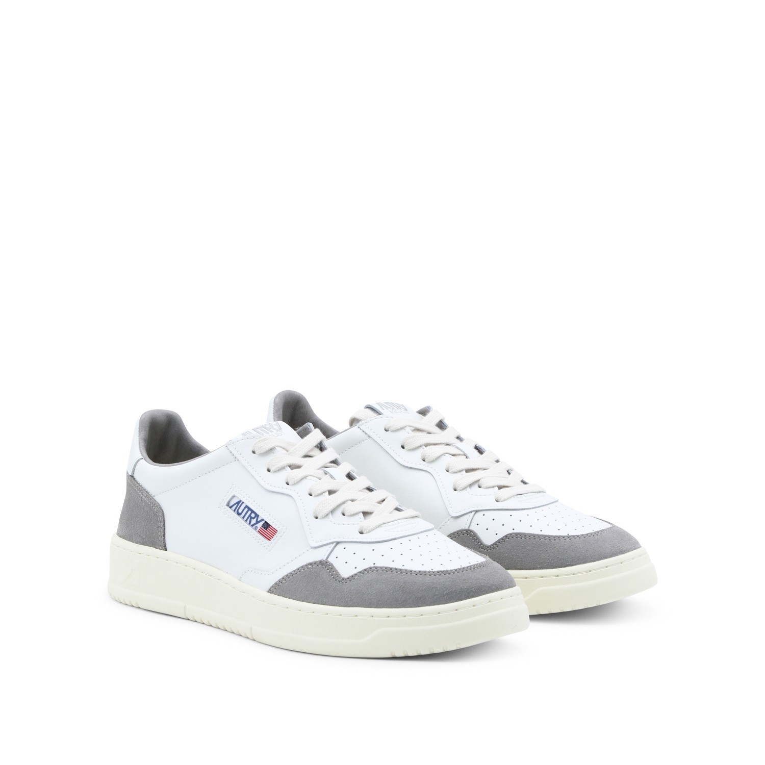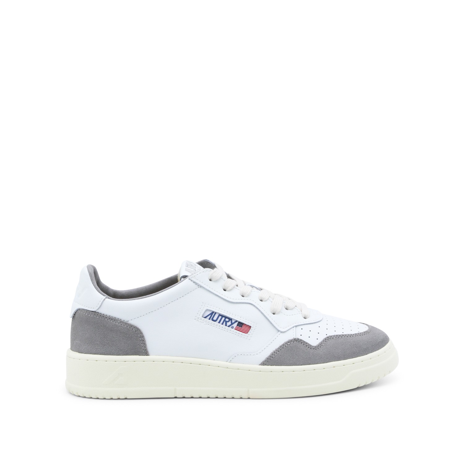 White and grey sneakers from Autry feaaturing round toe, laces fastening, leather sole and lateral logo patch.